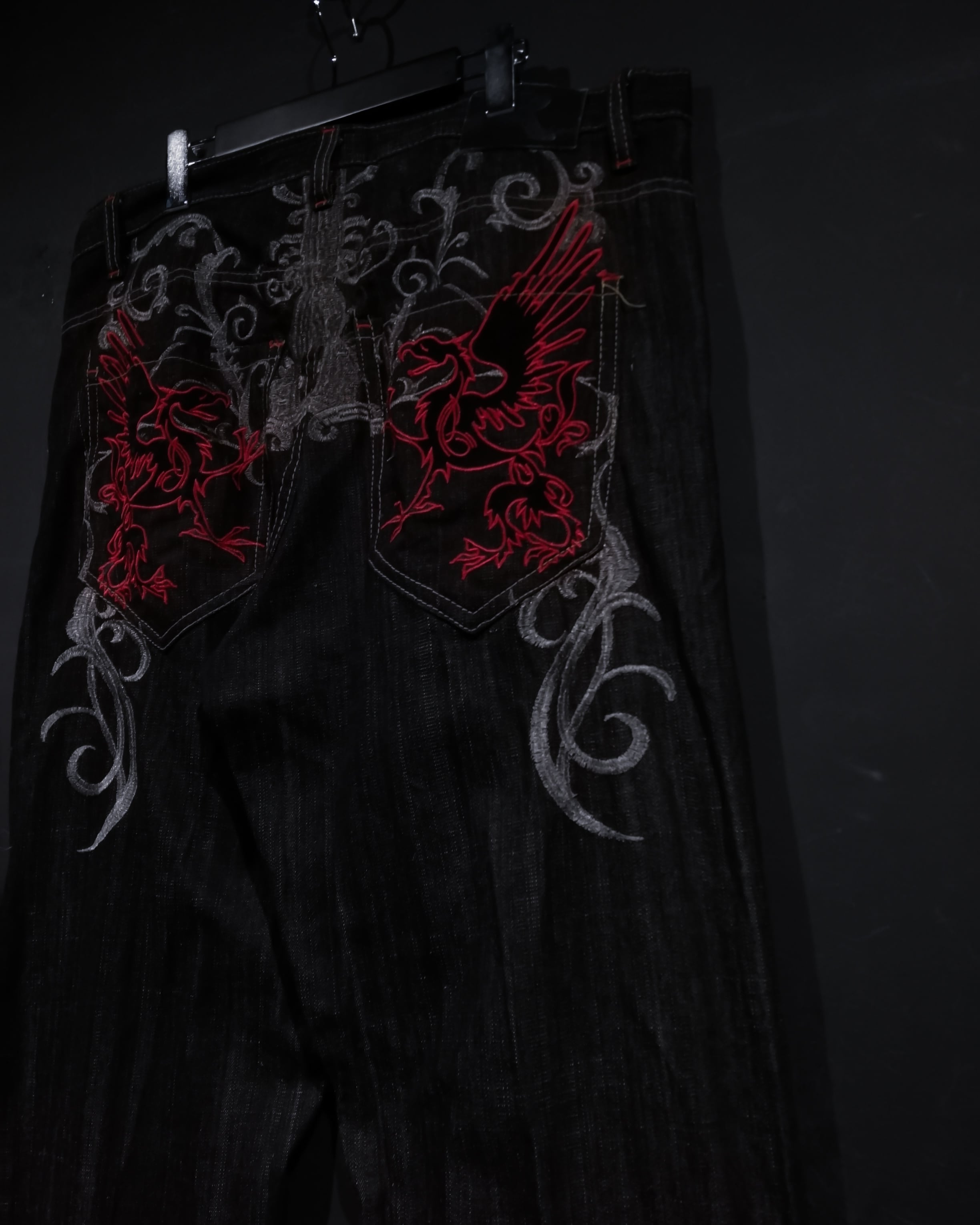 色が濃く残った、ヴィンテージでは稀少なブラックデニムのボディに、背面にBling-Blingな刺繍を刻んだバギーデニムパンツ。
