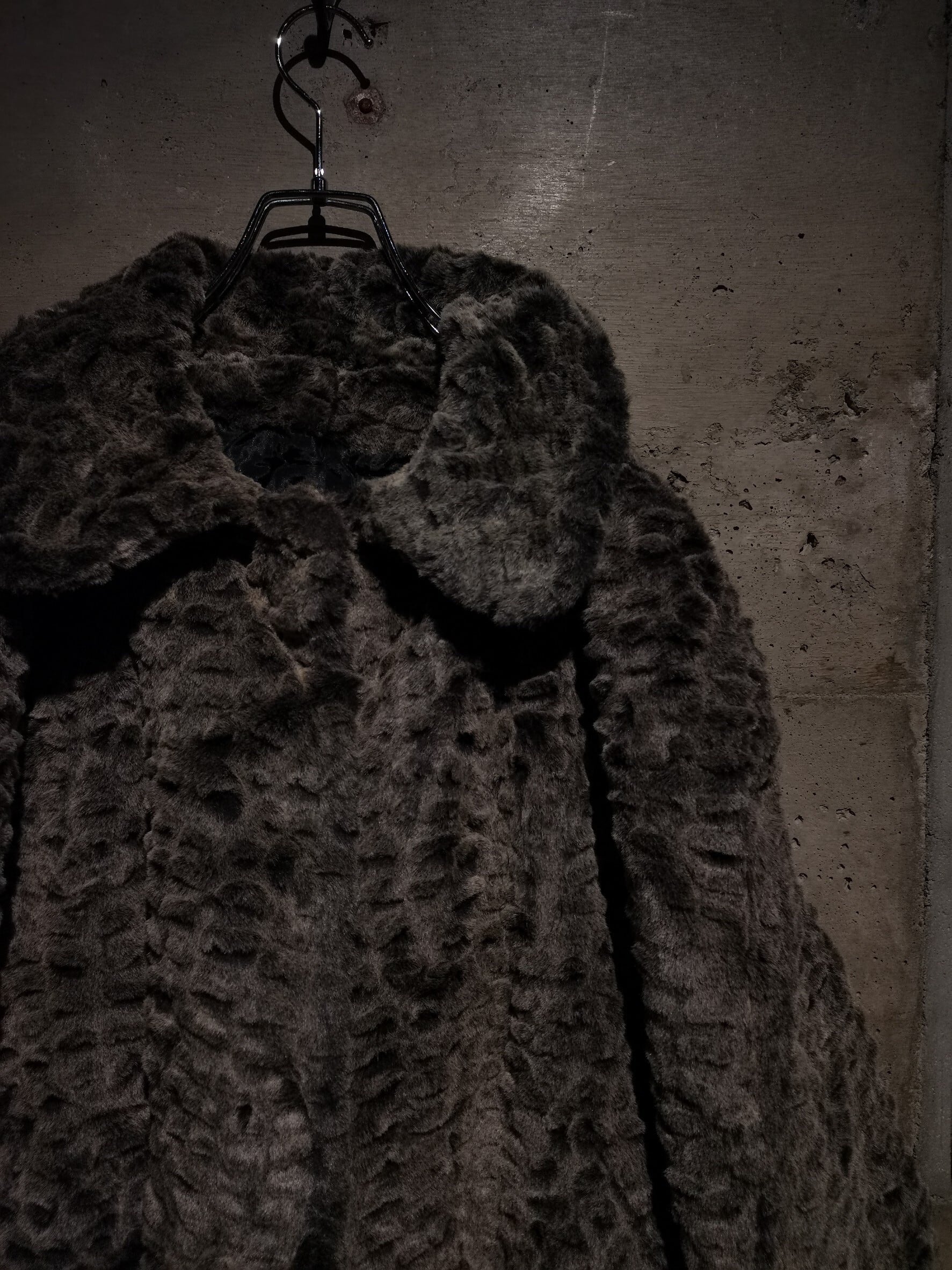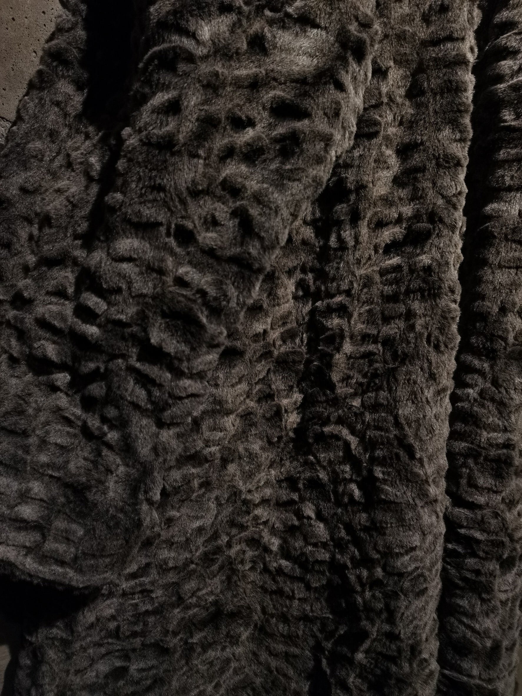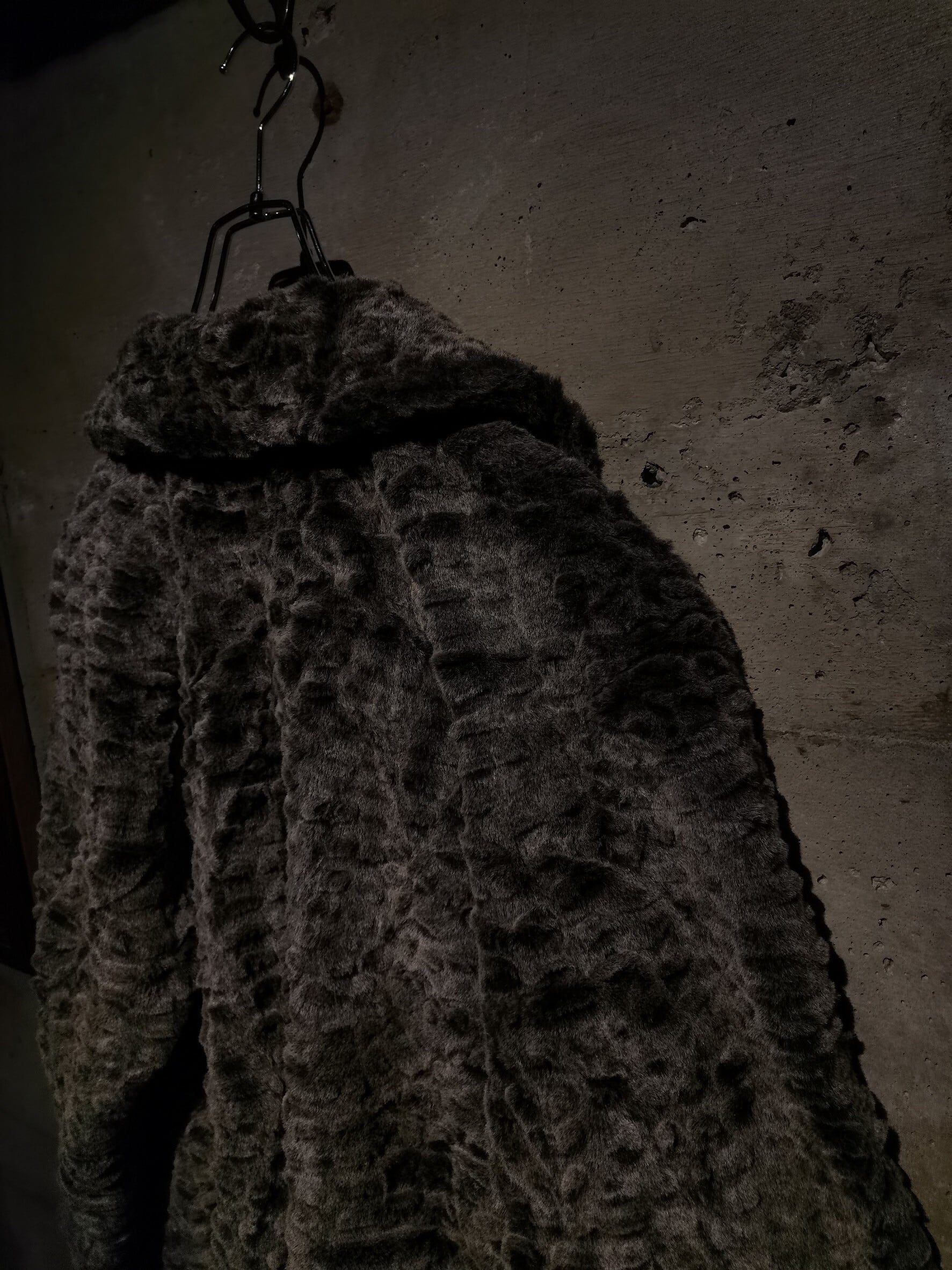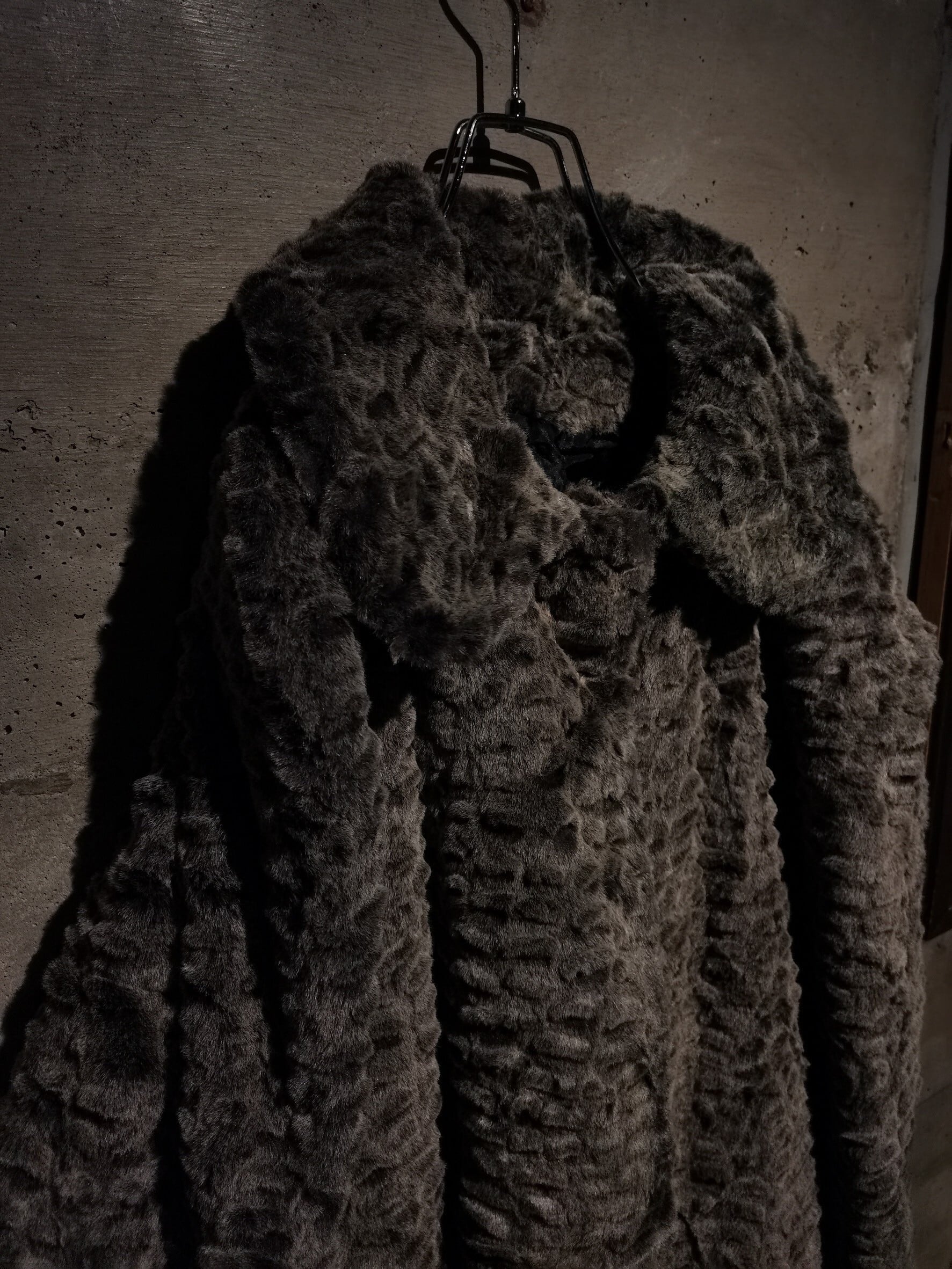 滑らかな毛足の、凹凸のある立体的なフェイクファーをボディに使用したフェイクファーコート。
