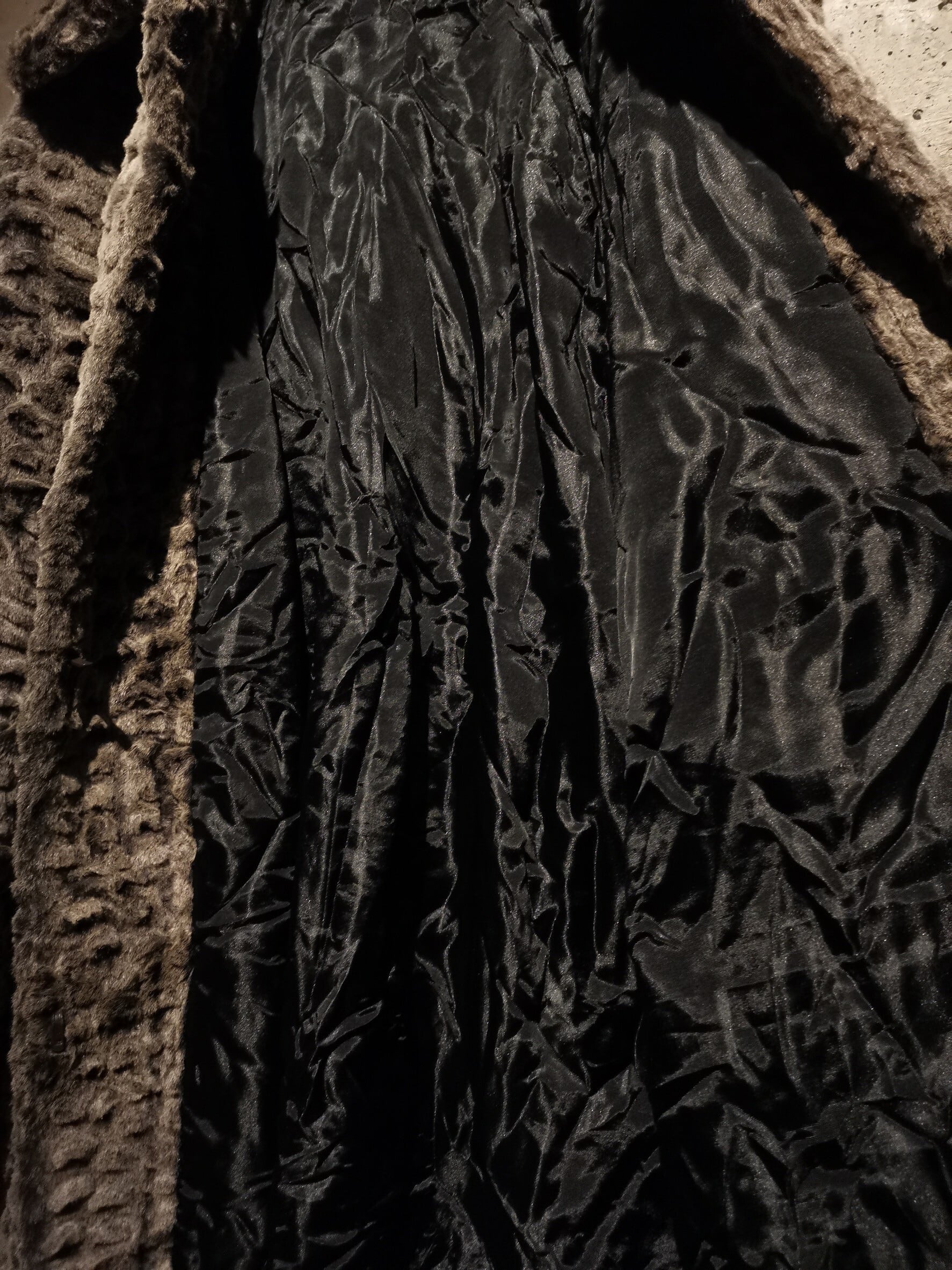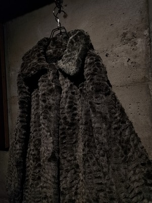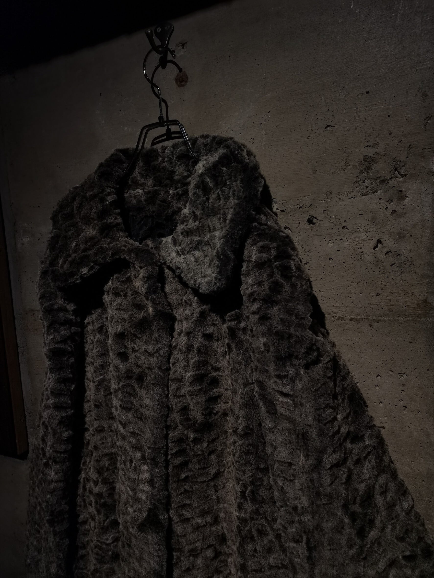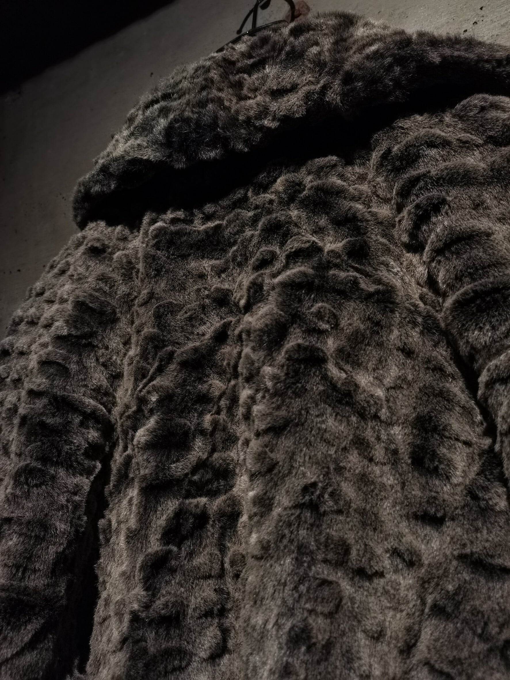 滑らかな毛足の、凹凸のある立体的なフェイクファーをボディに使用したフェイクファーコート。