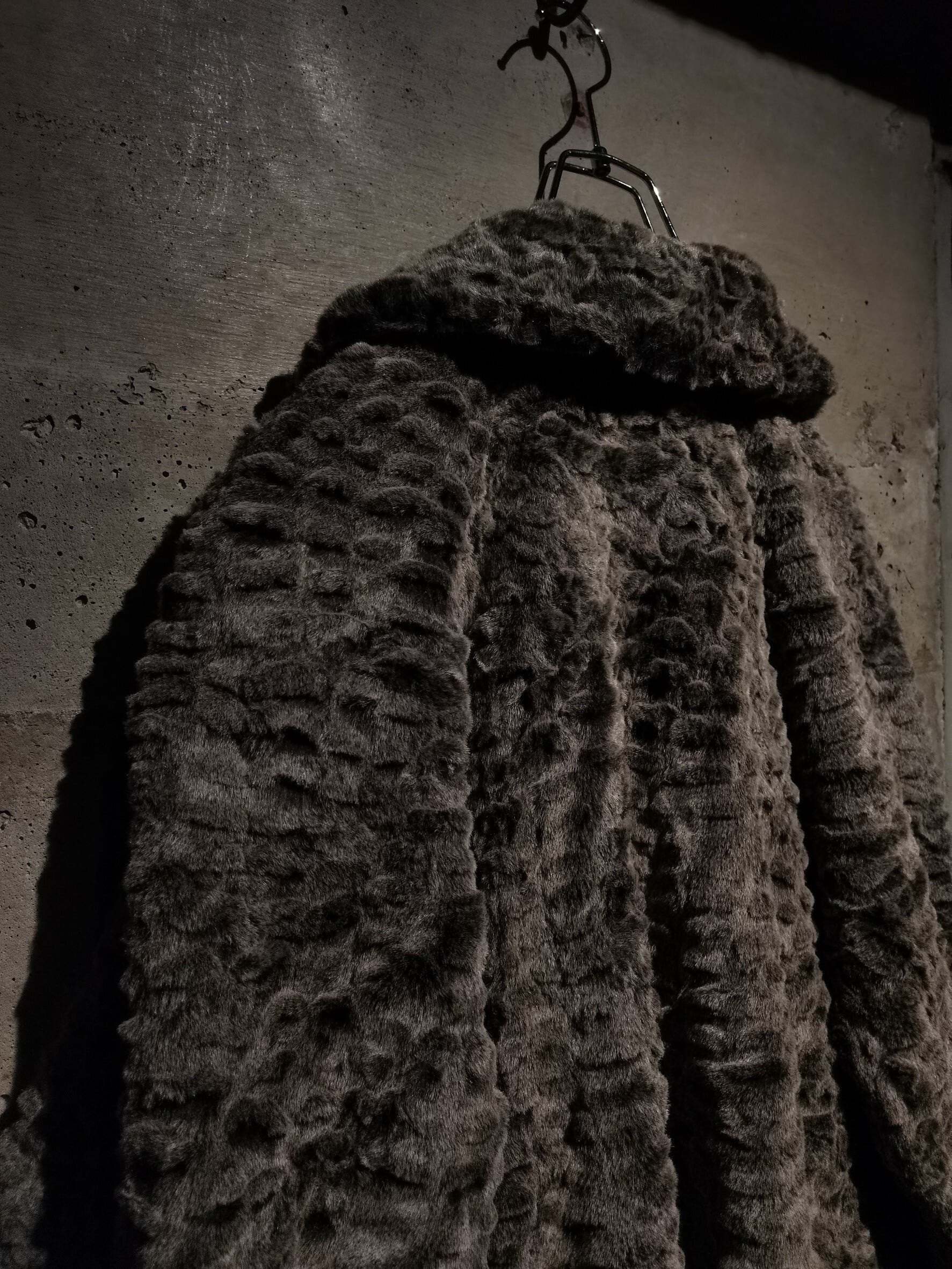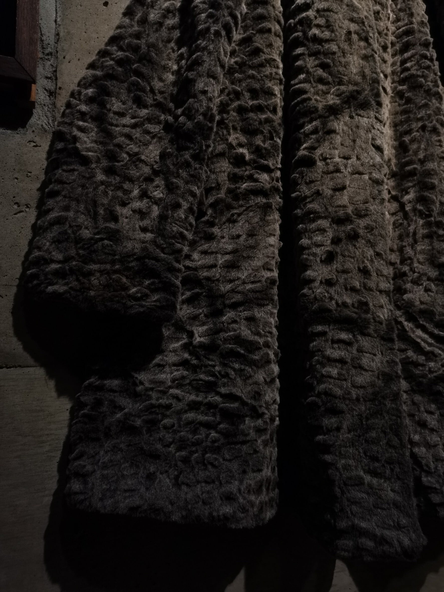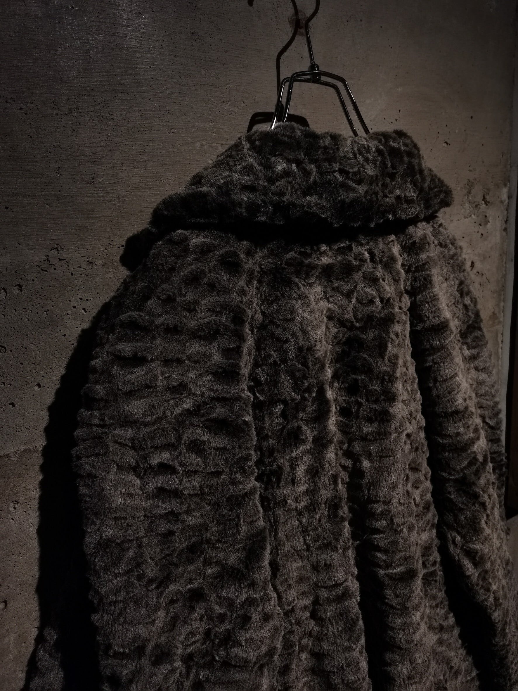 独特な凹凸が施されたフェイクファーの質感に加え、カラーリングやミニマルなディテール、そして美しいAラインシルエットが掛け合わさることで生み出された、非常にファッショナブルな逸品となっております。