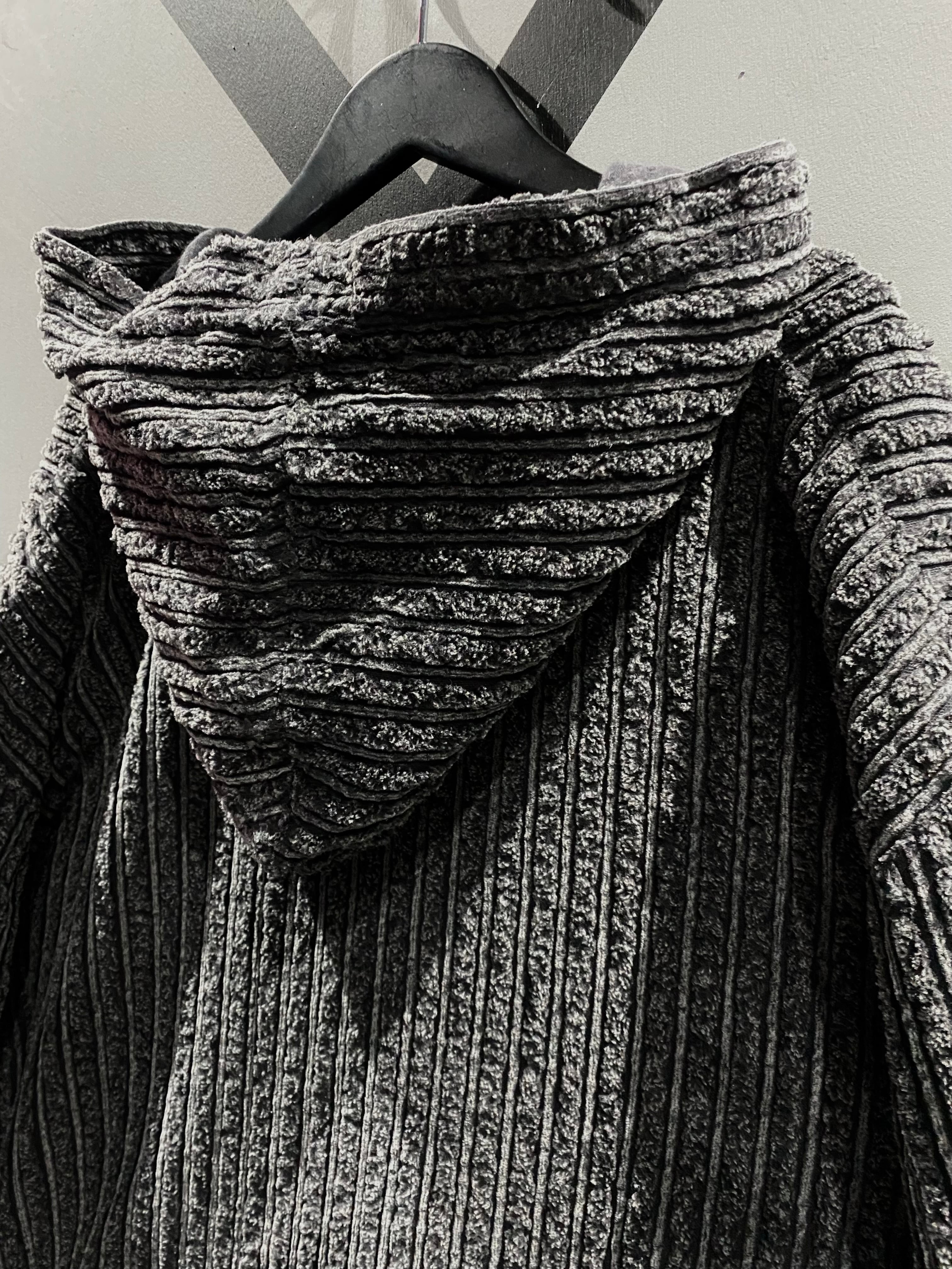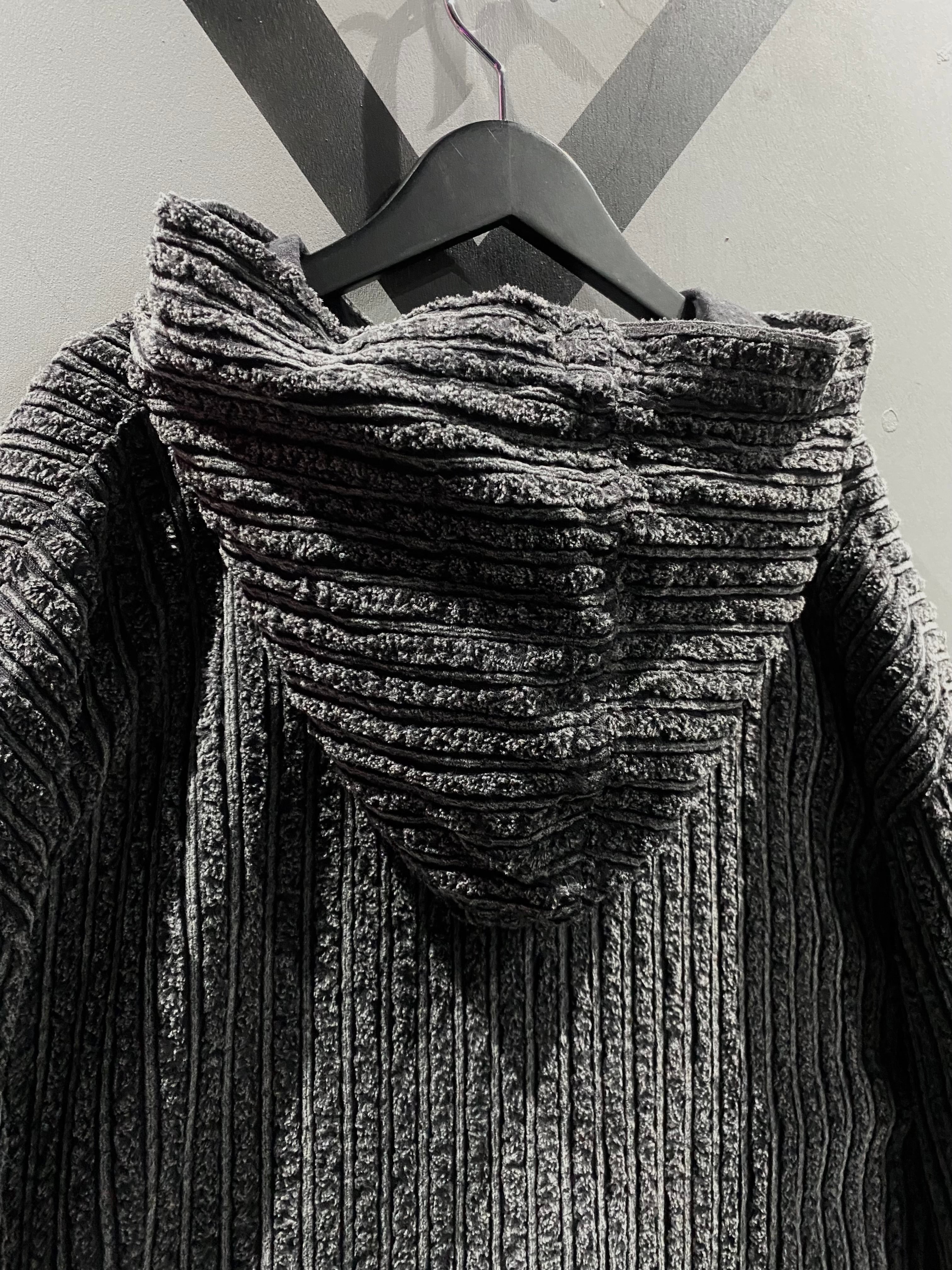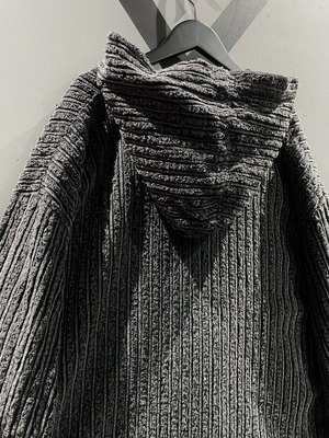 落ち着いたグレーカラーで纏められたニット生地を用いて、フーディジャケットに落とし込んだ1着。