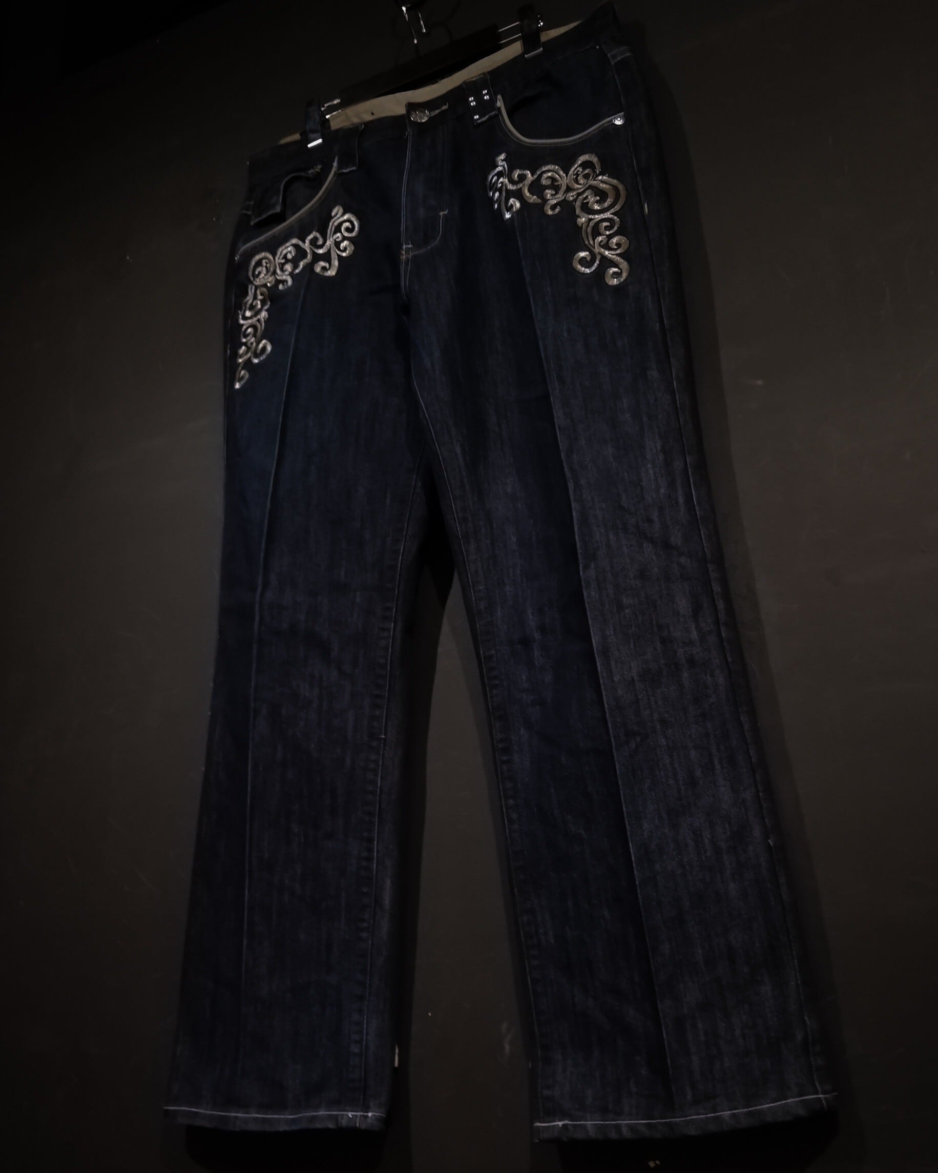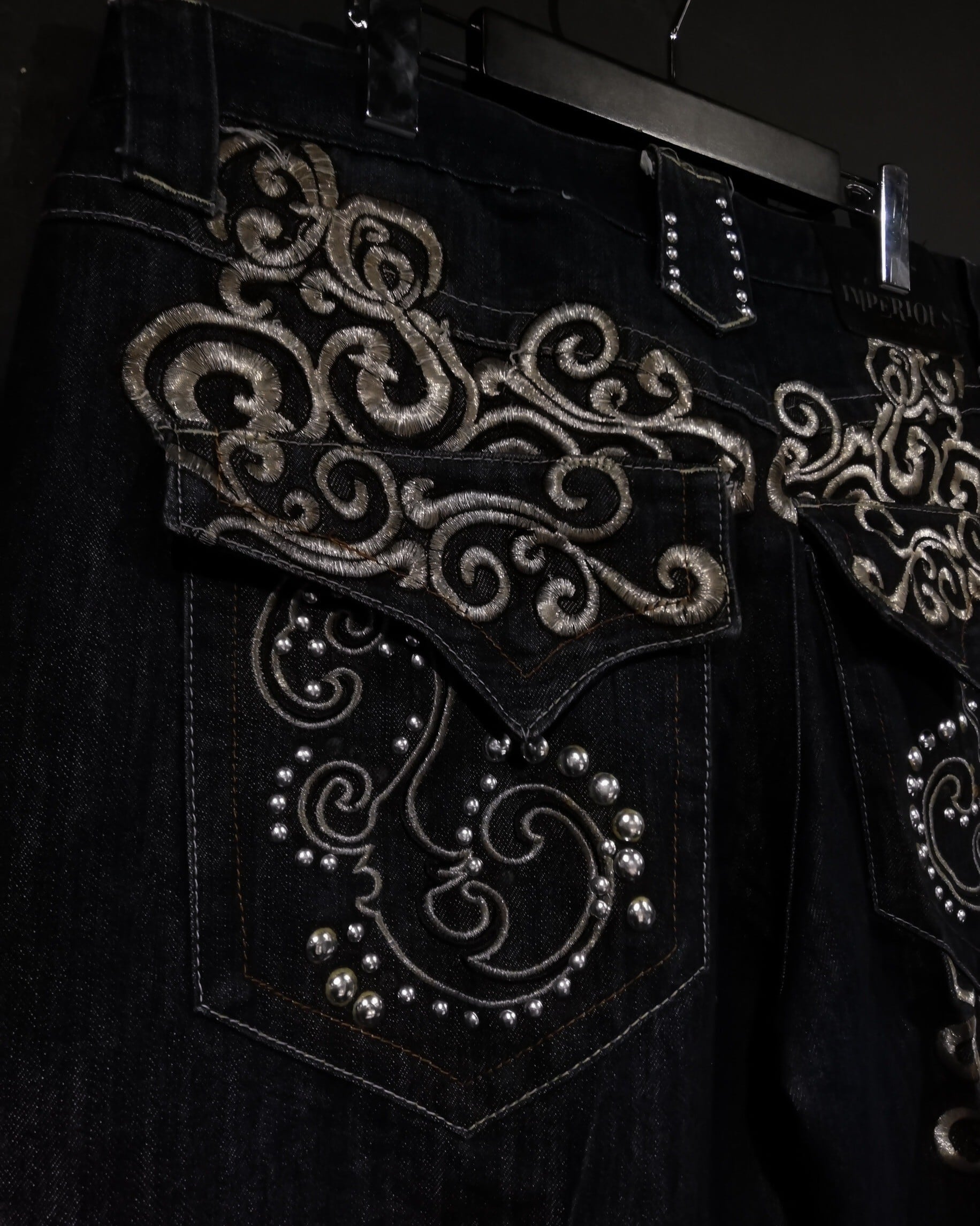 フロントバック共に大胆に施した刺繍に加え、バックポケットやベルトループにはスタッズを打ち込み、Bling-Blingな表情を見せるスペシャルな1本。