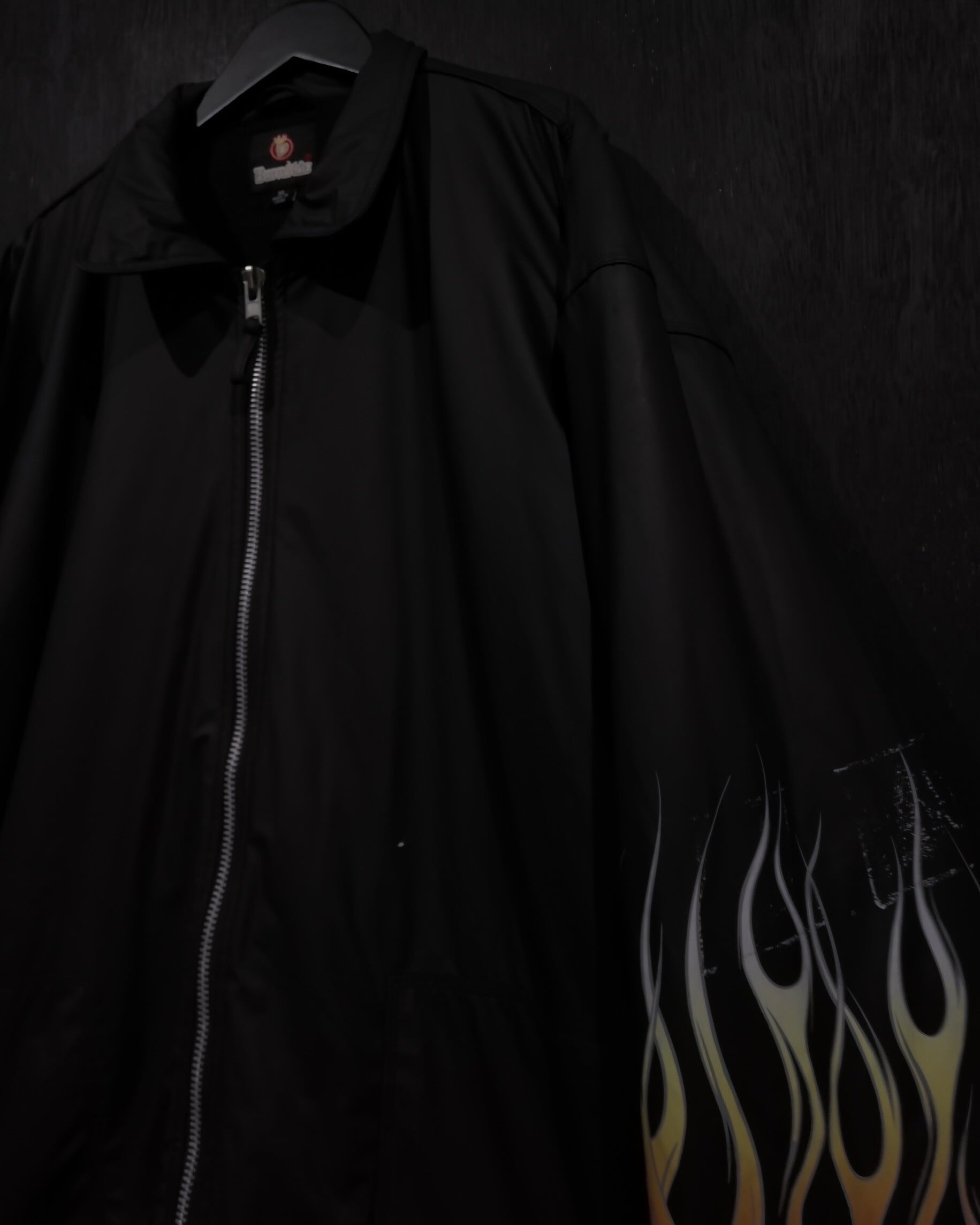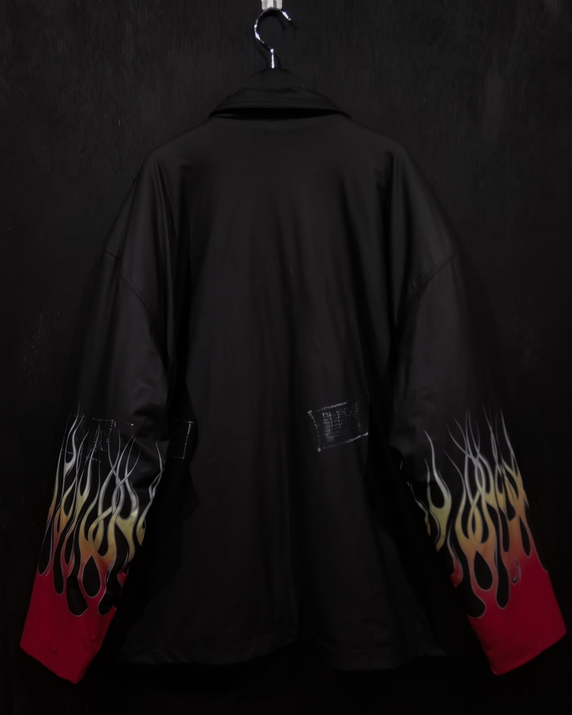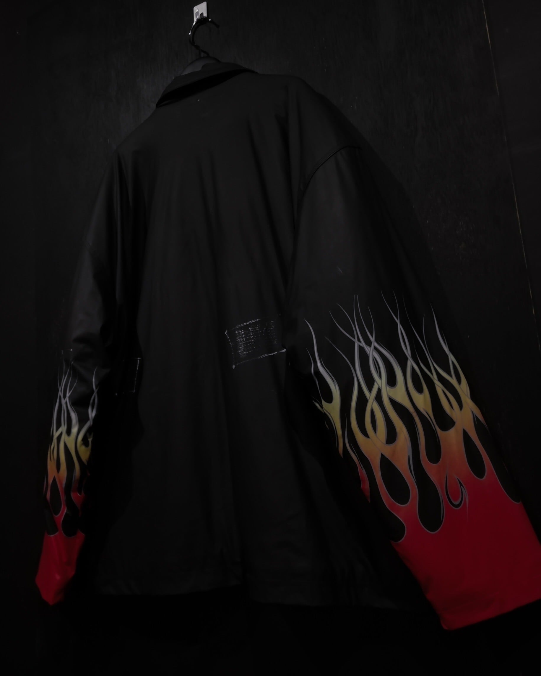 フェードの効いたブラックのラバーボディにファイヤーパターンを載せた稀有な素材感のジャケット。