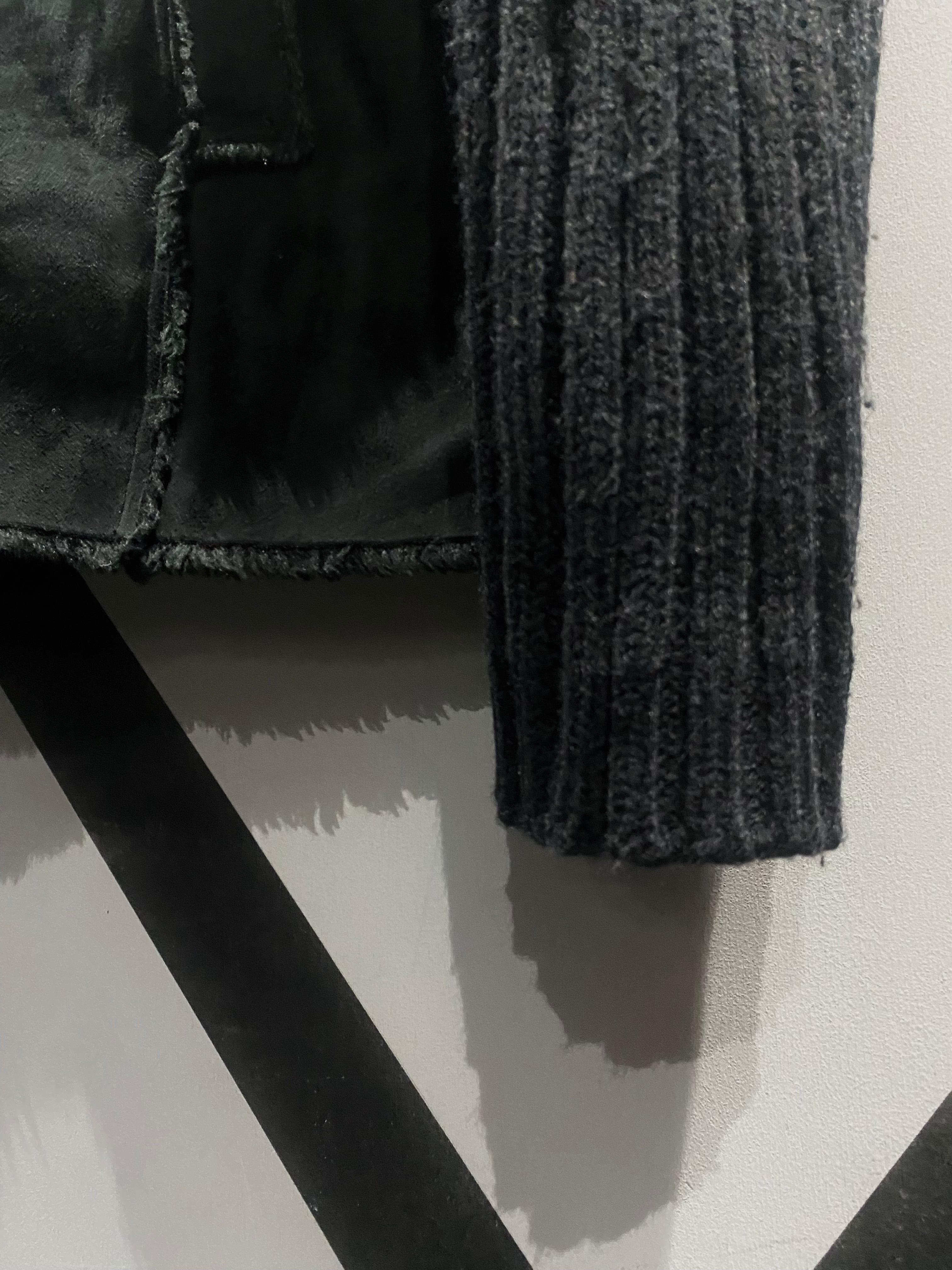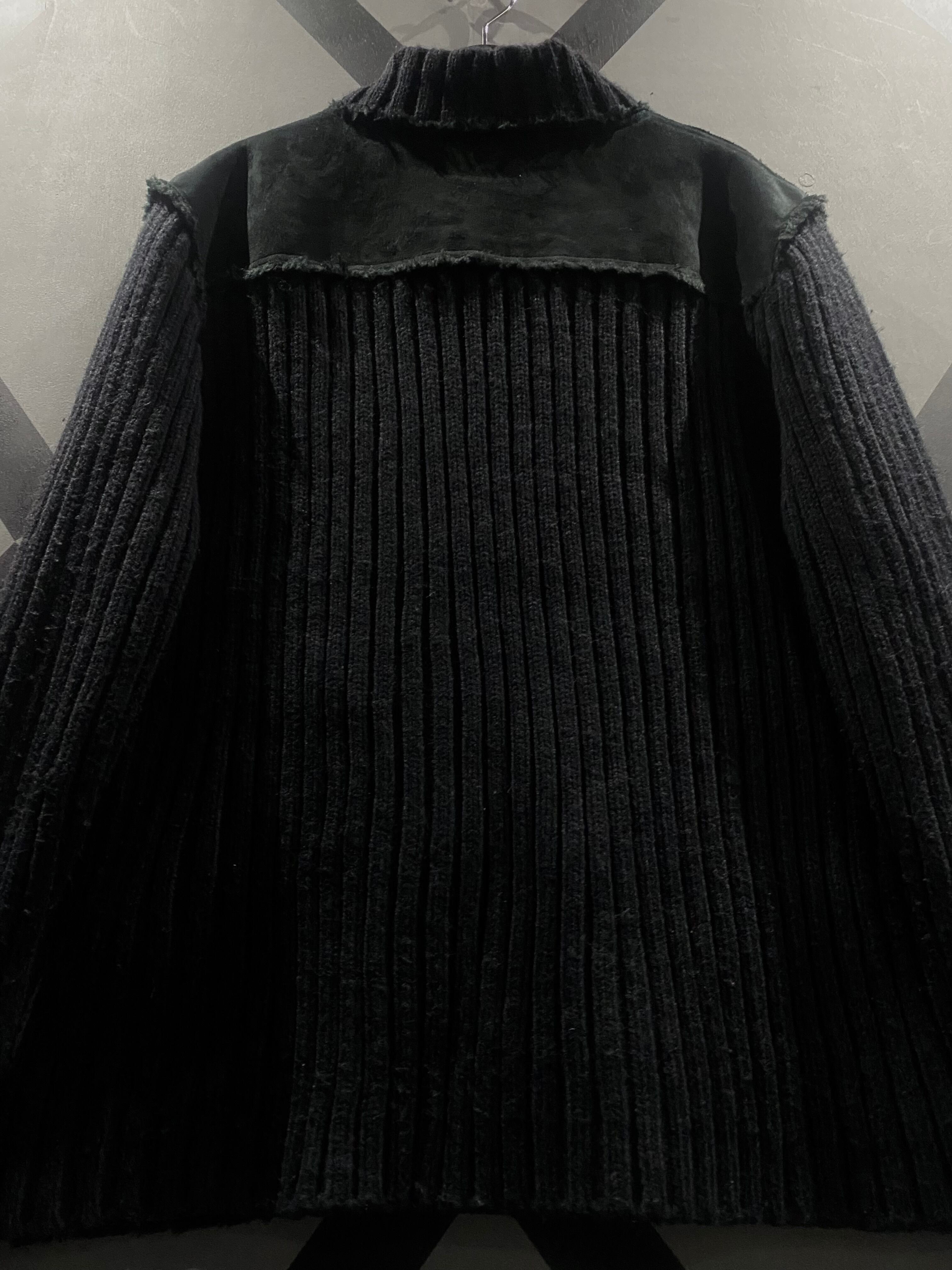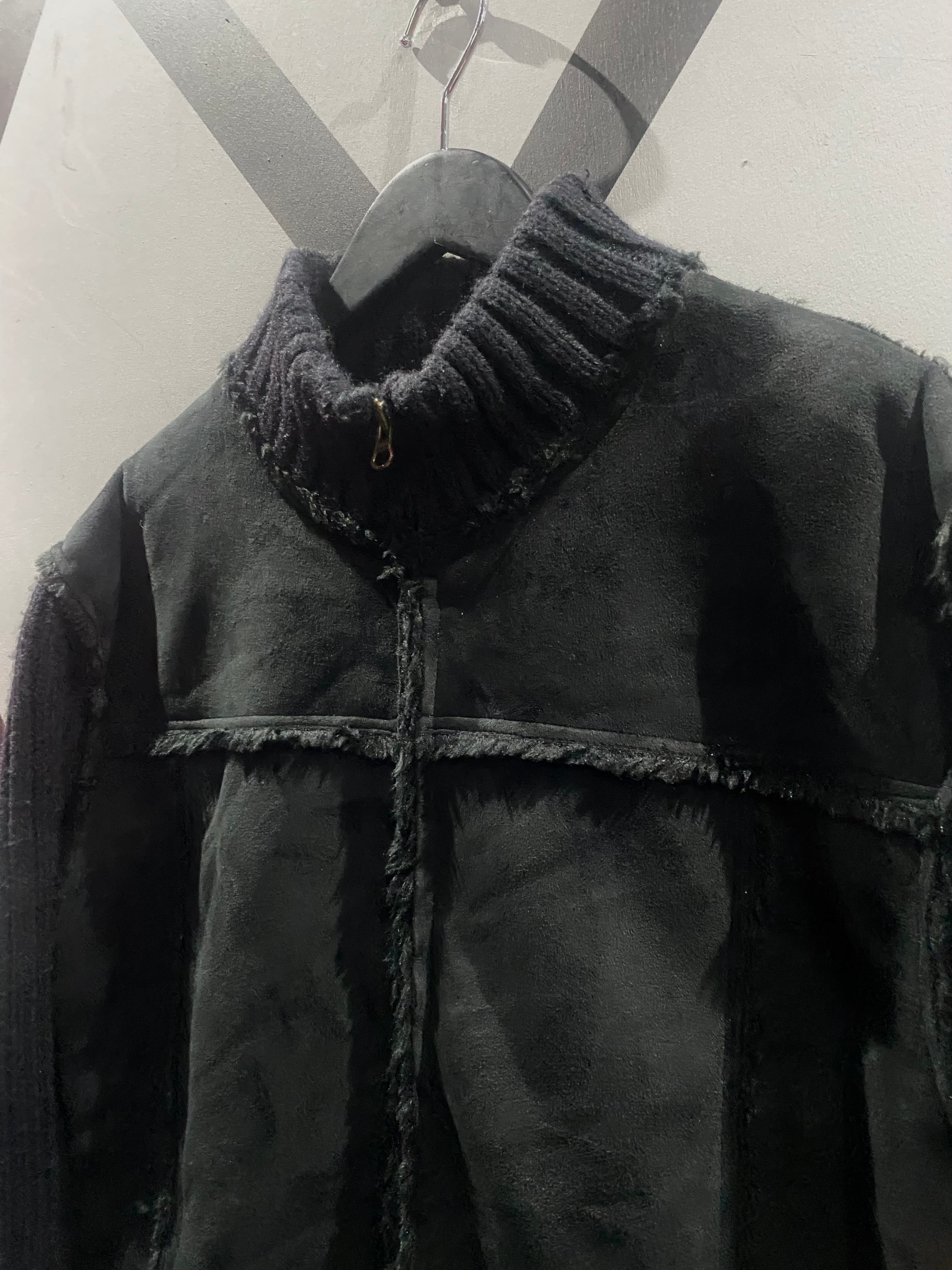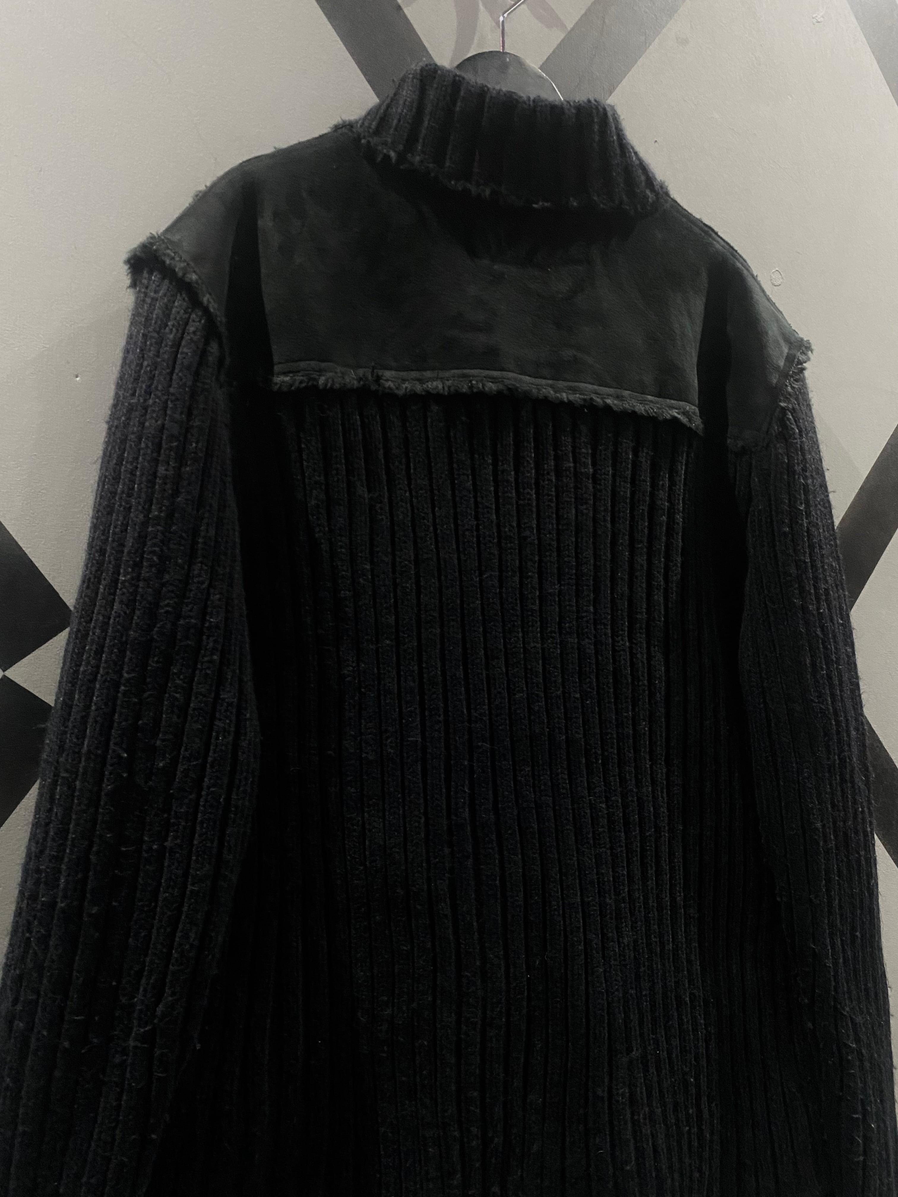 伸縮性のあるリブニットをベースに、身頃にフェイクムートンを切り替えた、いわゆるドライバーズ型のニットジャケット。