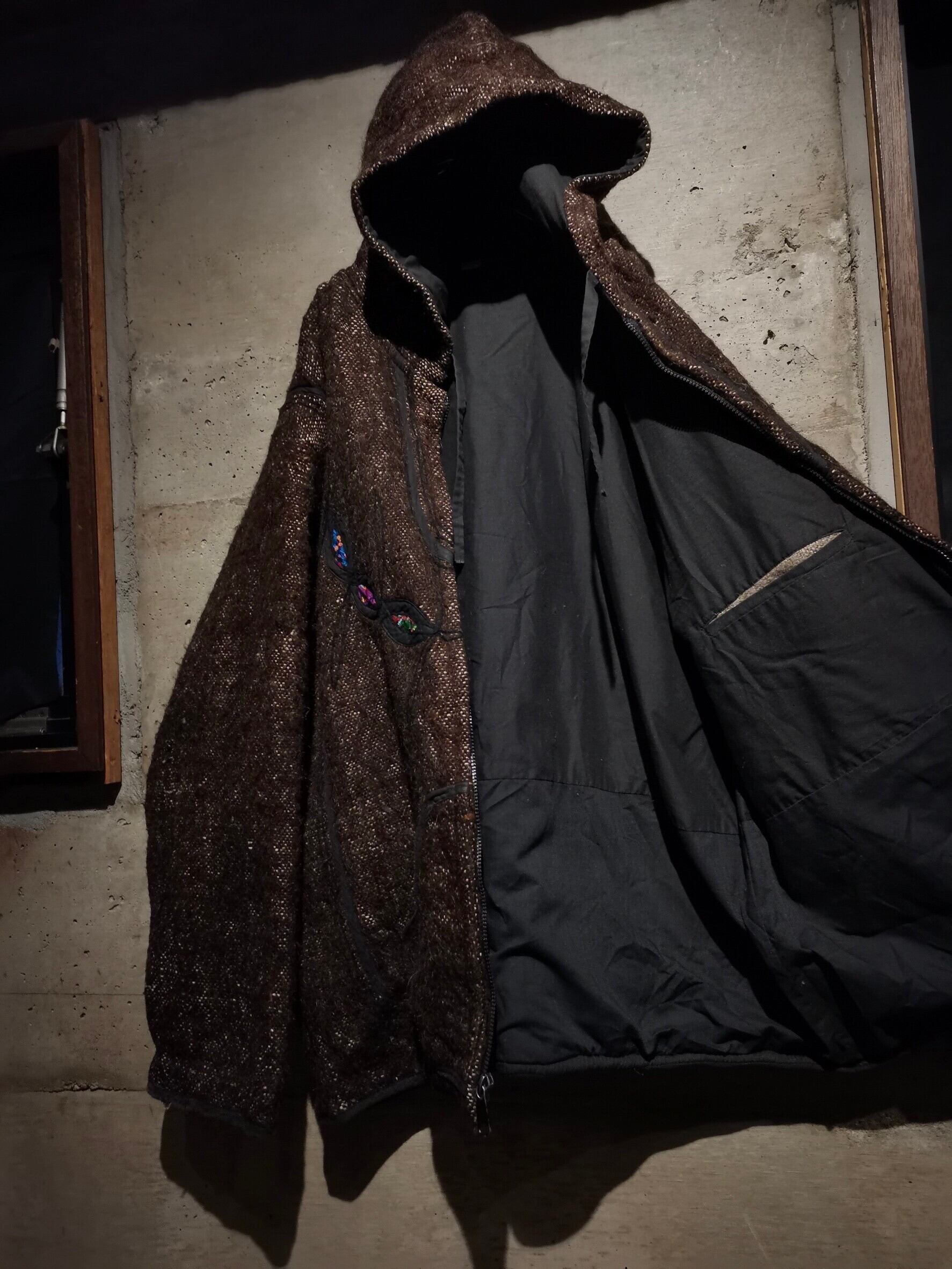 ブラウンをベースとした肉感のあるボディに、グアテマラ地方の伝統的なテキスタイルを用いたアップリケを載せたフーディージャケット。