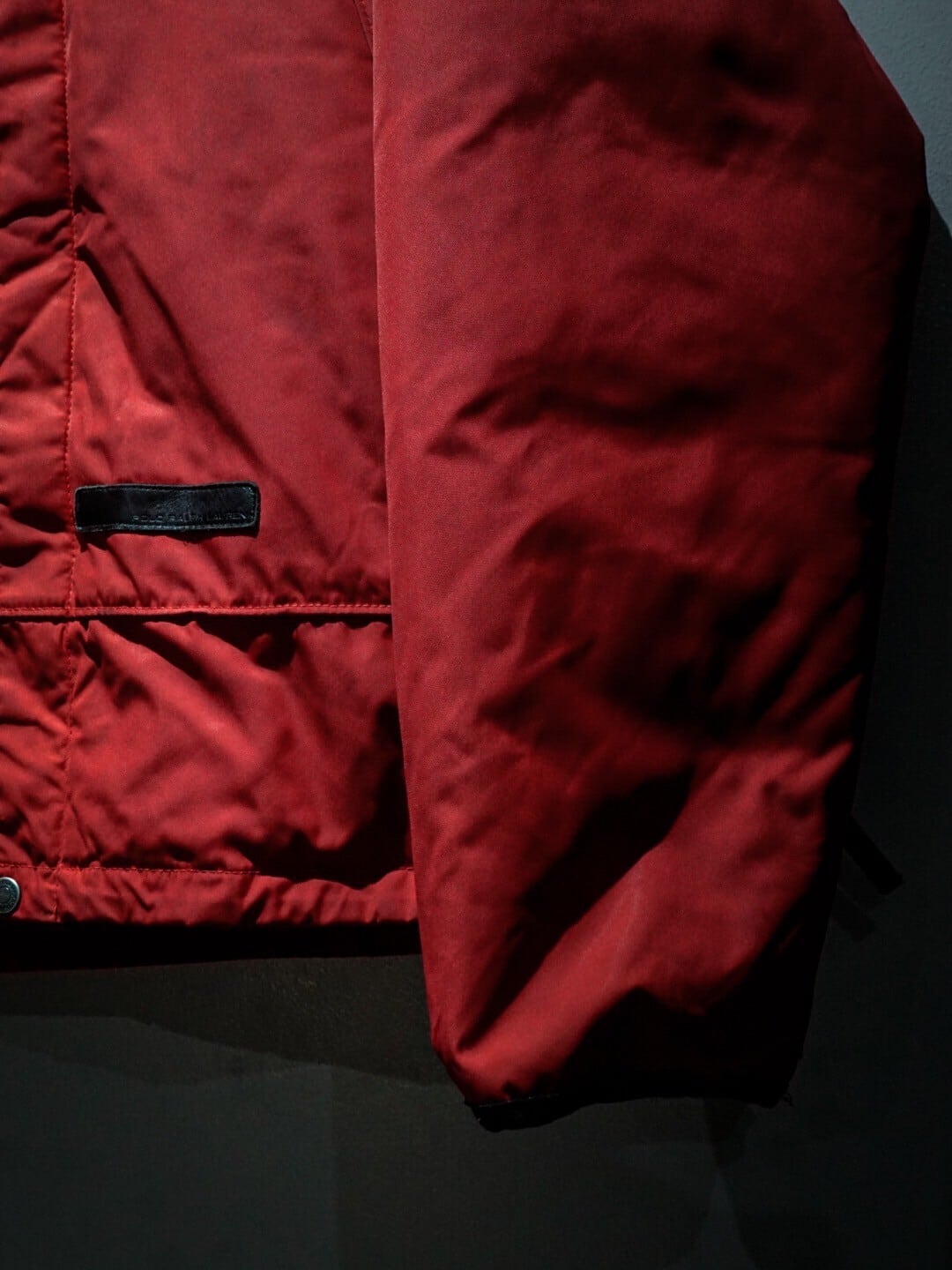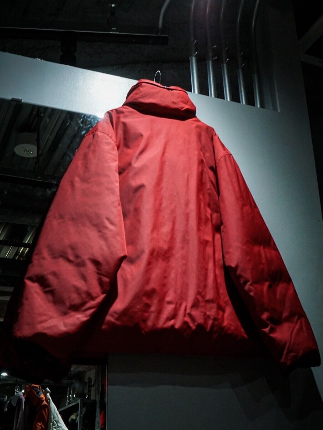 真紅のボディをベースに、左裾付近にブランドネームを刻んだレザーパッチを載せたダウンジャケット。