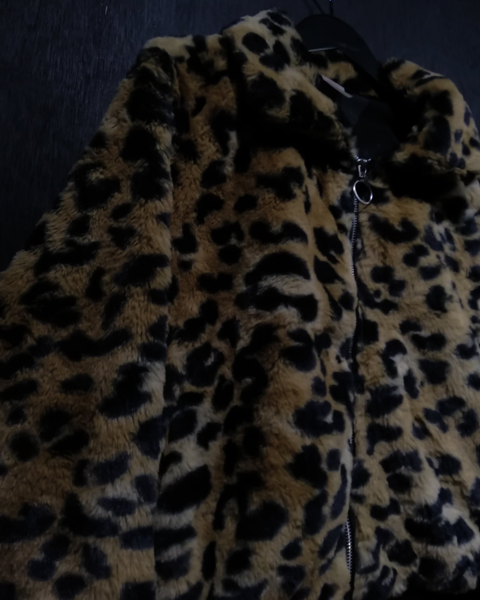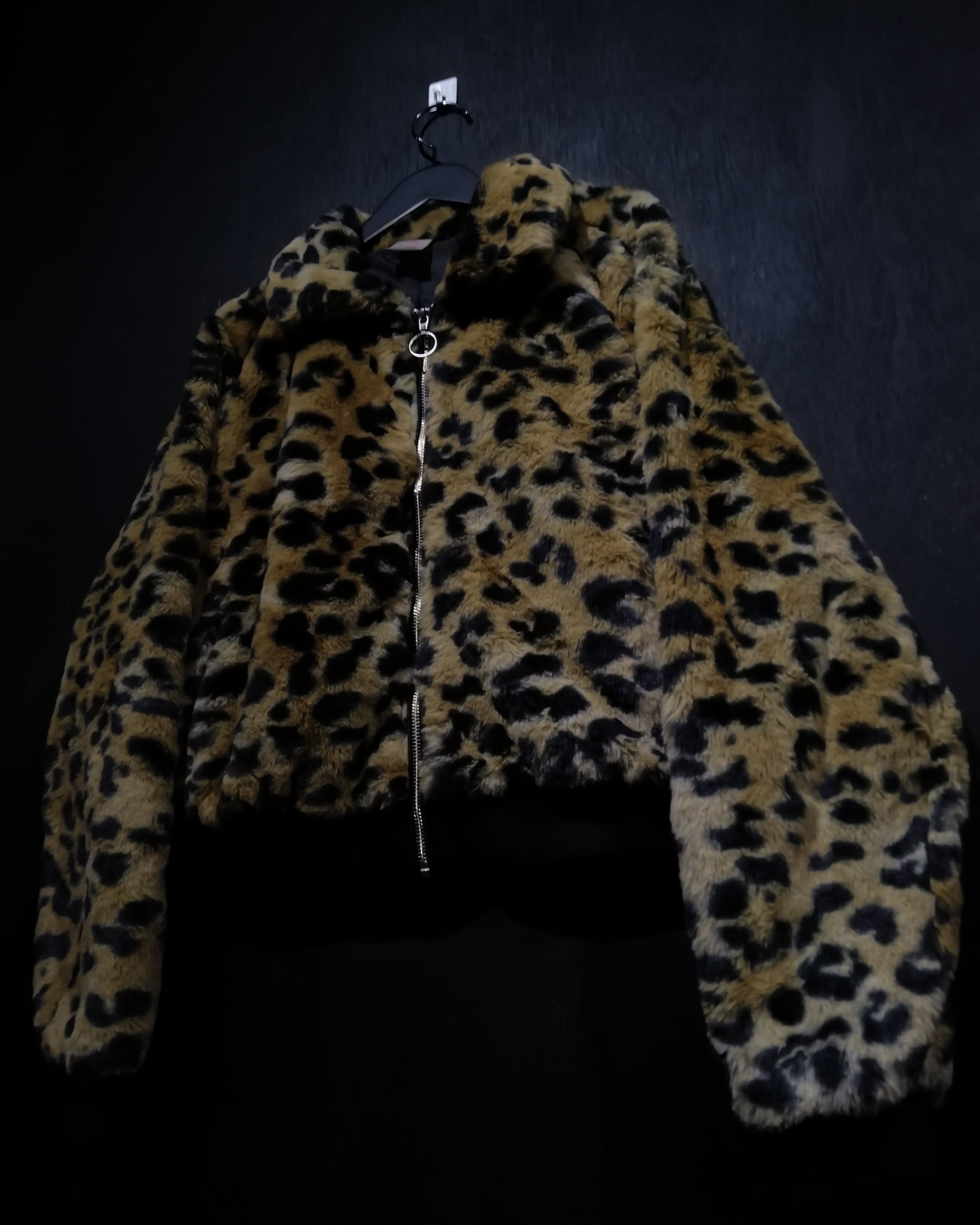 フワッと柔らかなエコファー素材を用いたボディに、レオパード柄を載せたジップアップファージャケット。