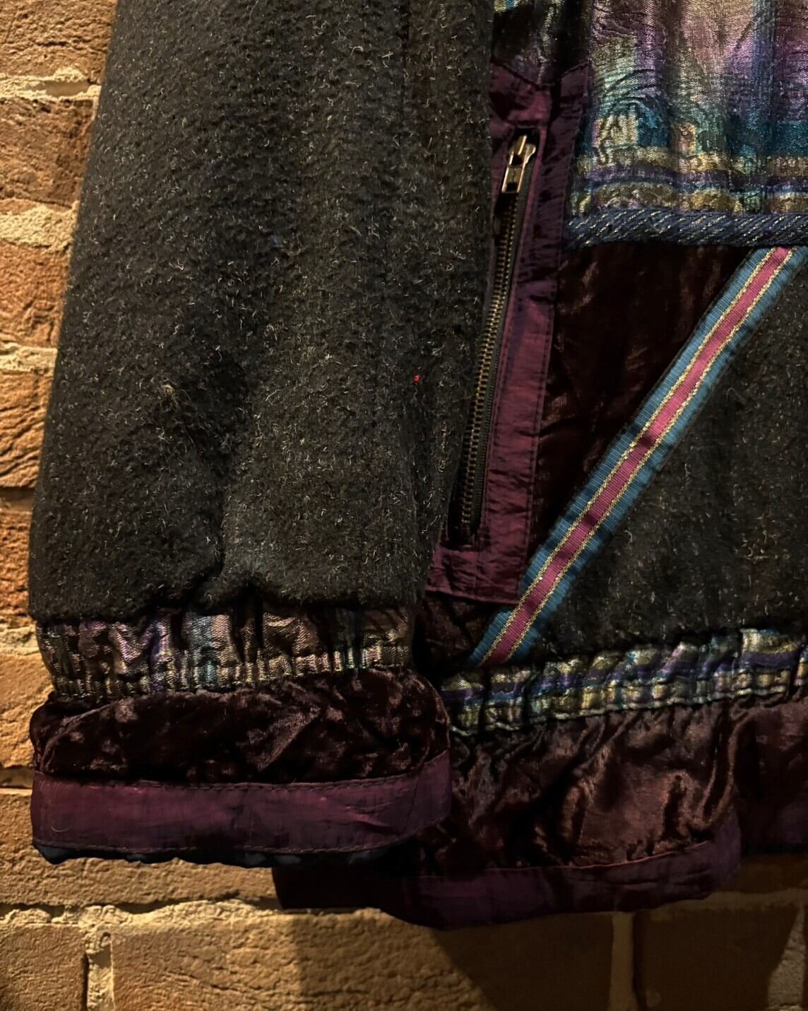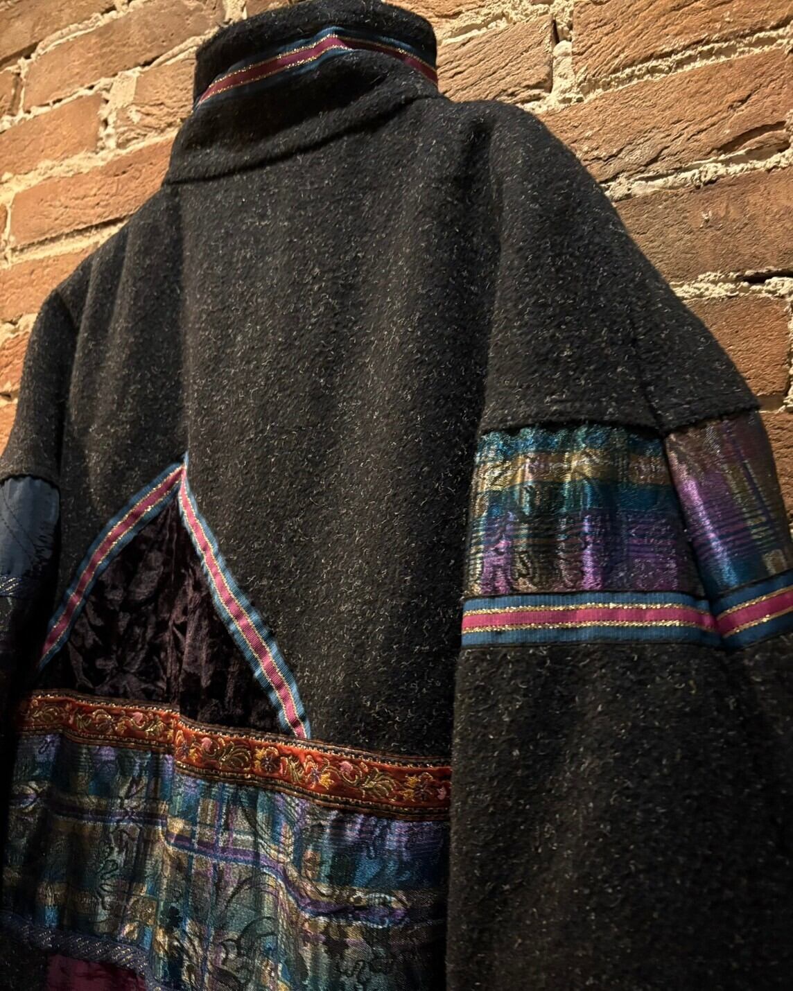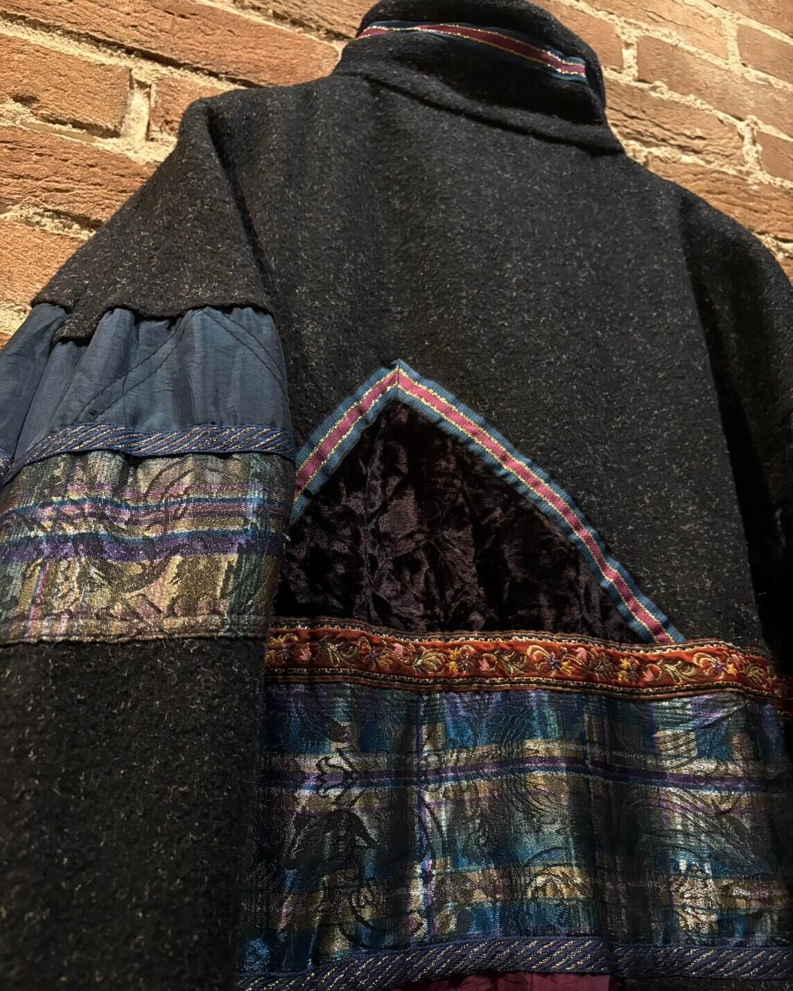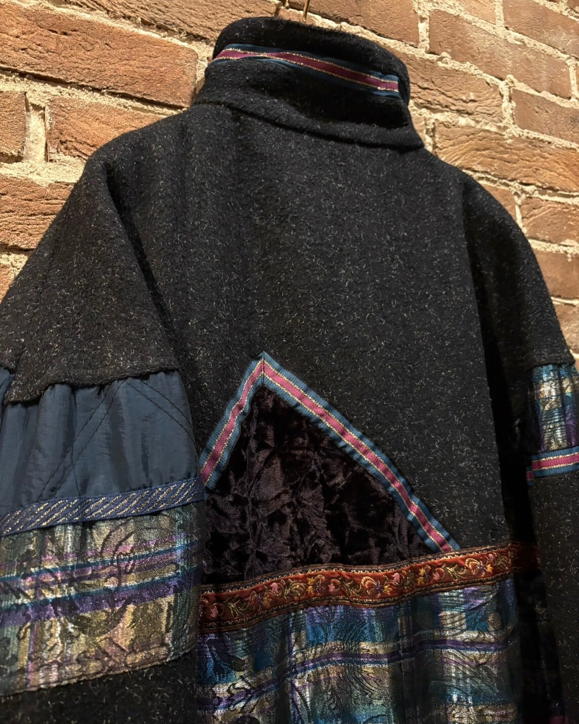 白糸を混ぜ起毛感を持たせたウールのボディをベースに、光沢のある素材でチェック柄を載せ、その上からボタニカルなデザインを刻み込んだ切り替え。さらに、ブラウンのベロアやライン状のテープを切り替えたマルチファブリックの稀有なデザイン性を持ち合わせた逸品。
