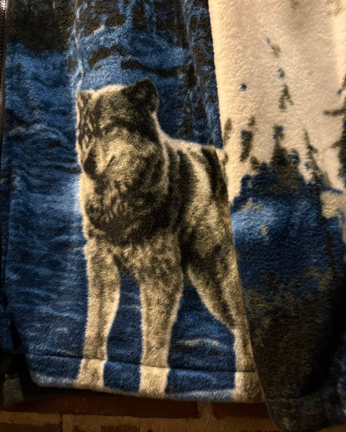 フワッと心地の良い軽く柔らかな毛足のボディに、フロントバック、袖にまでデザインを載せた全方位抜かりのないウルフのフリースジャケット。