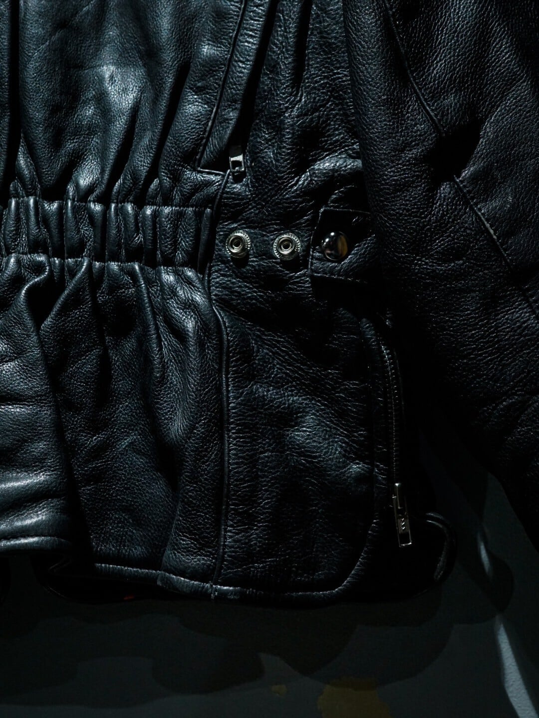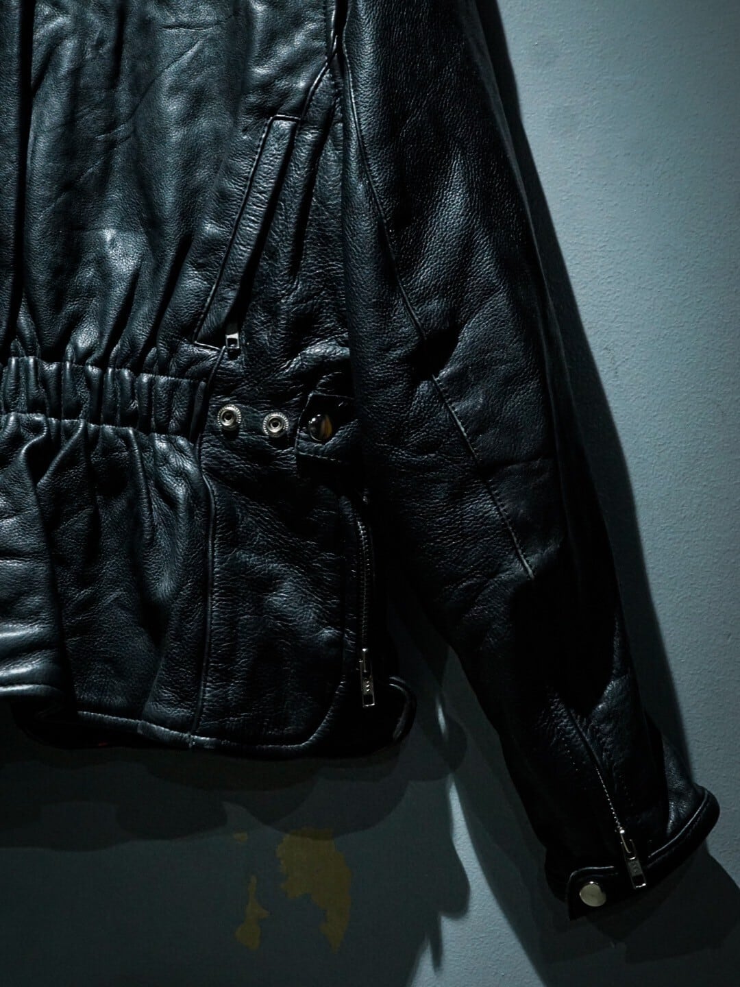 肩にはアクションプリーツ、背面にはギャザーが施されており、がっしりとしたレザーながら着心地も非常に良く、着用時のシルエットもめちゃくちゃ良いんです。