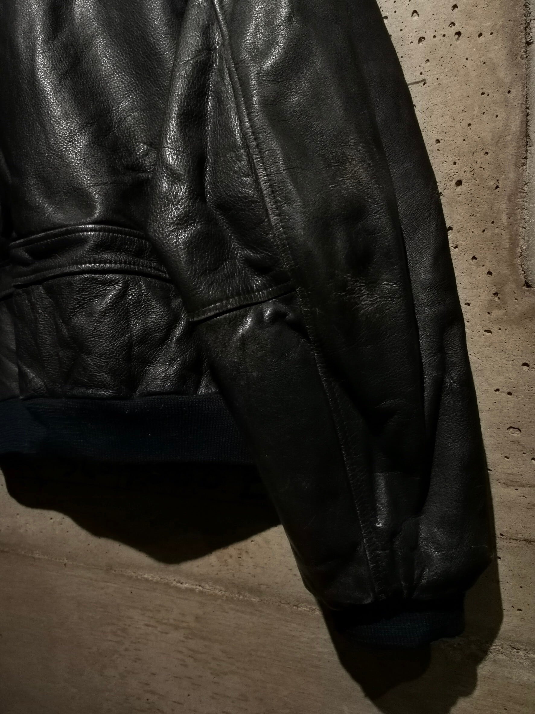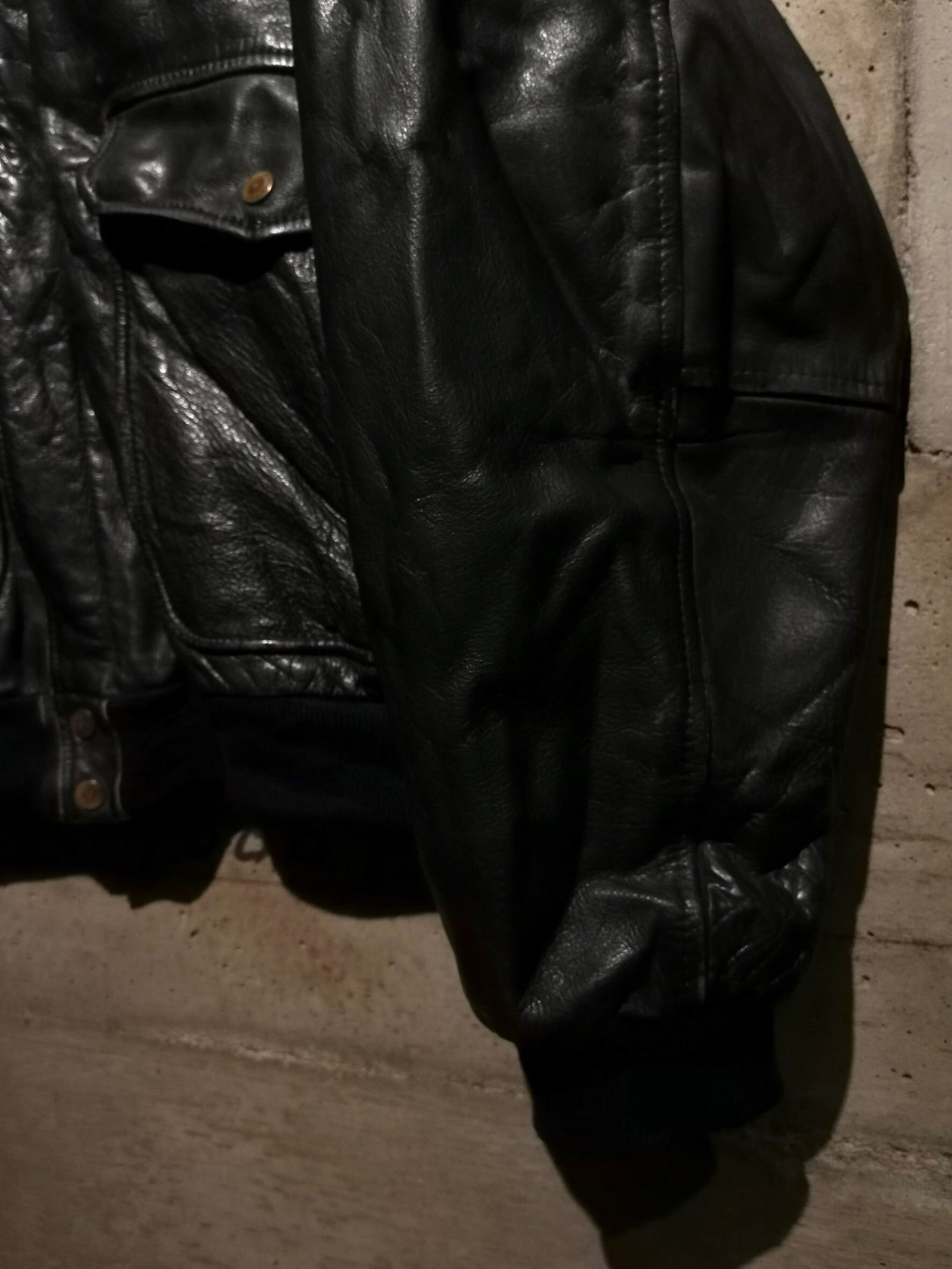 渋い雰囲気を漂わせる、深みのあるブラックのレザーを使用した、フライトジャケット型に落とし込まれたレザージャケット。