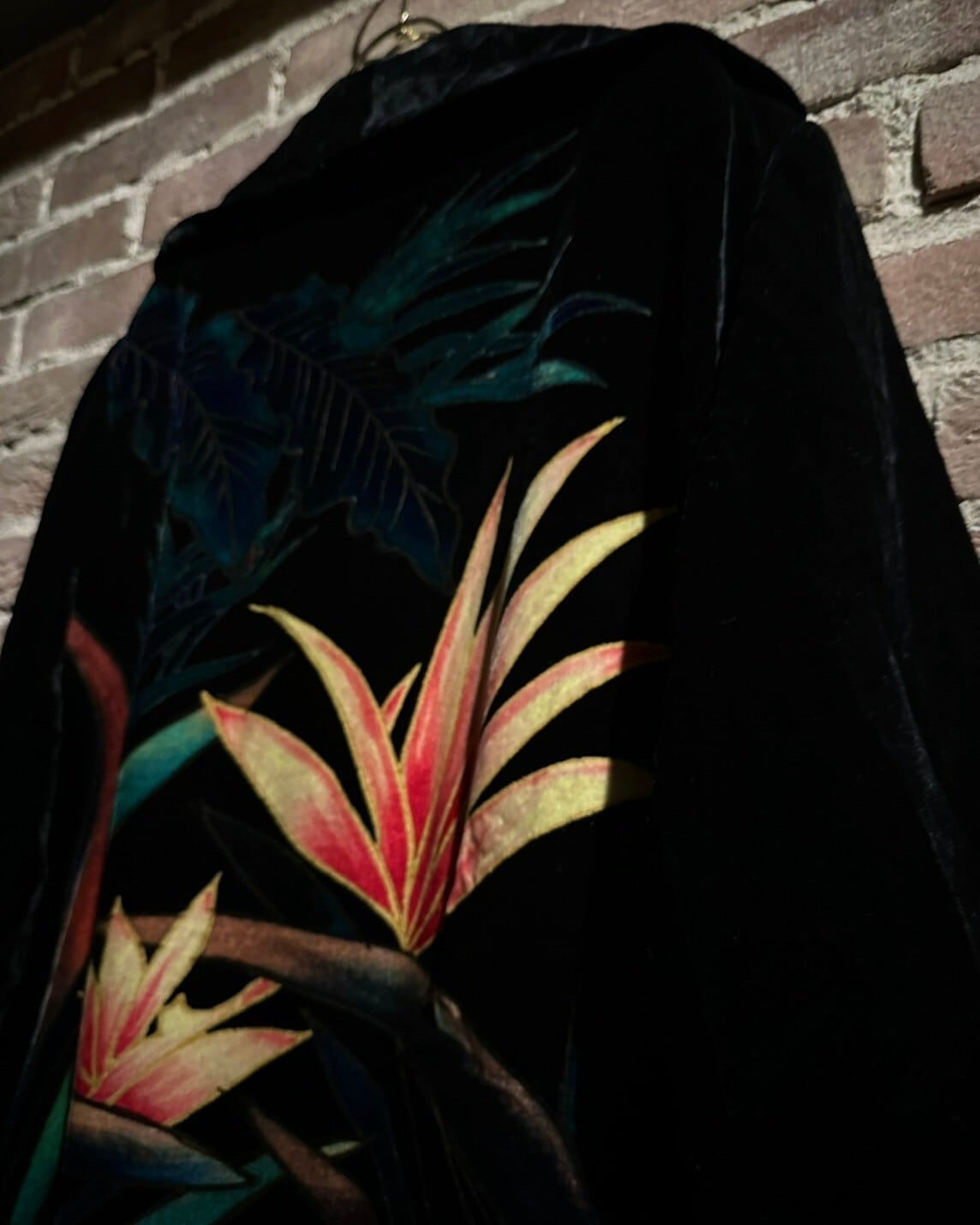 柔らかく滑らかなブラックベロアを用いたボディに、フロント、背面に花モチーフのデザインを落とし込んだ羽織り型のジャケット。