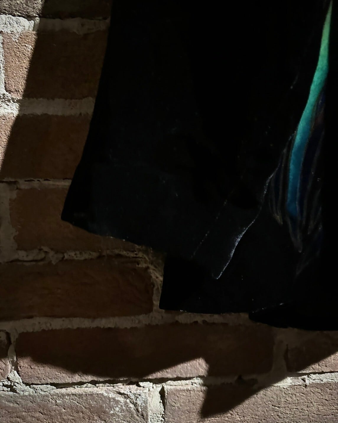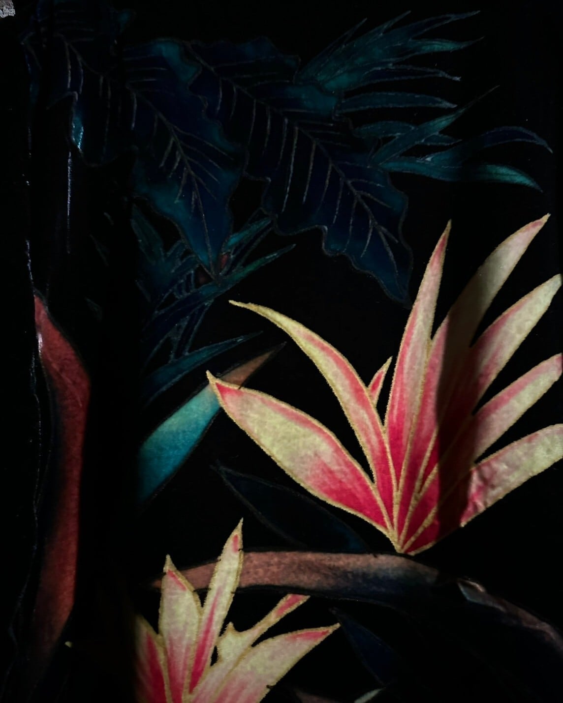 深みのあるブラックの表情の中に潜んだ鮮やかなカラーリングが非常〜に美しい、、、そしてベロアの妖艶な光沢と相まってモードな雰囲気をムンムンに漂わせます。