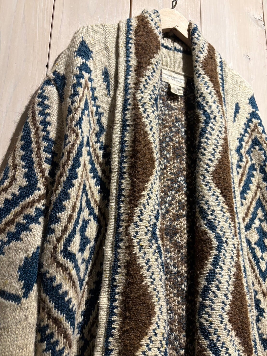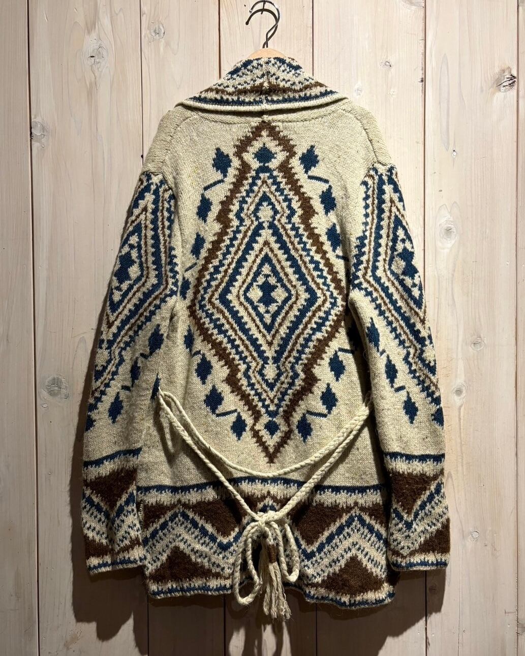 ベージュのボディをベースに、ブルー、ブラウンのカラーリングでこのブランドらしいネイティブ柄をニッティングで表現したニットガウンジャケット。