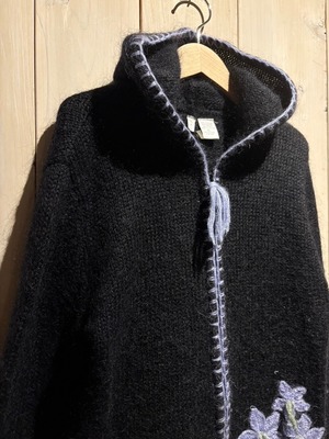 ブラックモヘアを贅沢に混紡したブラックのボディに、レトロな花の刺繍を刻んだジップアップニットフーディ。