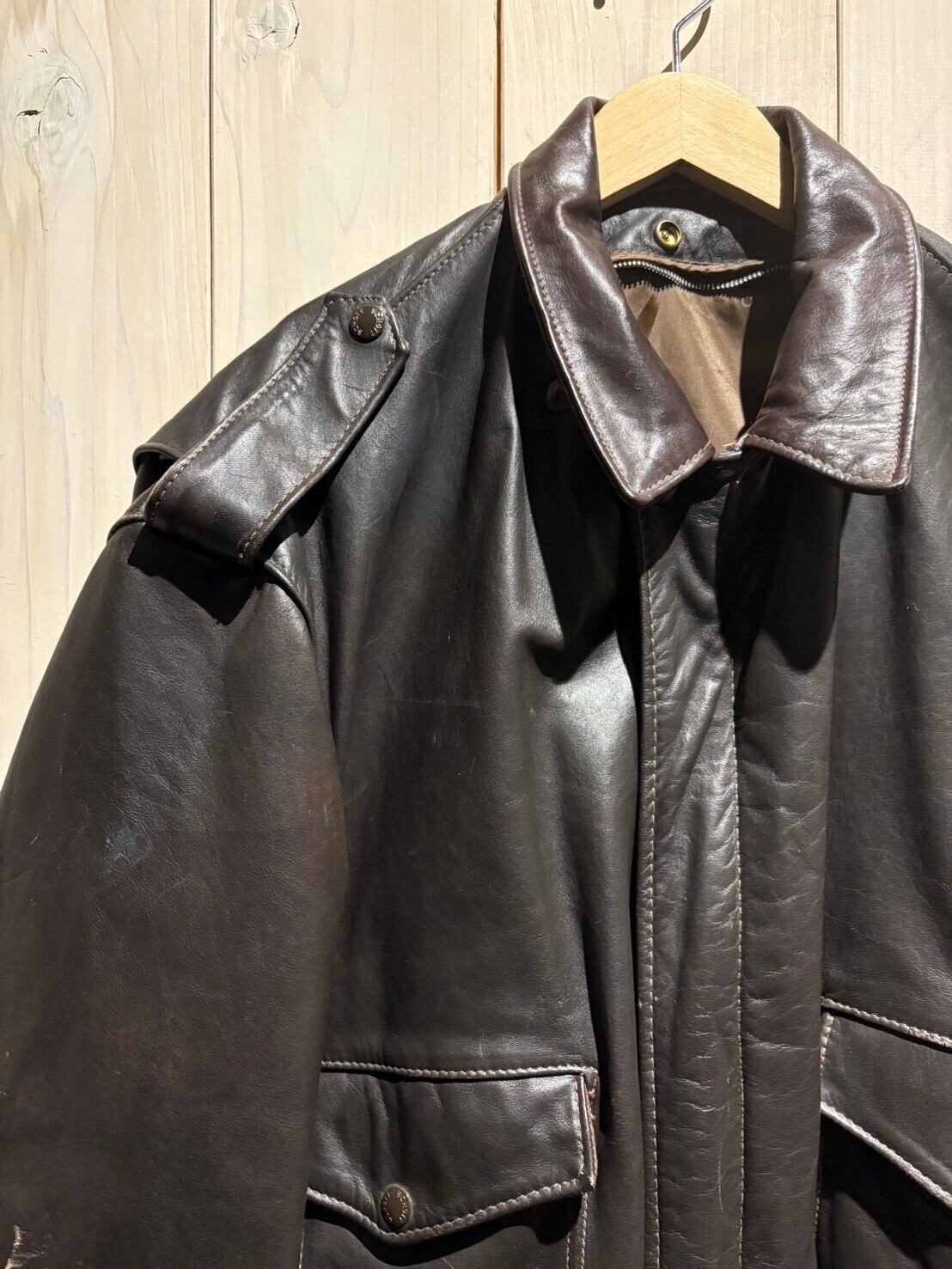 1931年に米陸軍航空隊に採用された、フライトジャケットの名作"A-2"をベースに作られたレザージャケット。写真からもヒシヒシと伝わる上質なブラウンレザーが経年変化により渋い雰囲気を漂わせていますね。