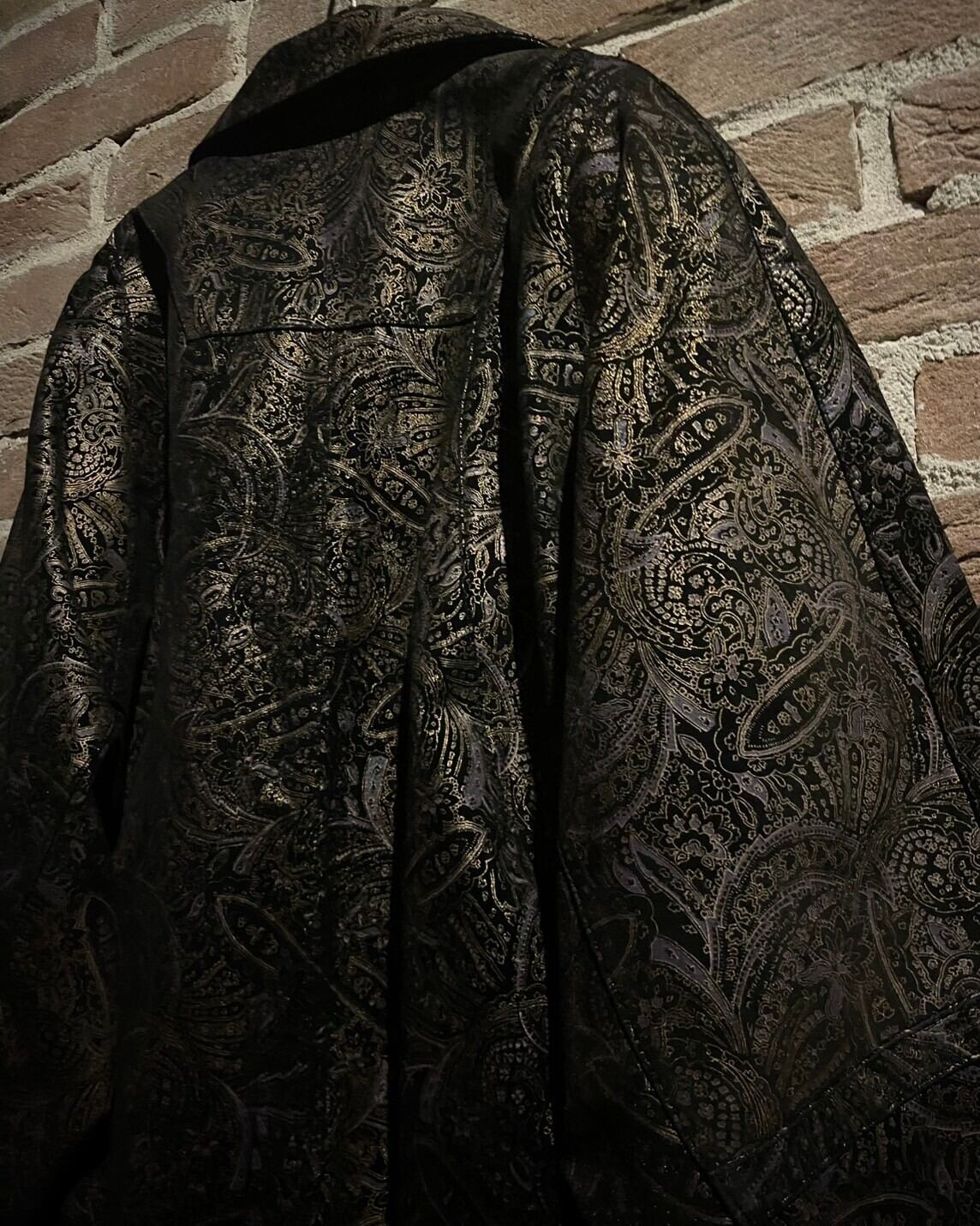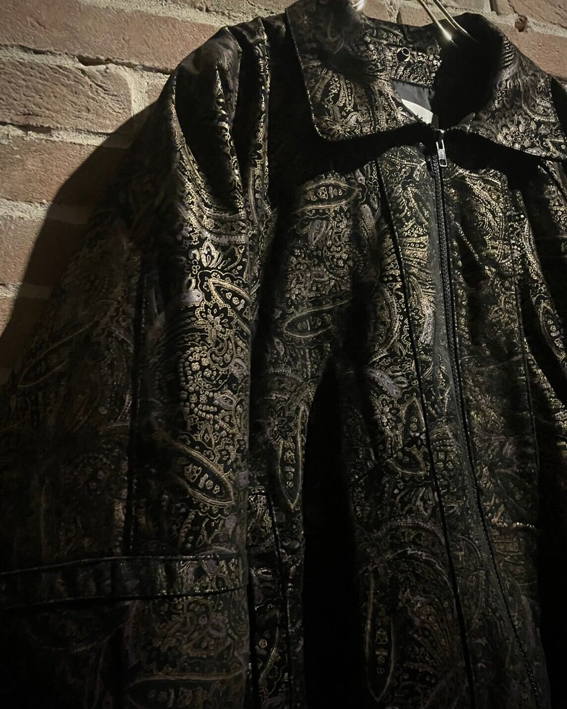 ハリのある上質なレザーを用いたボディに、鈍く光沢を放つゴールドのペイズリー柄を載せたジップアップレザージャケット。