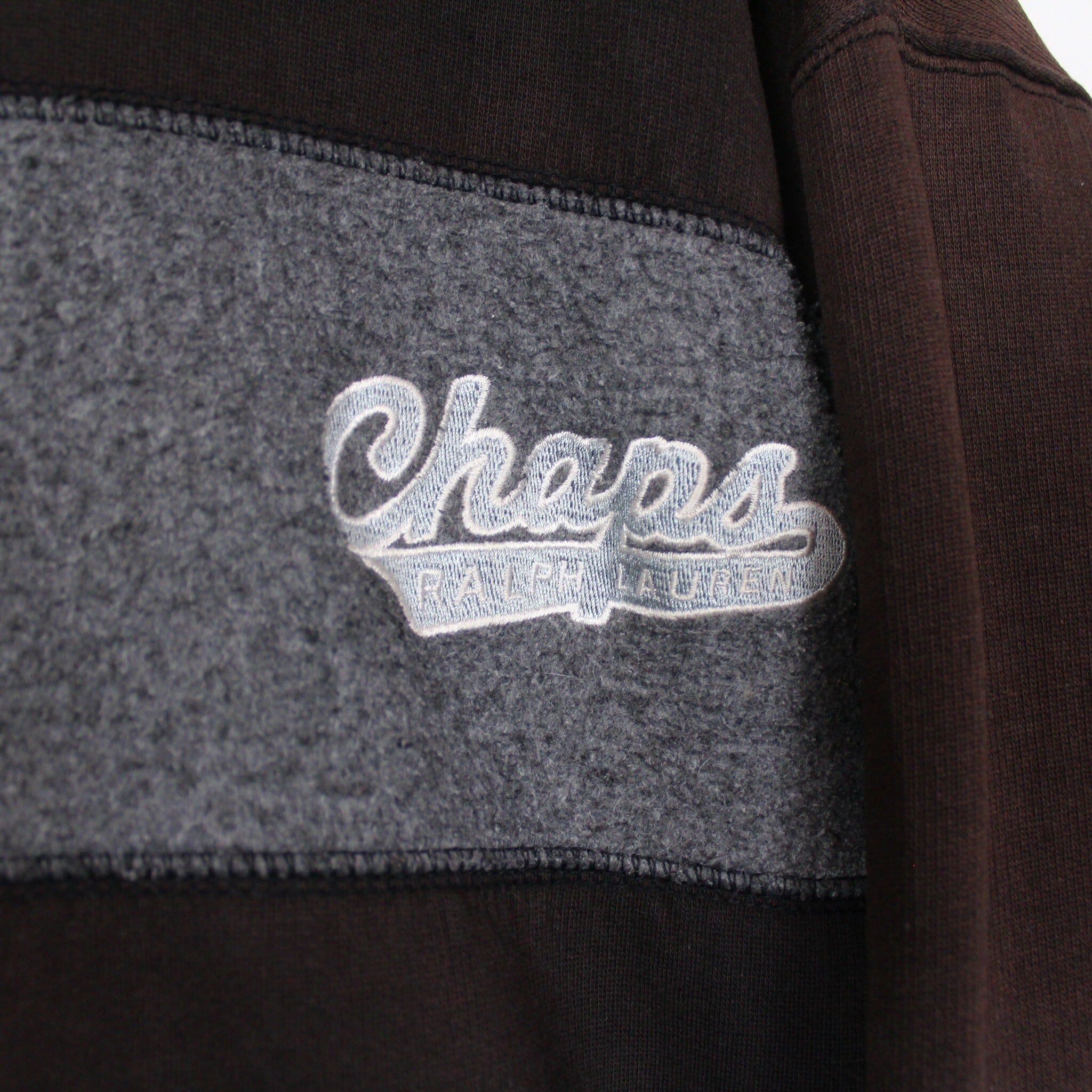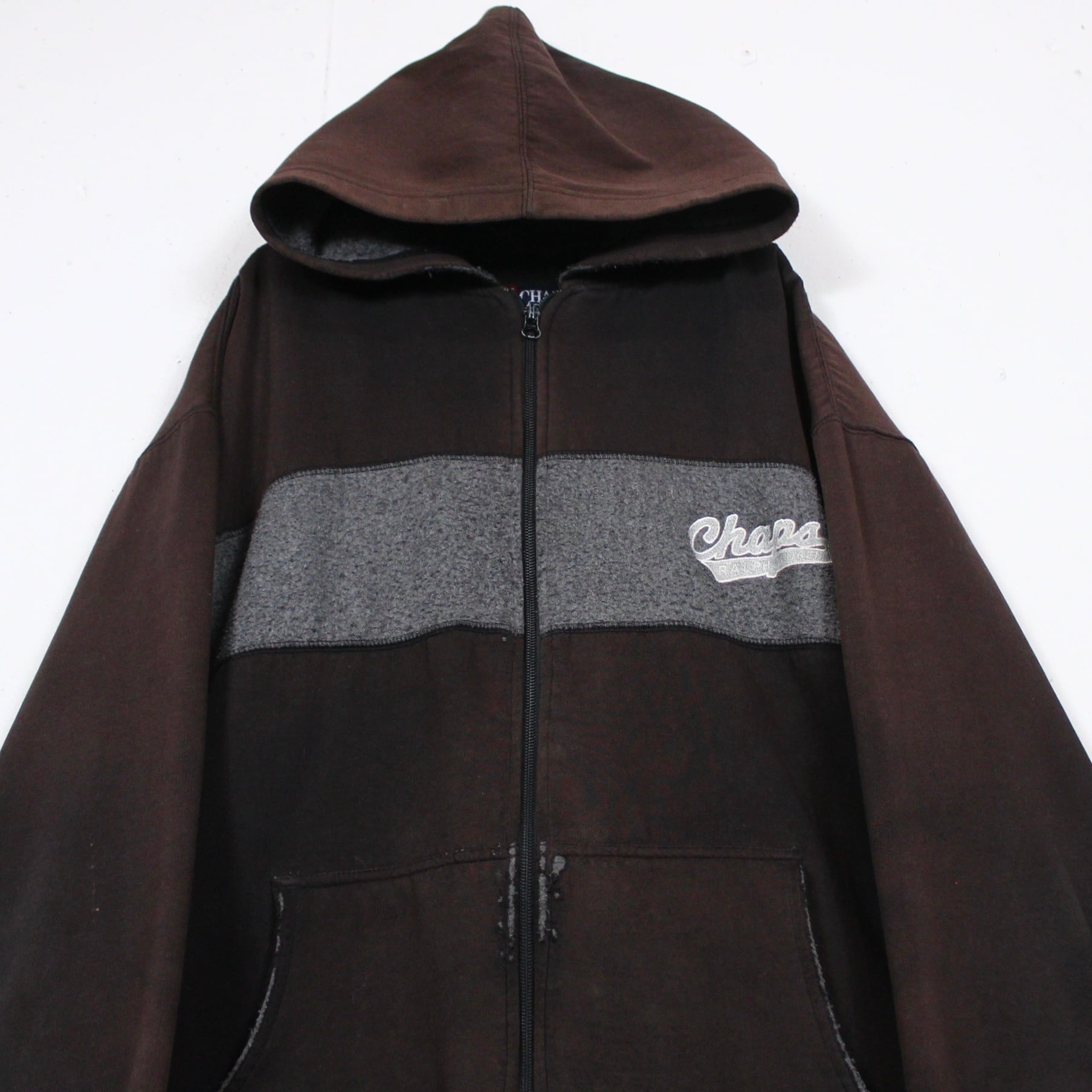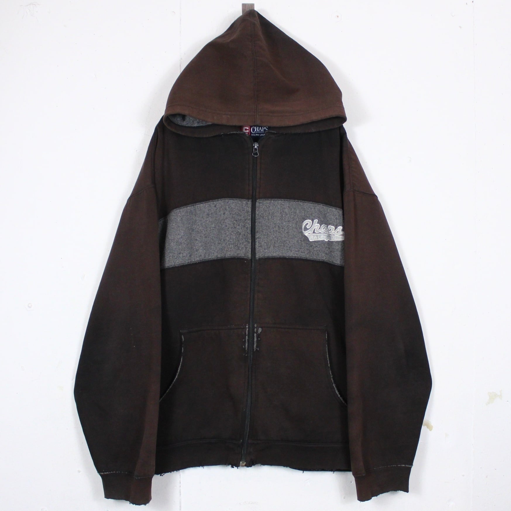 起毛感のあるスウェット地をフロントに切り替え、左胸にブランドロゴの刺繍をON。経年変化による美しいサンフェードが効いた、"CHAPS RALPH LAUREN"のジップフーディー。