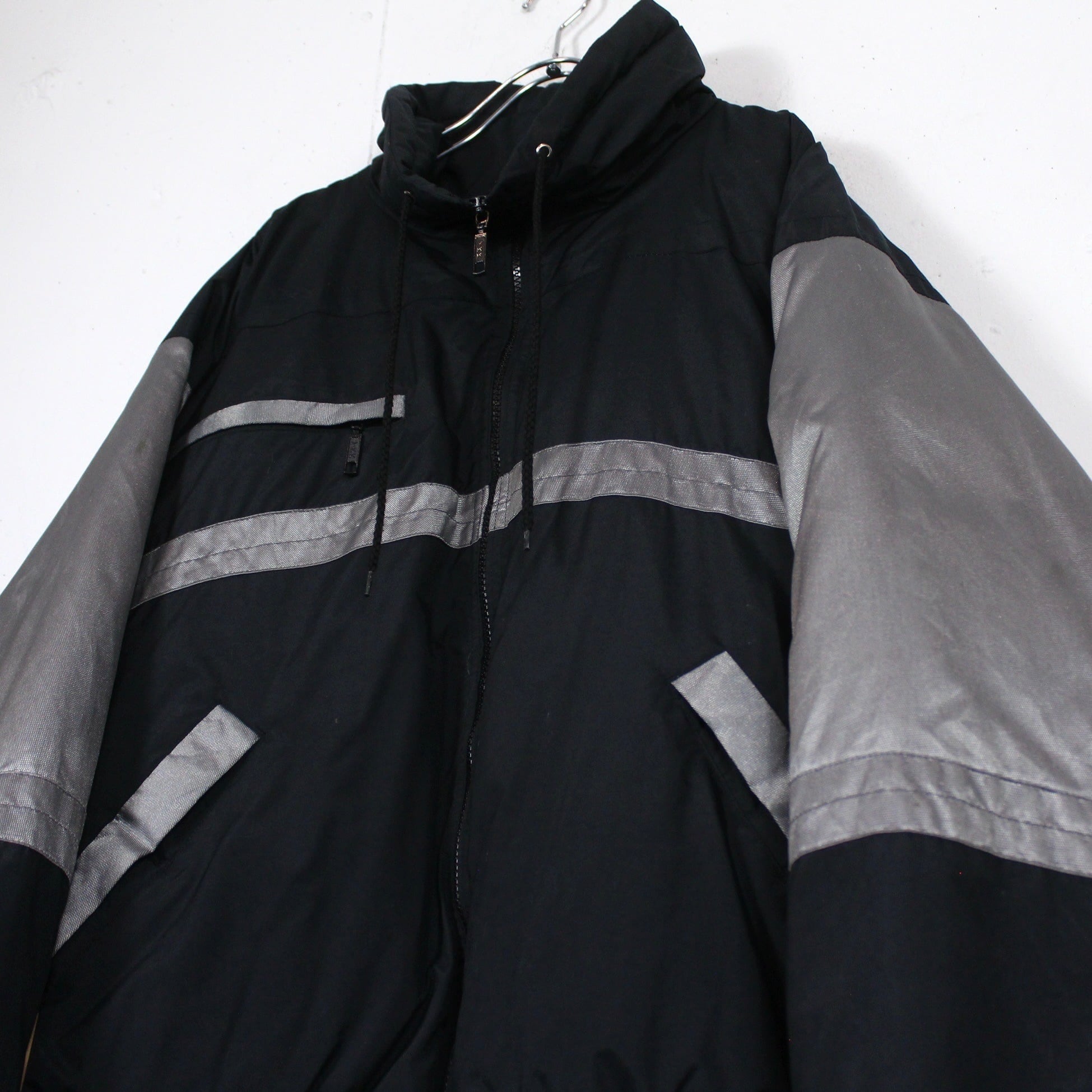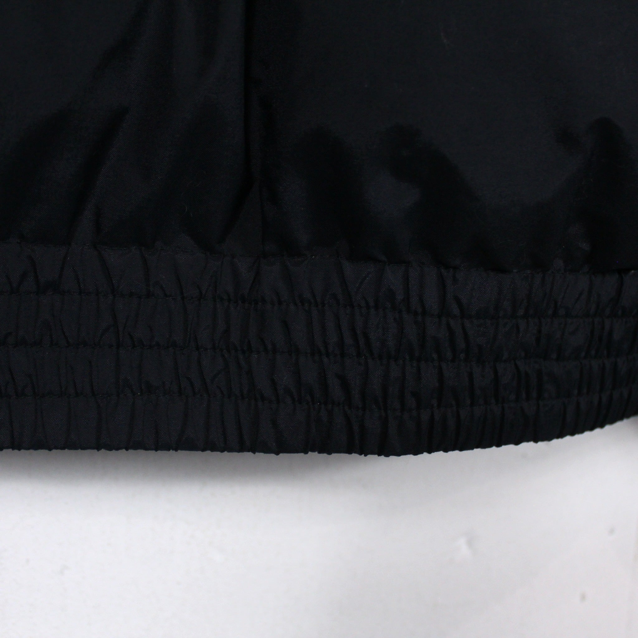 ハリのあるナイロン地をボディに用い、ブラックをベースにメタリックなシルバーで切り替えを施した1着。