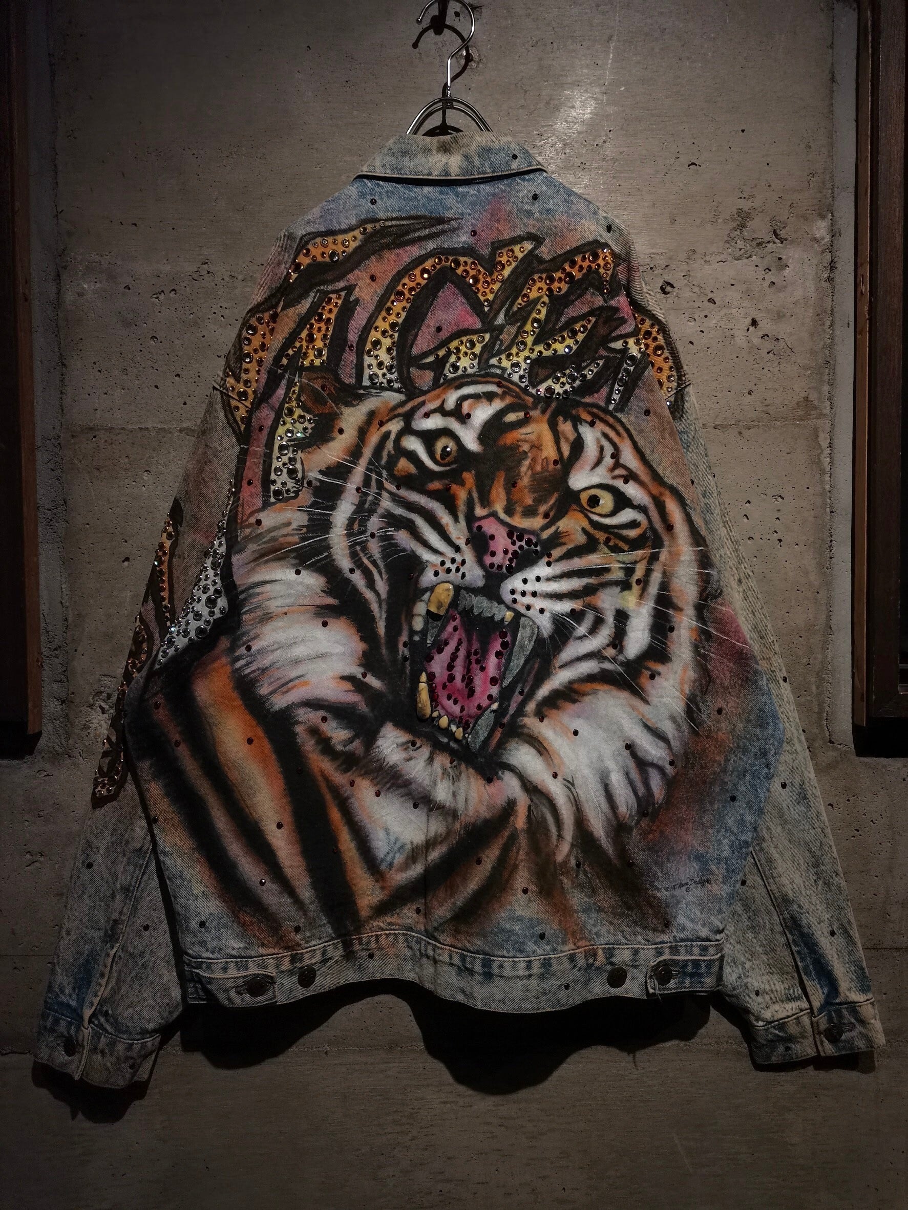 ケミカルウォッシュを施したデニムボディに、エアブラシでリアルな表情で迫力満点な虎のペイントをドカンと載せた1着。80年代らしノリのデザイン性の高さに心惹かれますよね…