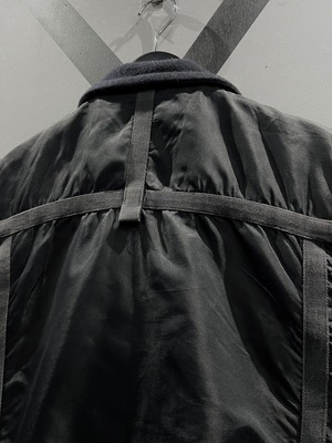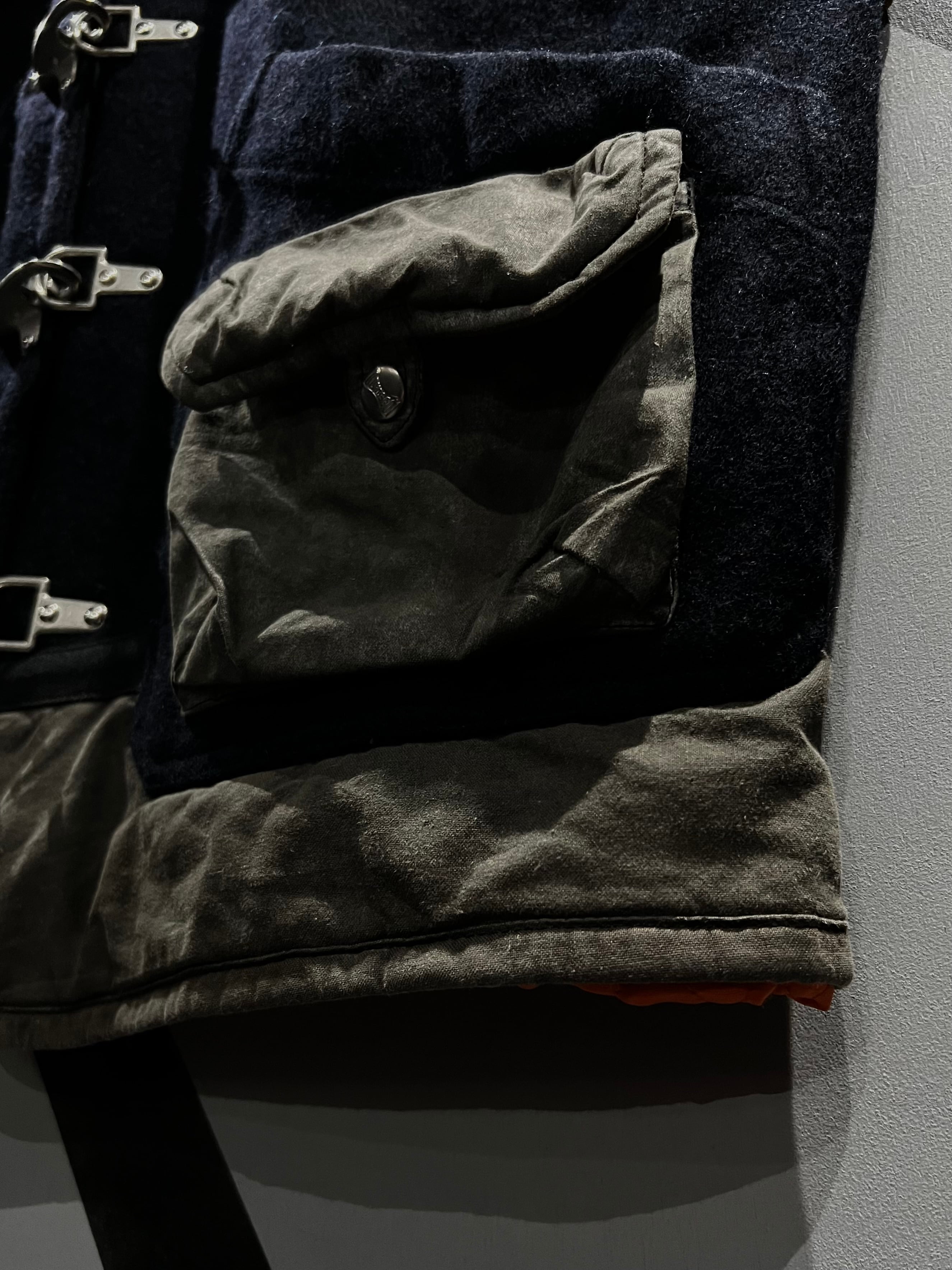 フロントはジップ×ファイヤーマンバックルから成る二重構造の比翼仕立て。キルティングが施された、ミリタリーライクなオレンジの裏地も差し色として非常に良い役割を果たしています。