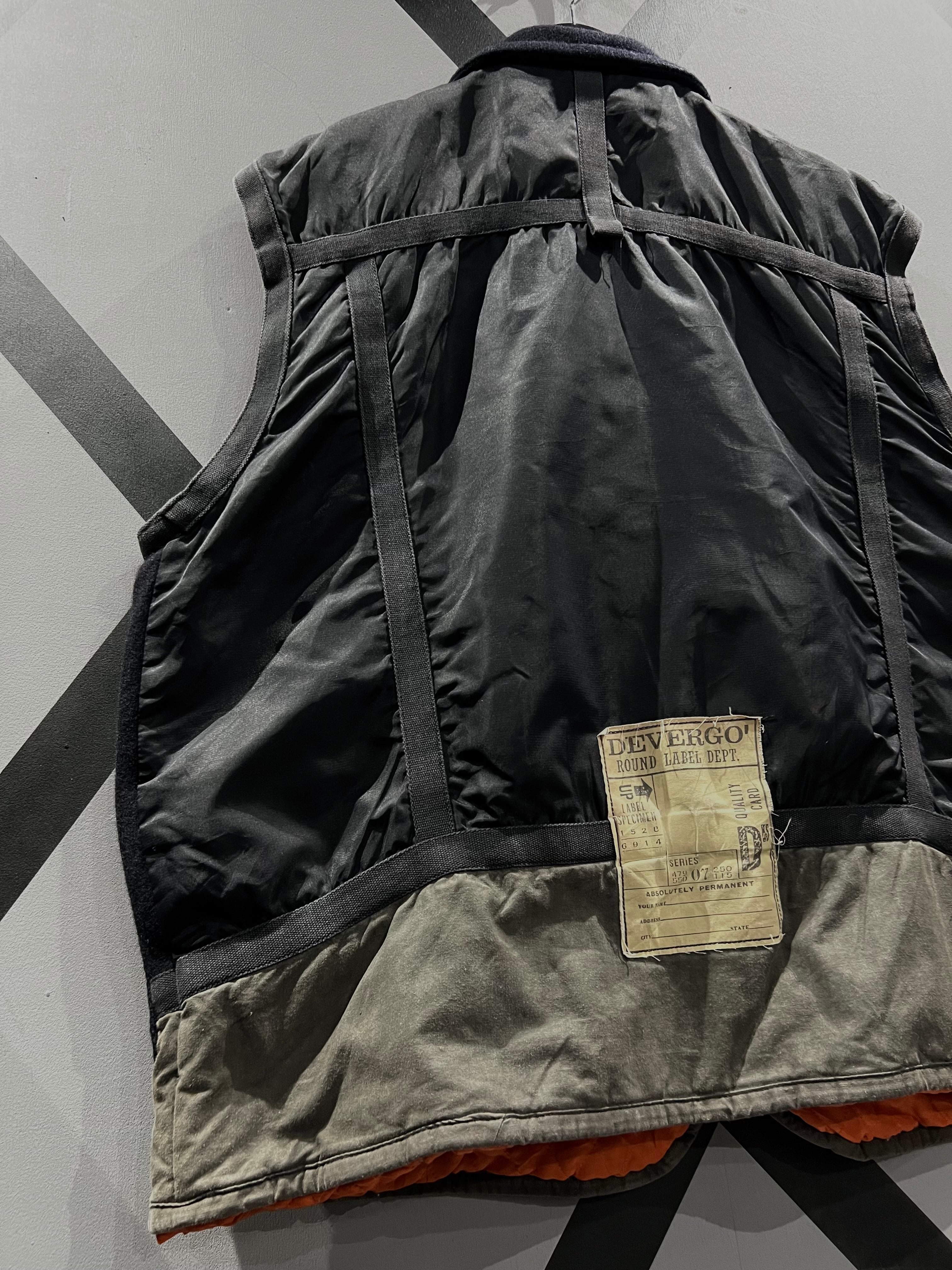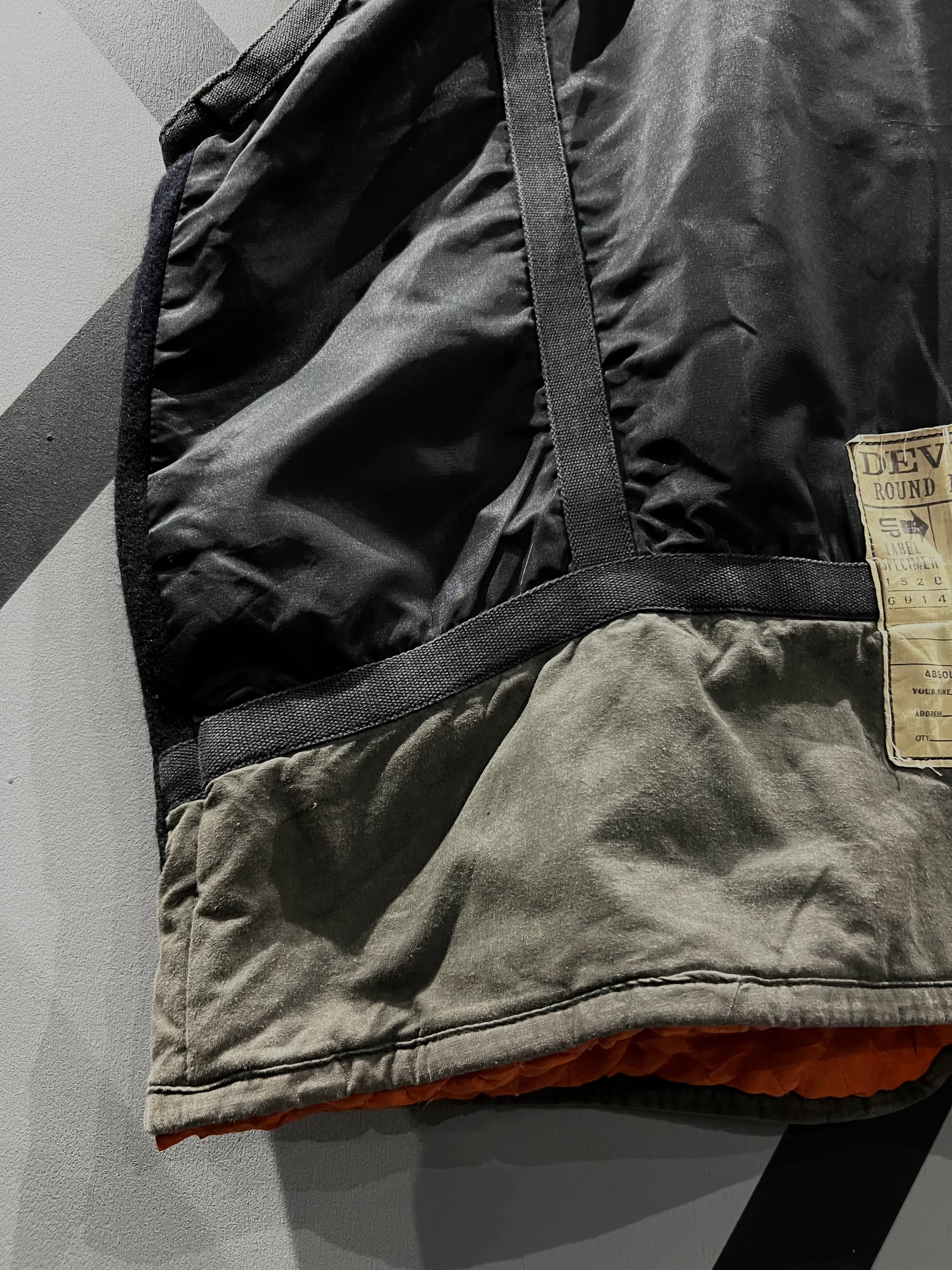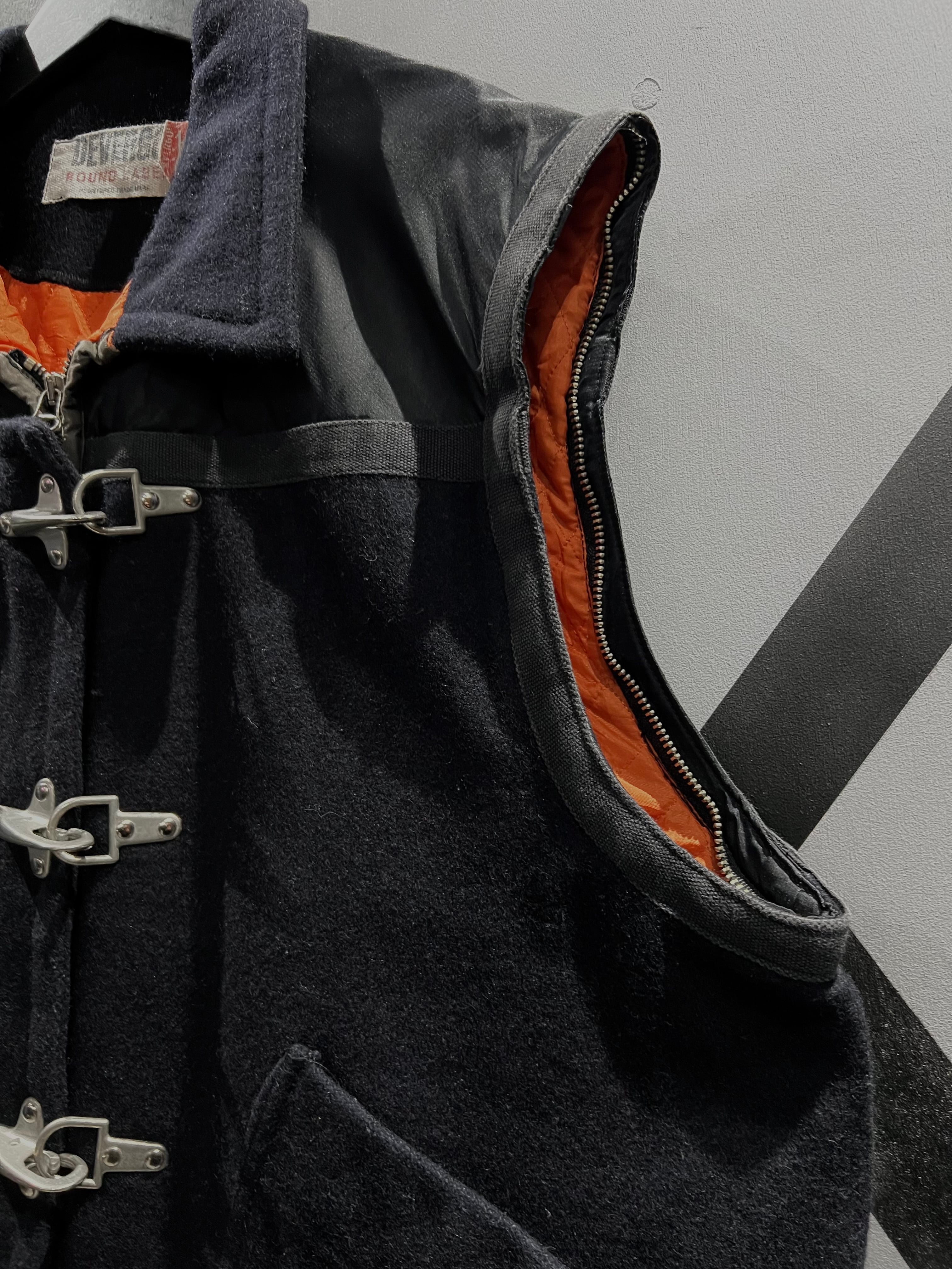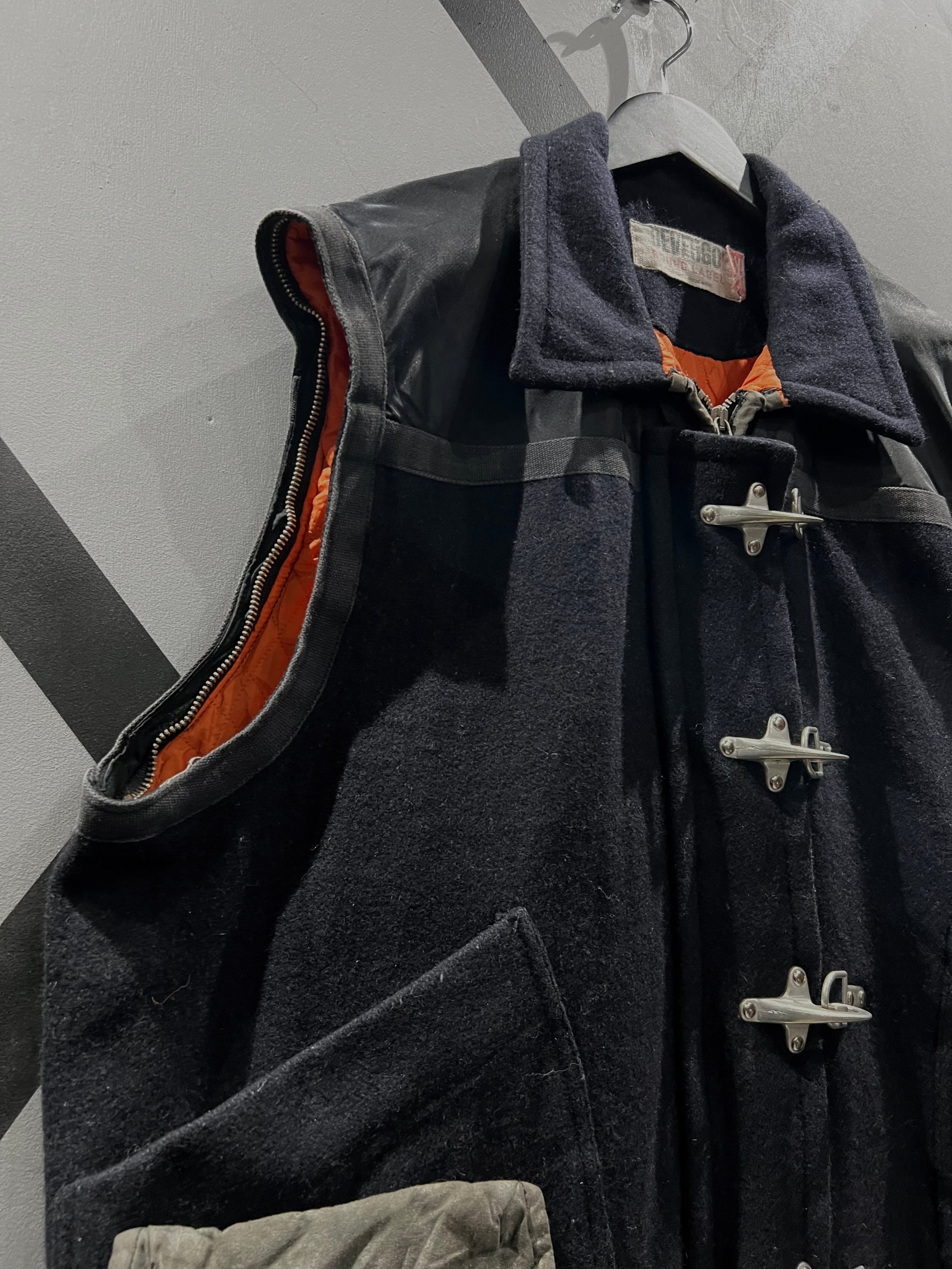 ハリのある光沢を帯びたナイロン生地×目の詰まった肉感のあるメルトン地でボディを切り替え、フロントにシルバーのファイヤーマンバックルを施した、稀有なファイヤーマンベスト。