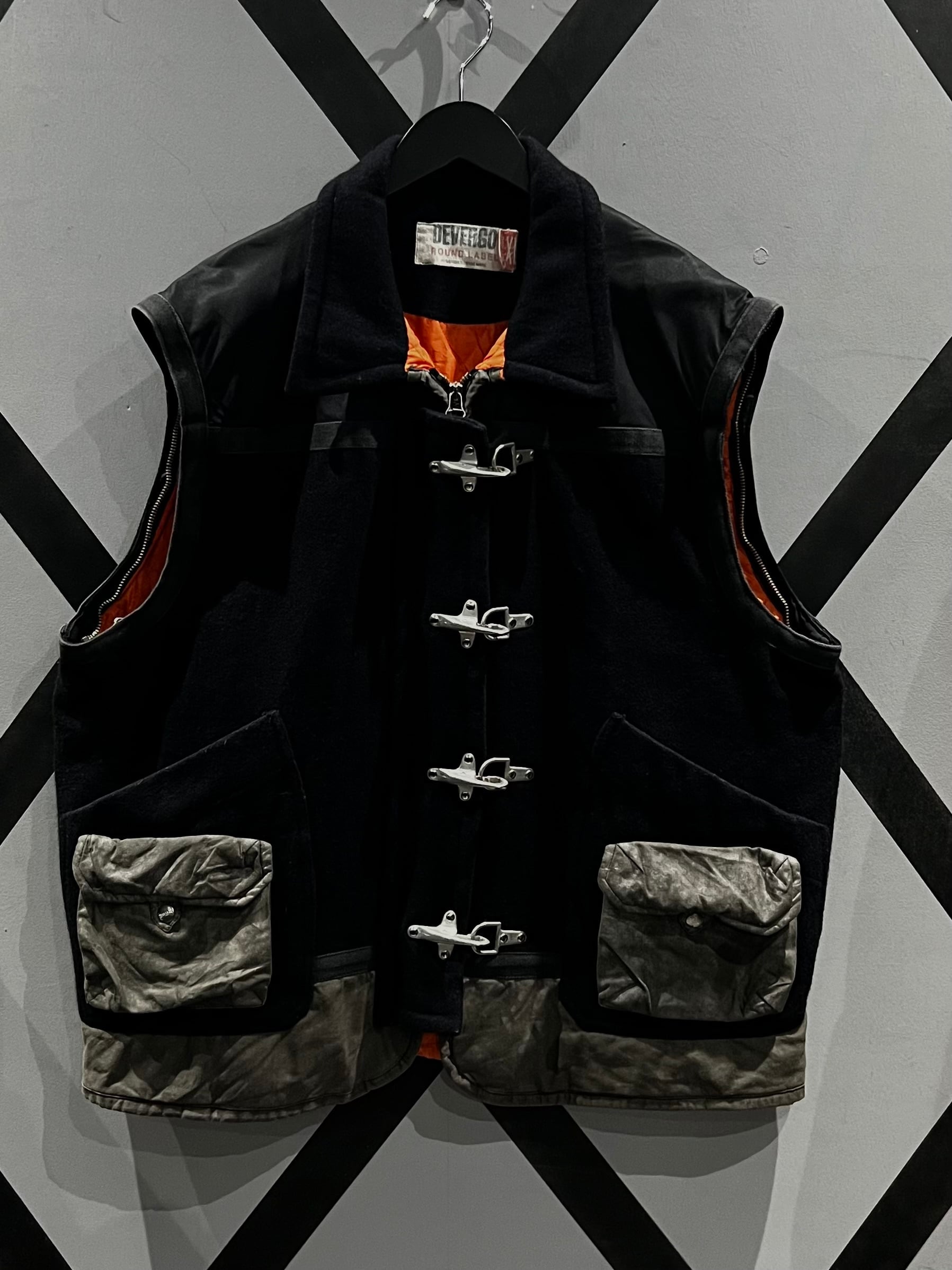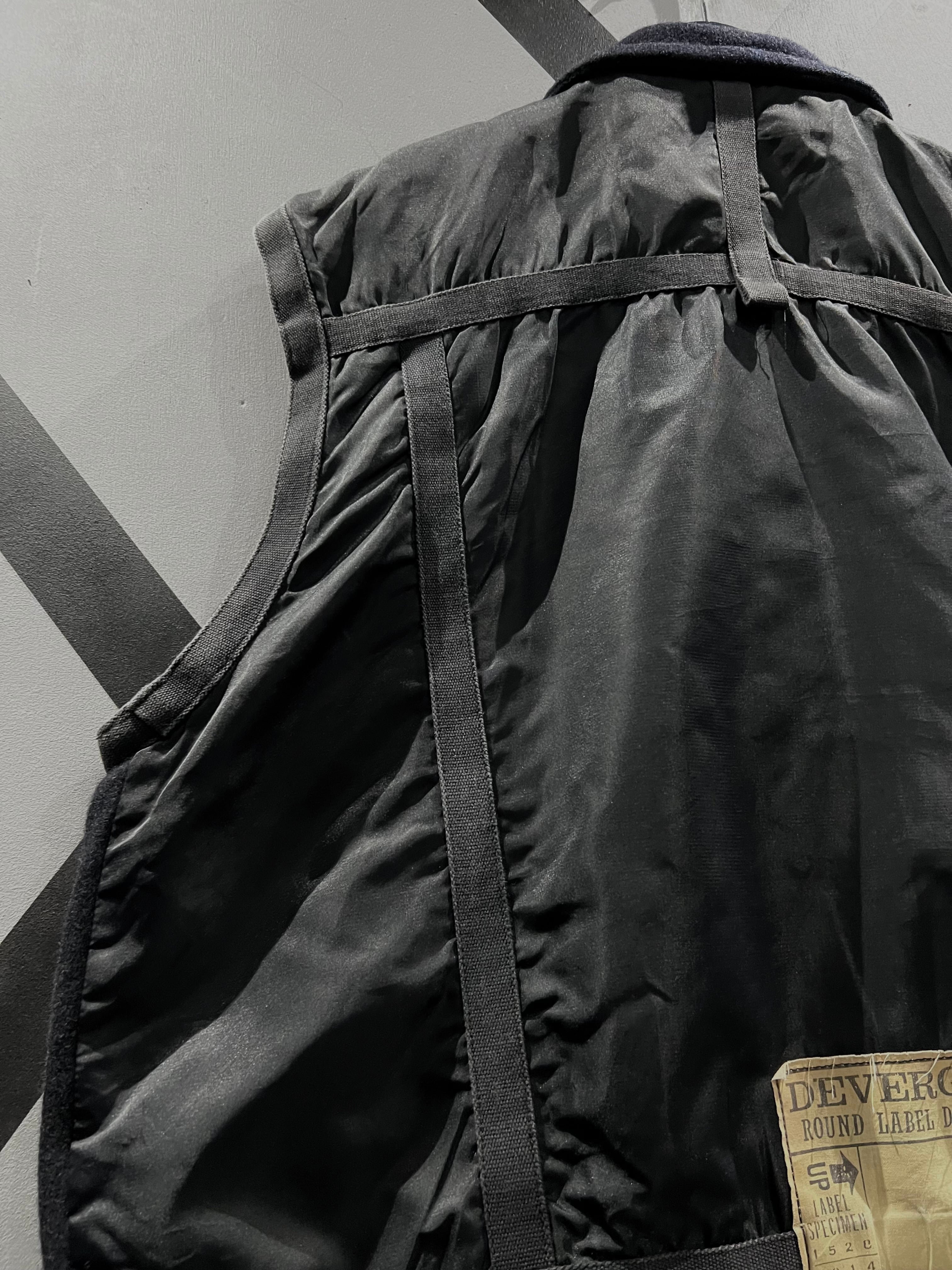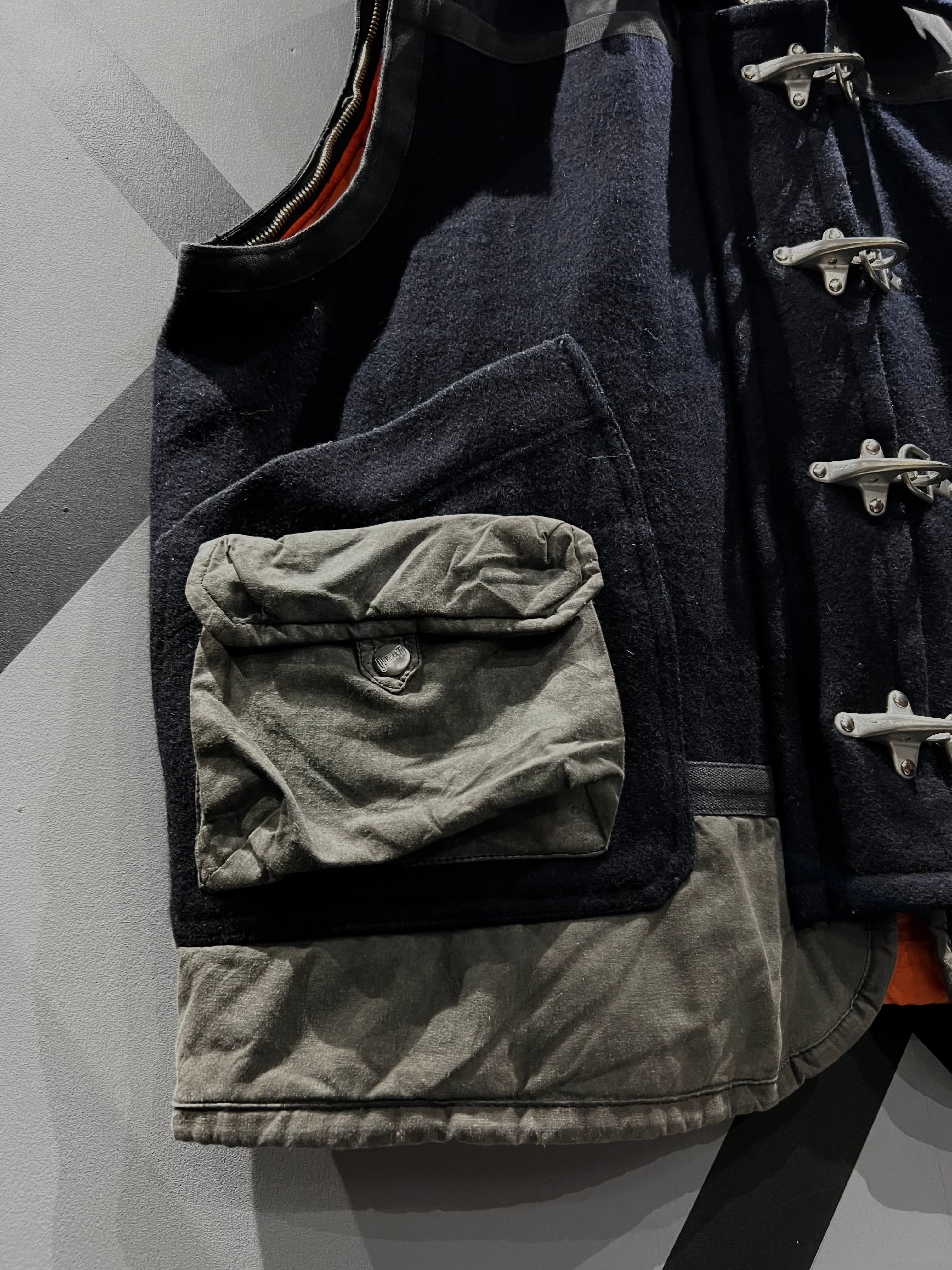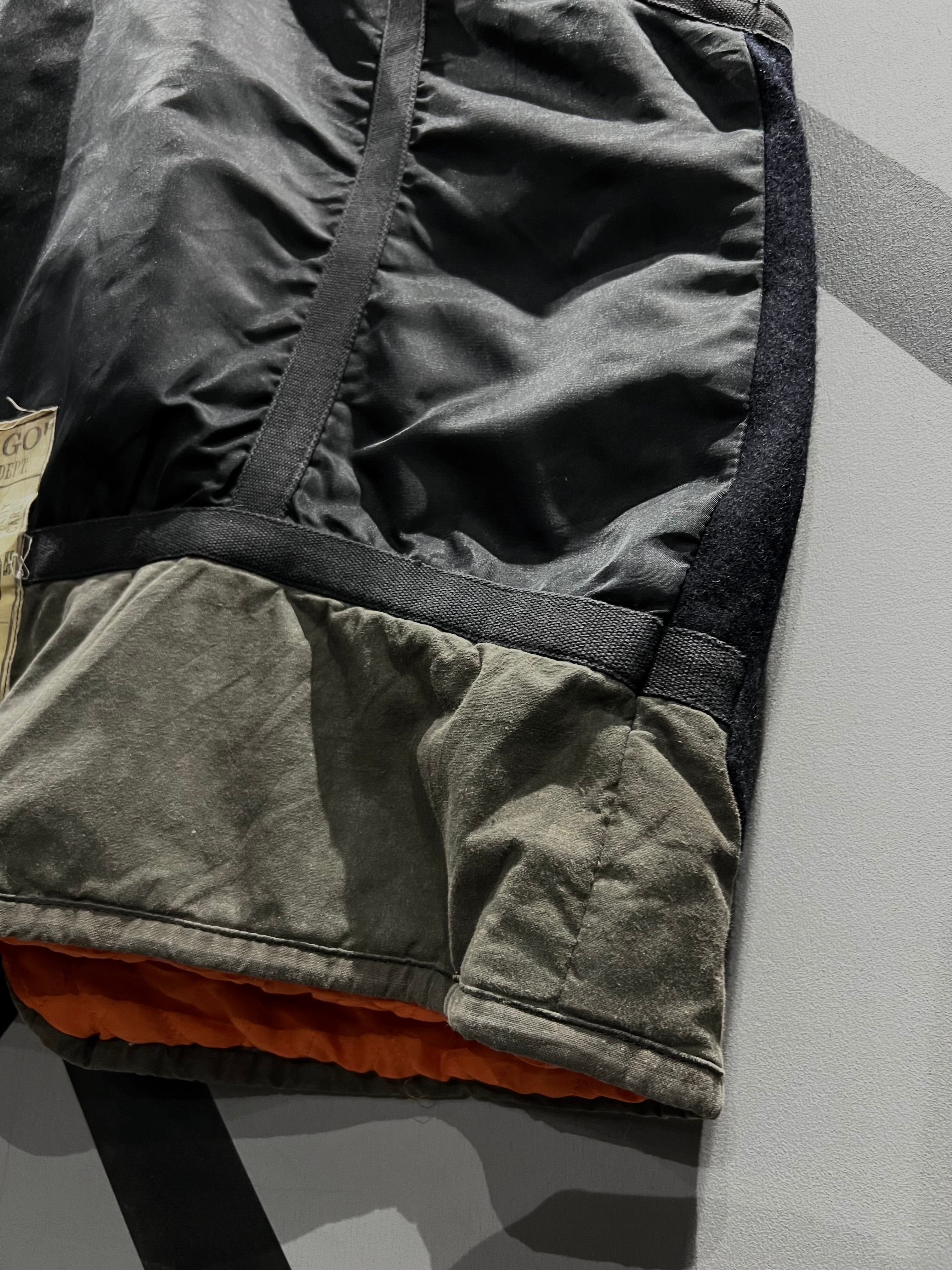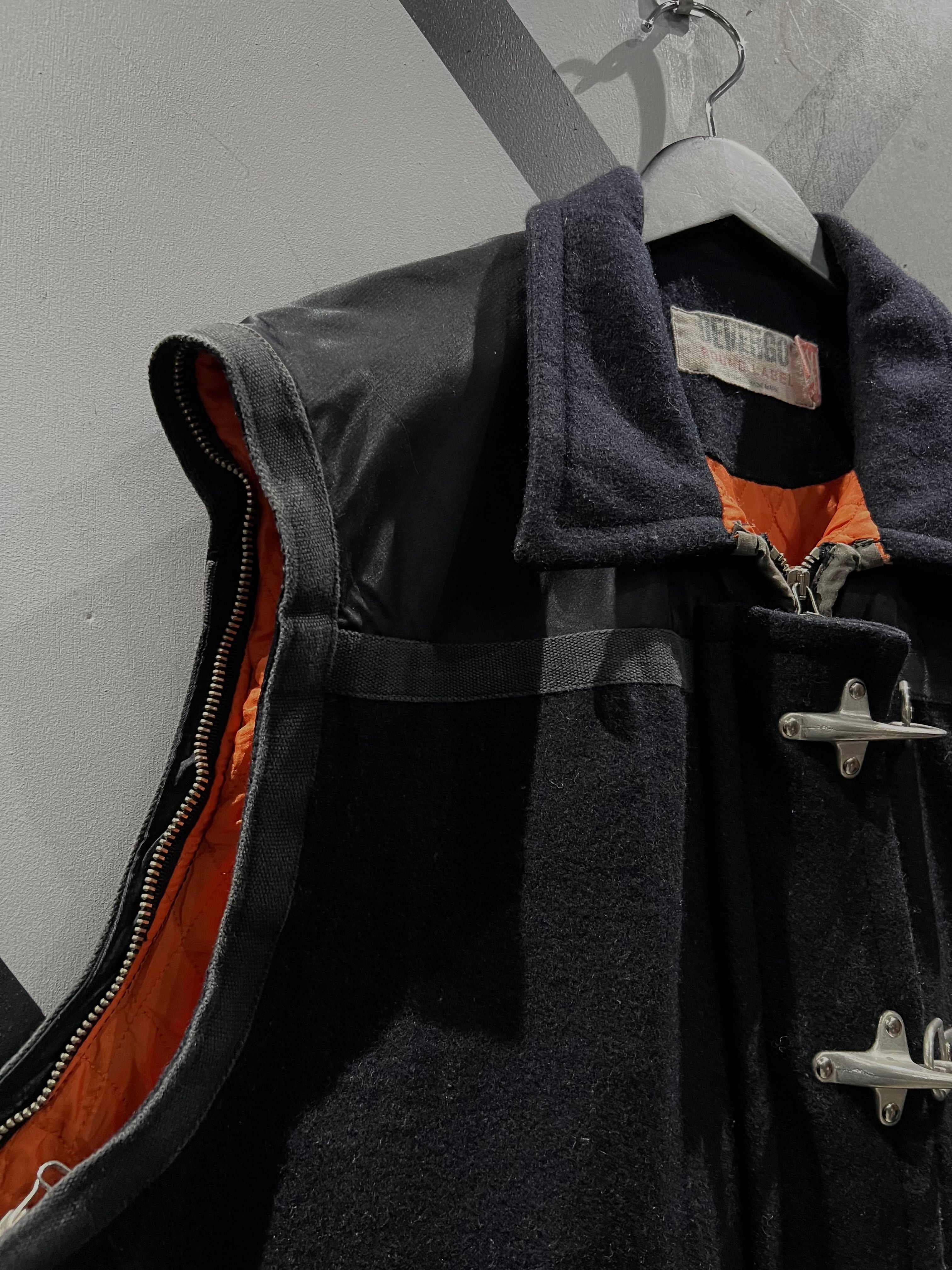 ハリのある光沢を帯びたナイロン生地×目の詰まった肉感のあるメルトン地でボディを切り替え、フロントにシルバーのファイヤーマンバックルを施した、稀有なファイヤーマンベスト。