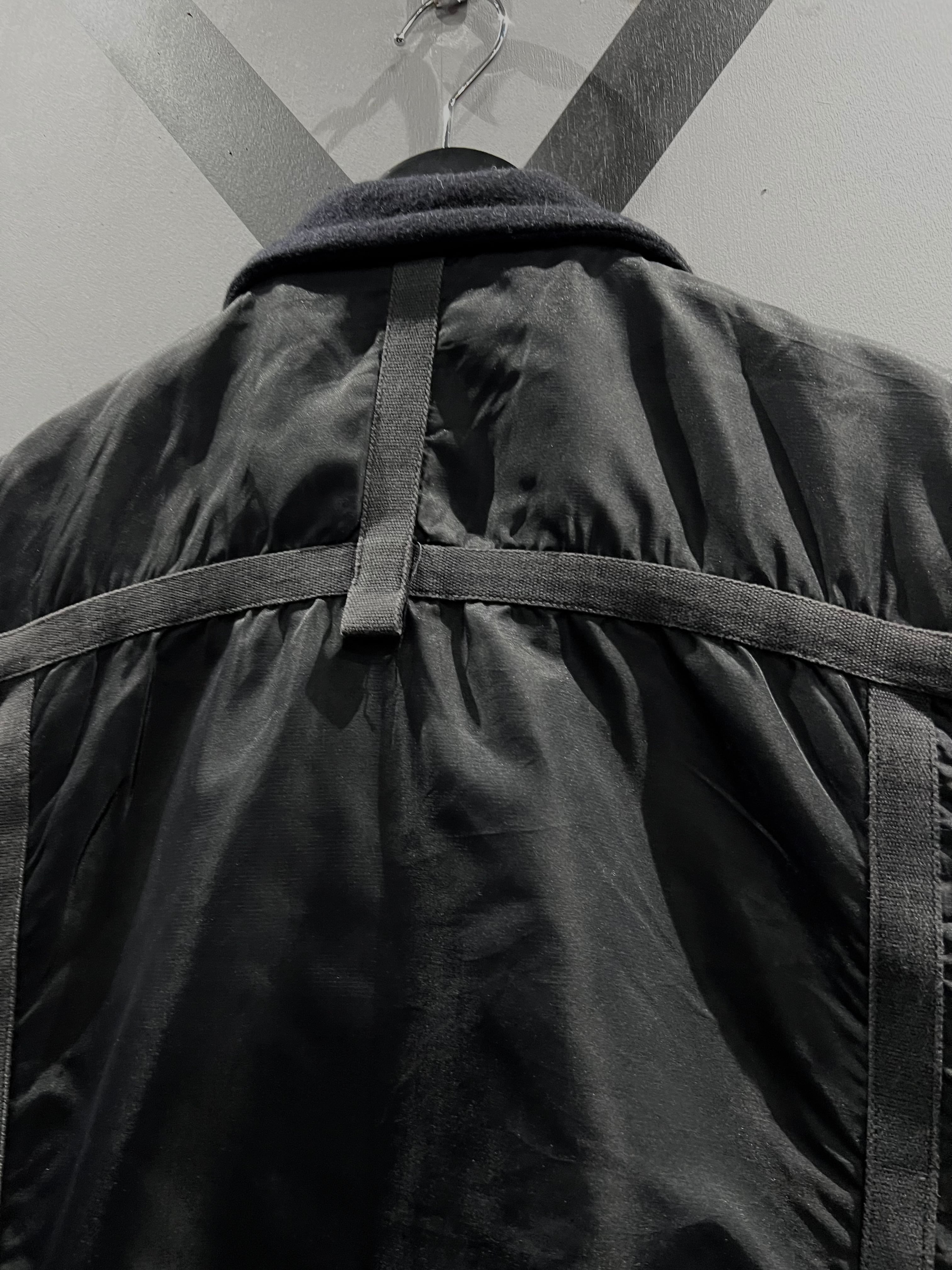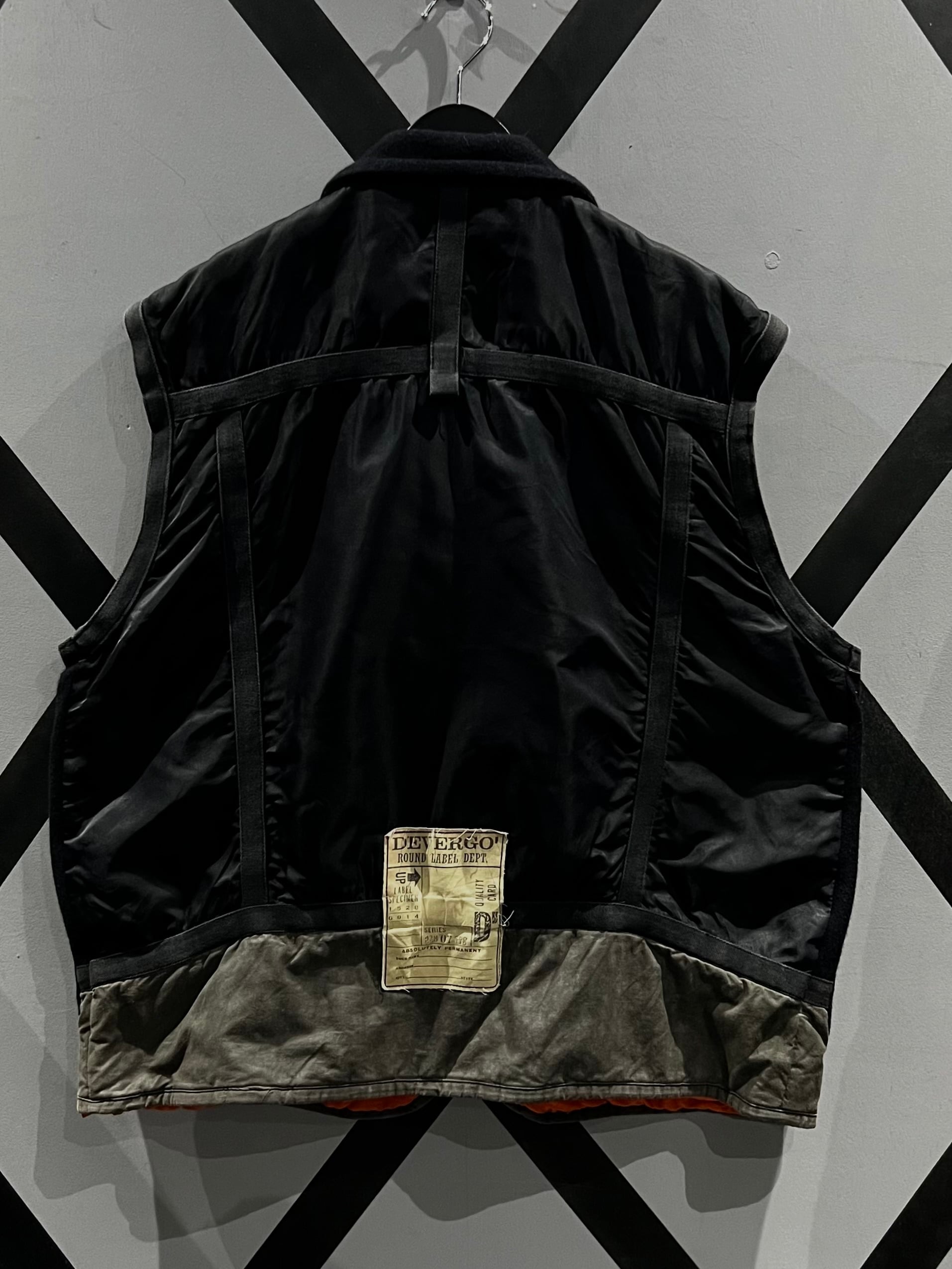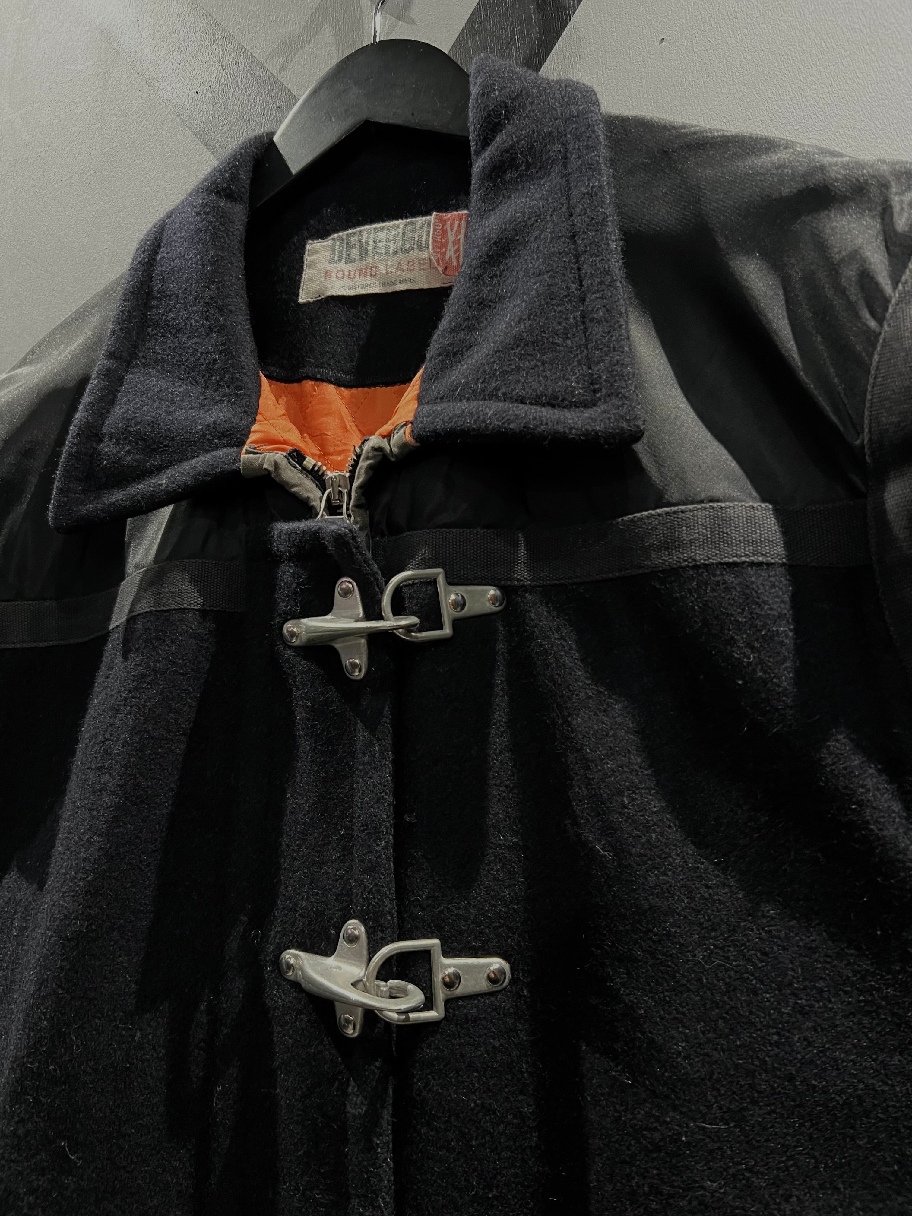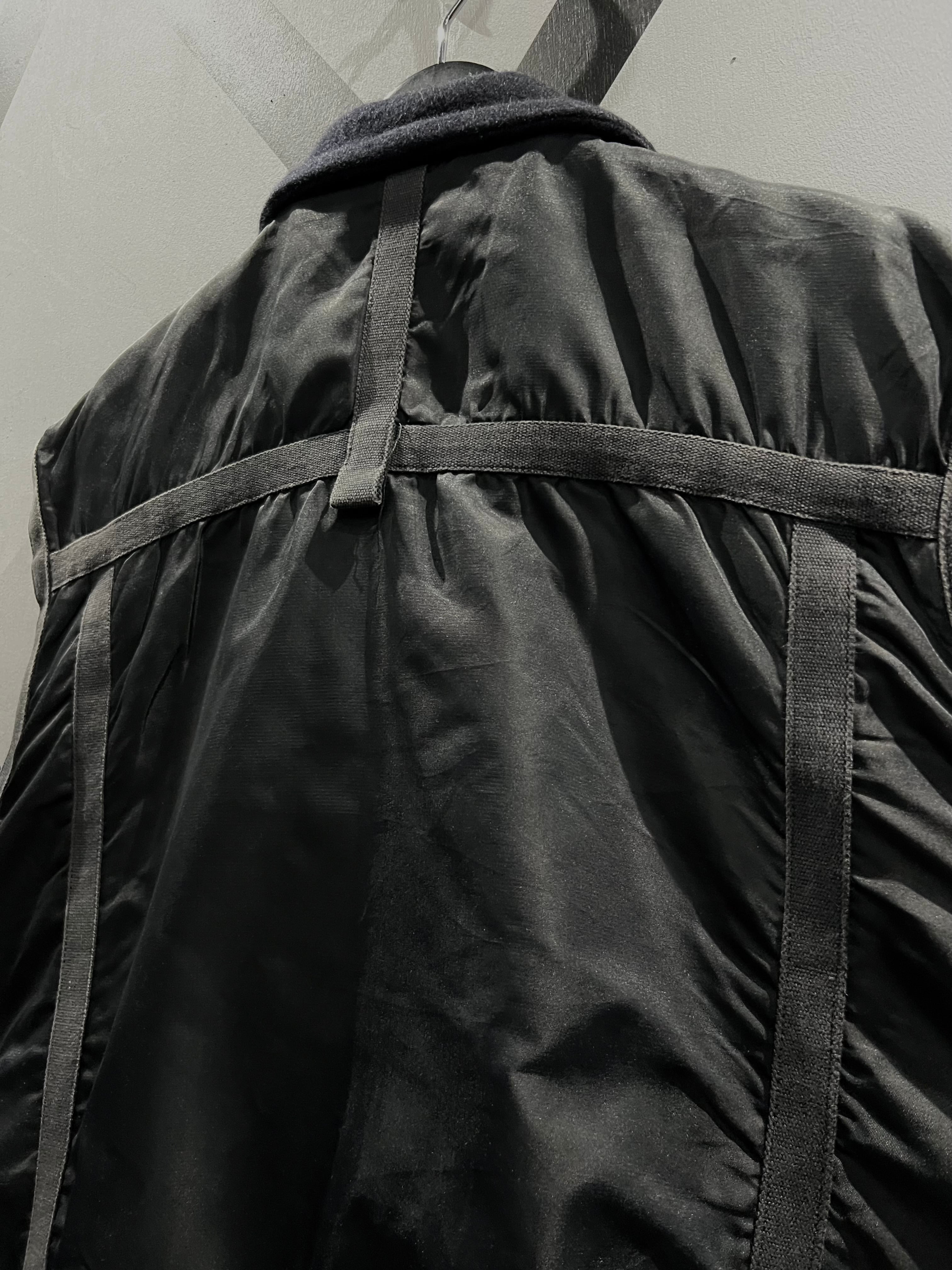 ハリのある光沢を帯びたナイロン生地×目の詰まった肉感のあるメルトン地でボディを切り替え、フロントにシルバーのファイヤーマンバックルを施した、稀有なファイヤーマンベスト。