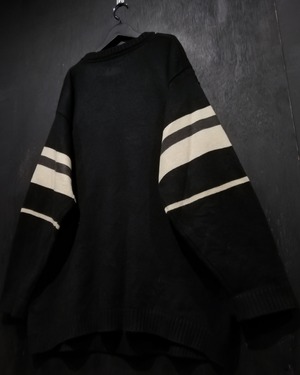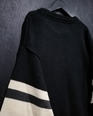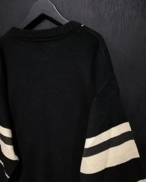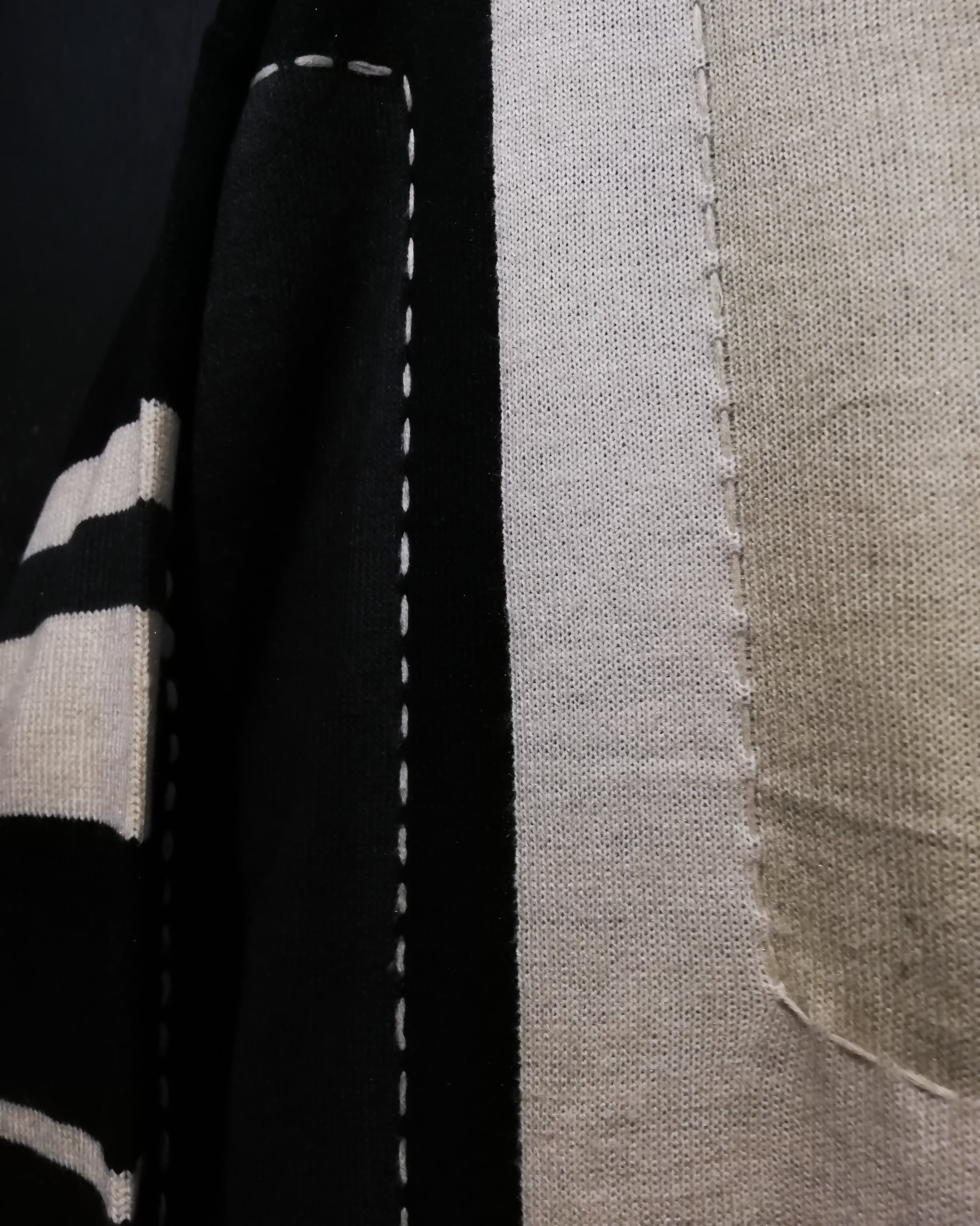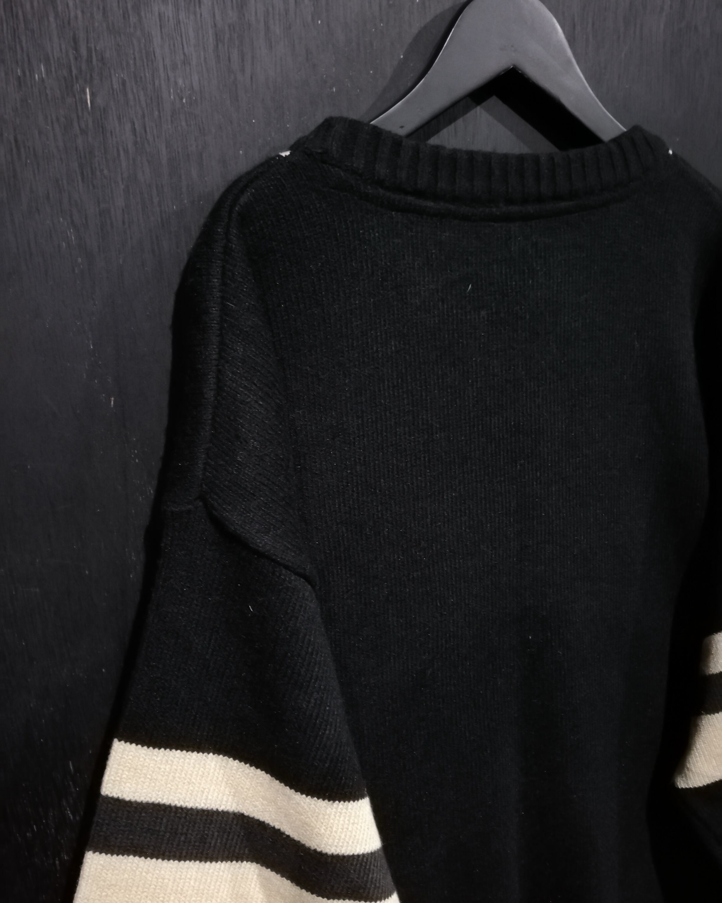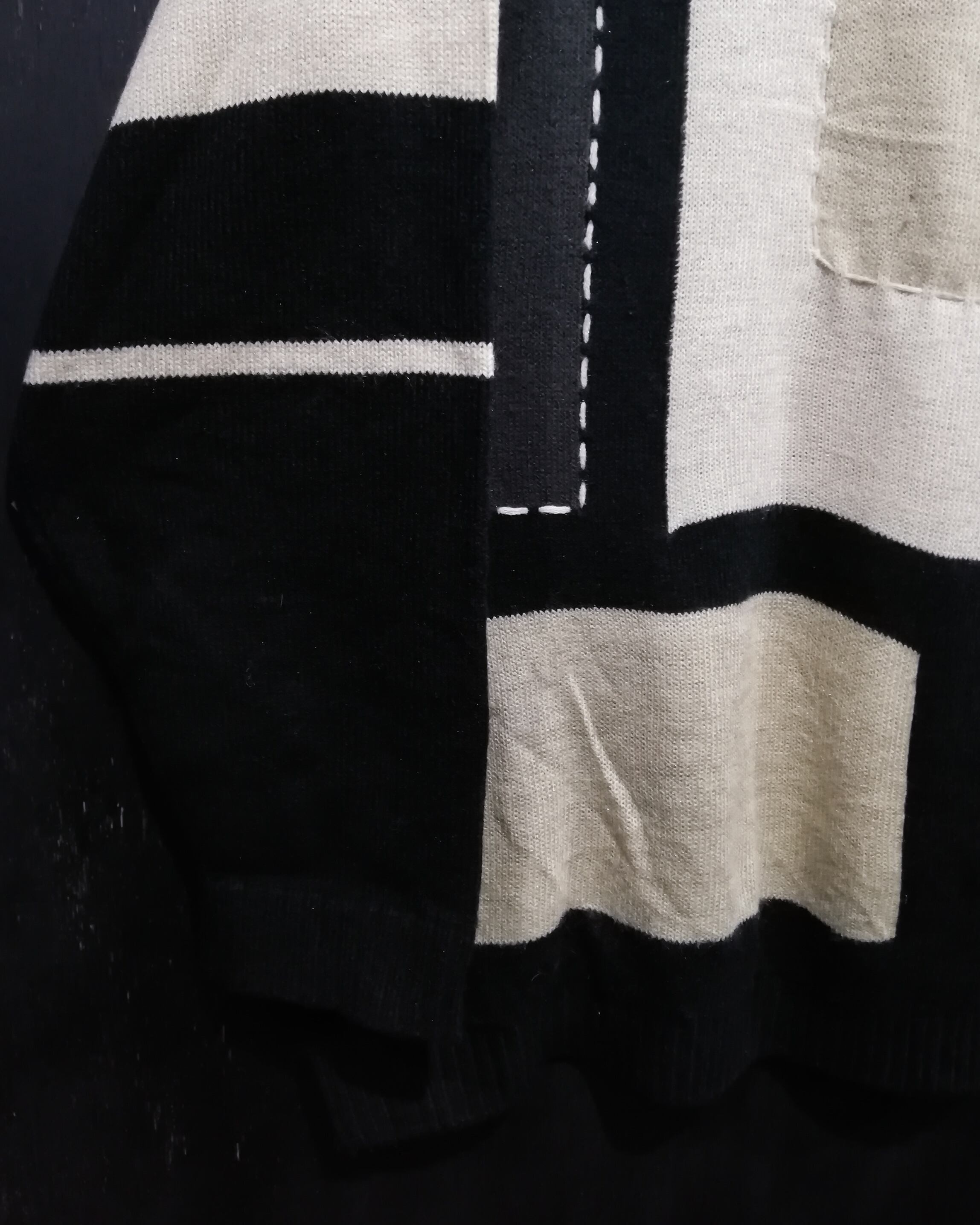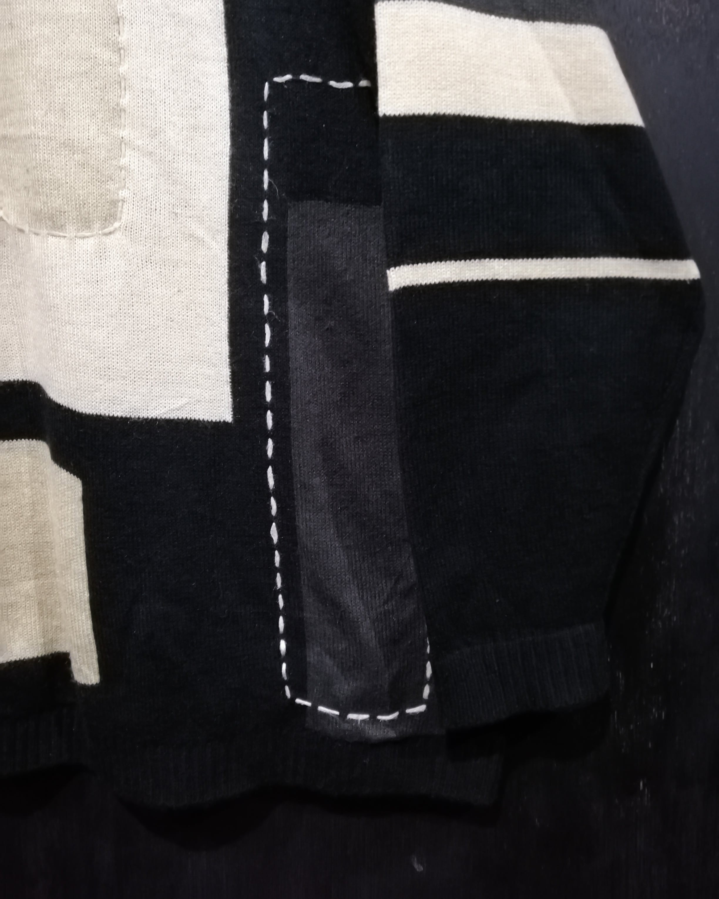ブラックのボディをベースに、ステッチを施し、色を切り替えパッチワーク風のデザインに仕上げたニット。