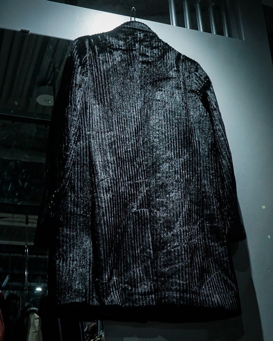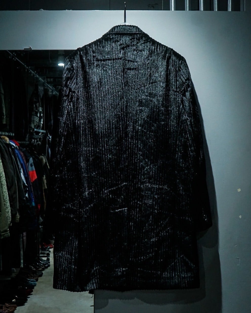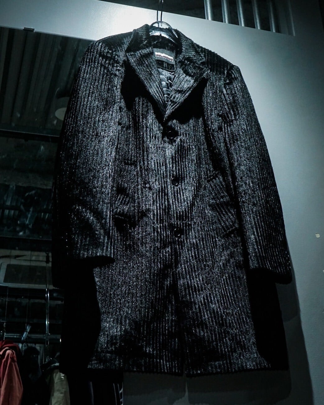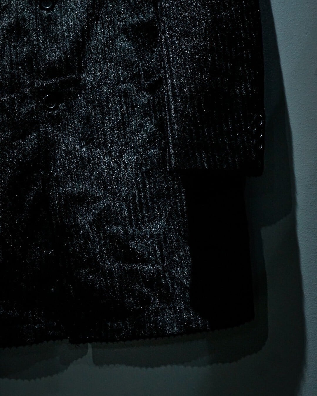 光の当たり加減で鈍く光沢を放つブラックベロアを用いたチェスターコート。