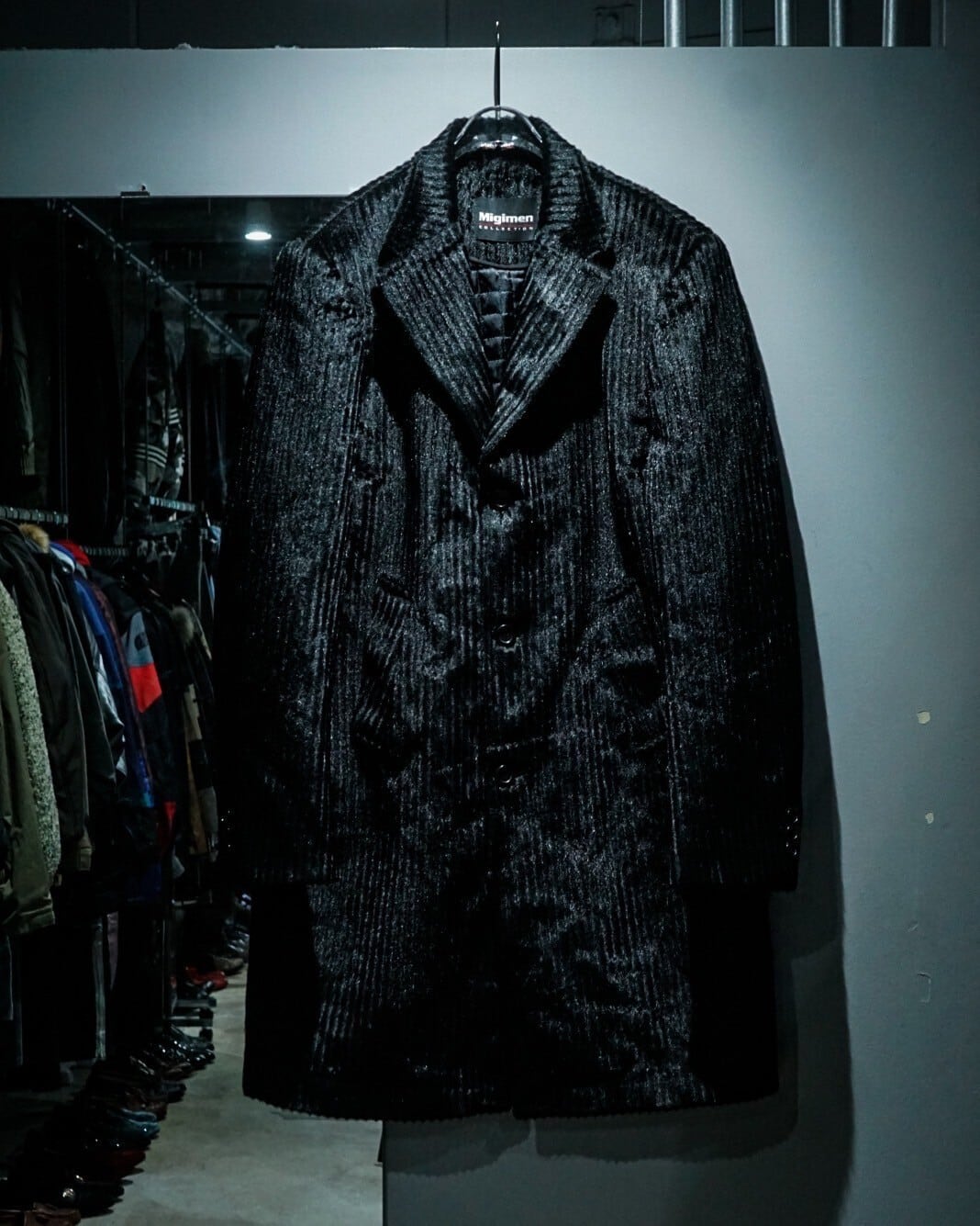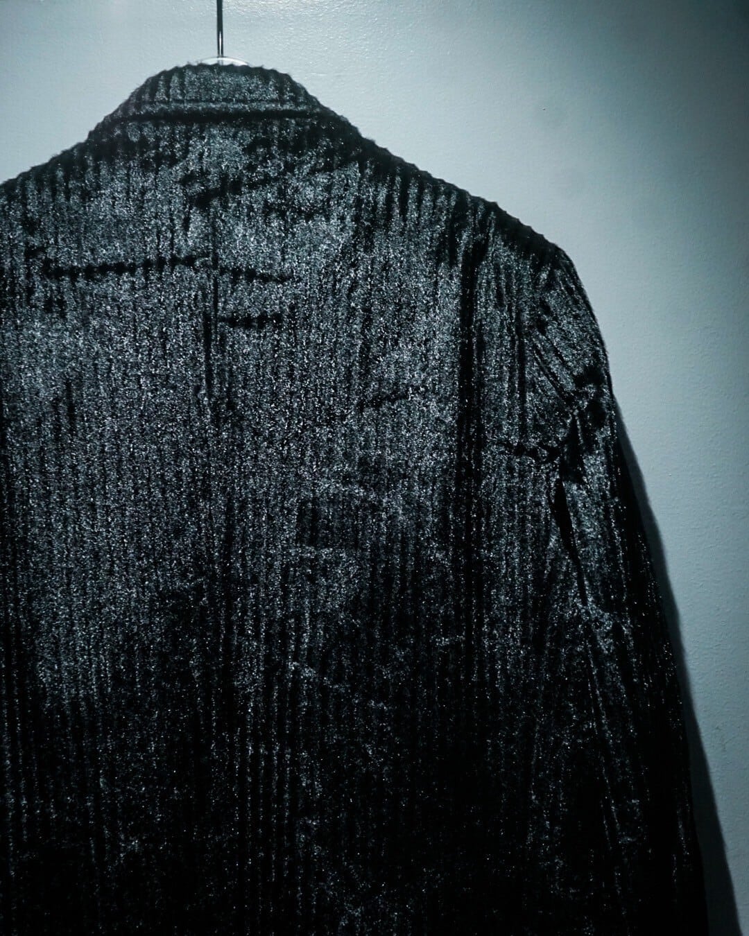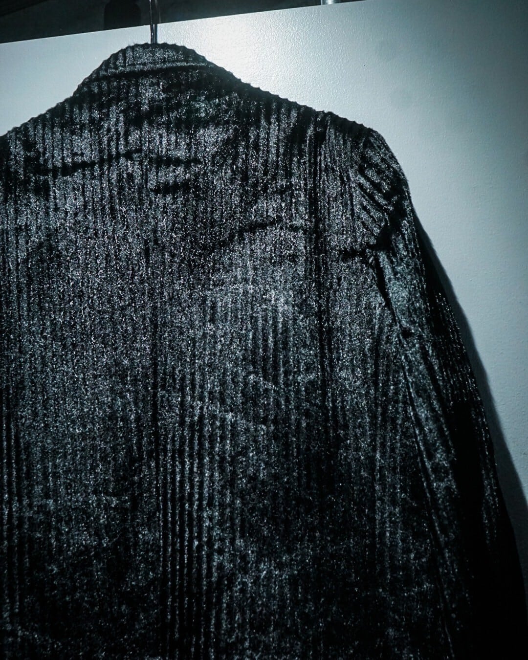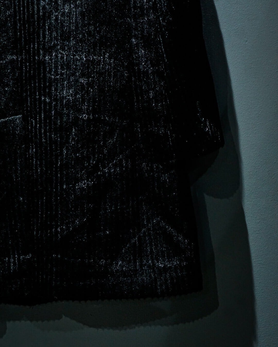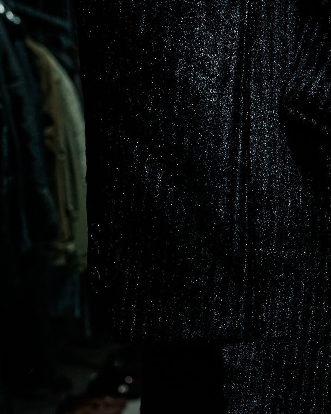 光の当たり加減で鈍く光沢を放つブラックベロアを用いたチェスターコート。