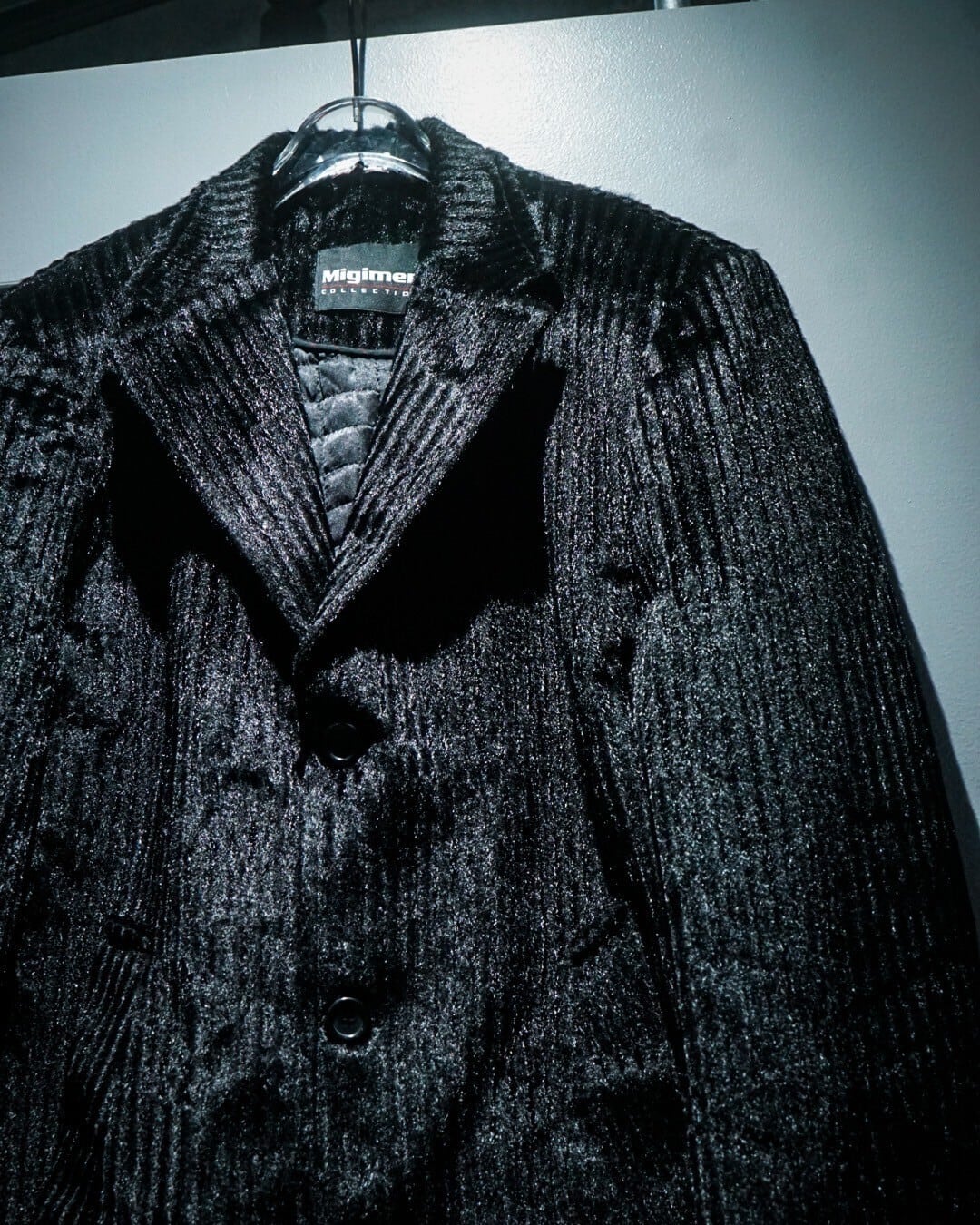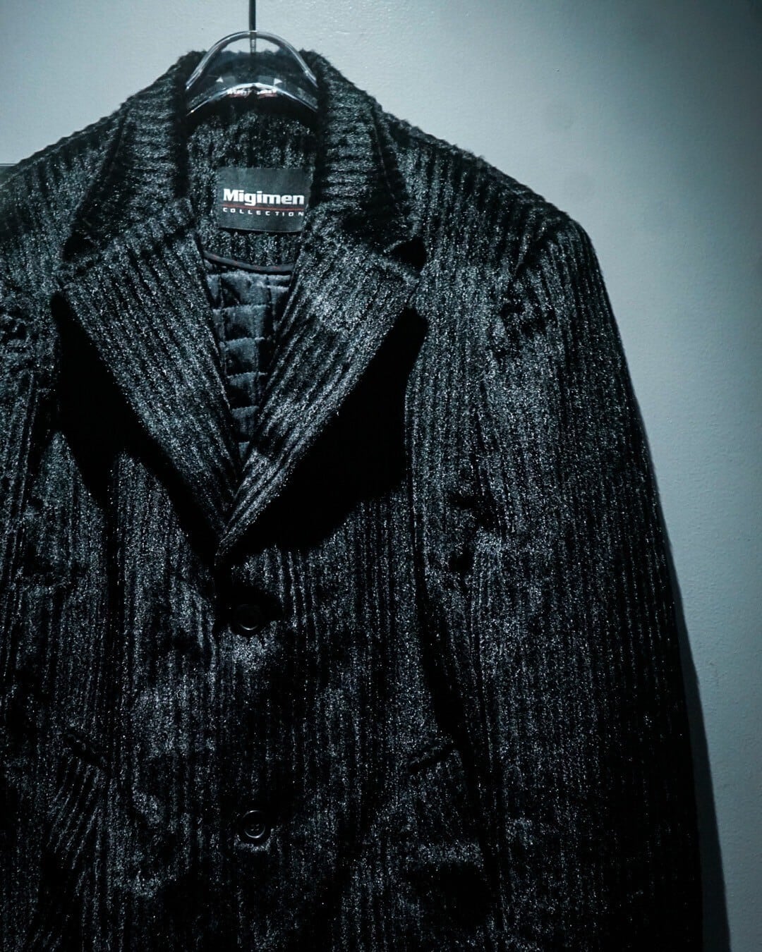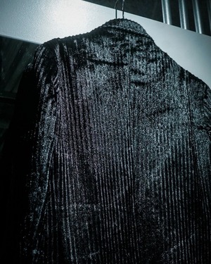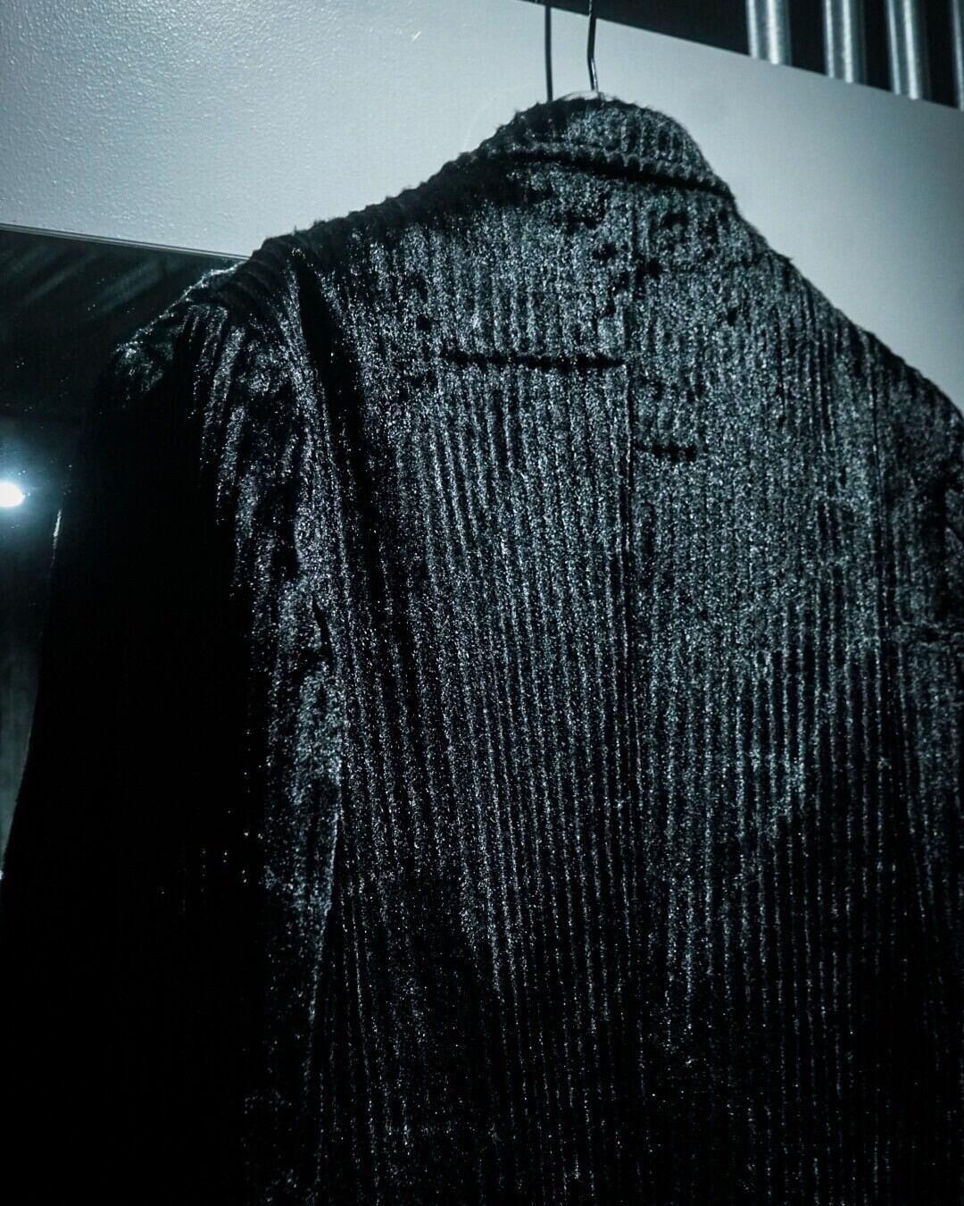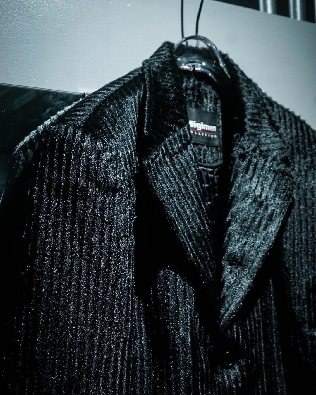 光の当たり加減で鈍く光沢を放つブラックベロアを用いたチェスターコート。