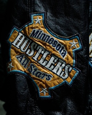 ハリ、タフさのある上質なブラックレザーのボディをベースに、スポーツチーム等のワッペンをカスタムで載せたバーシティタイプのレザージャケット。