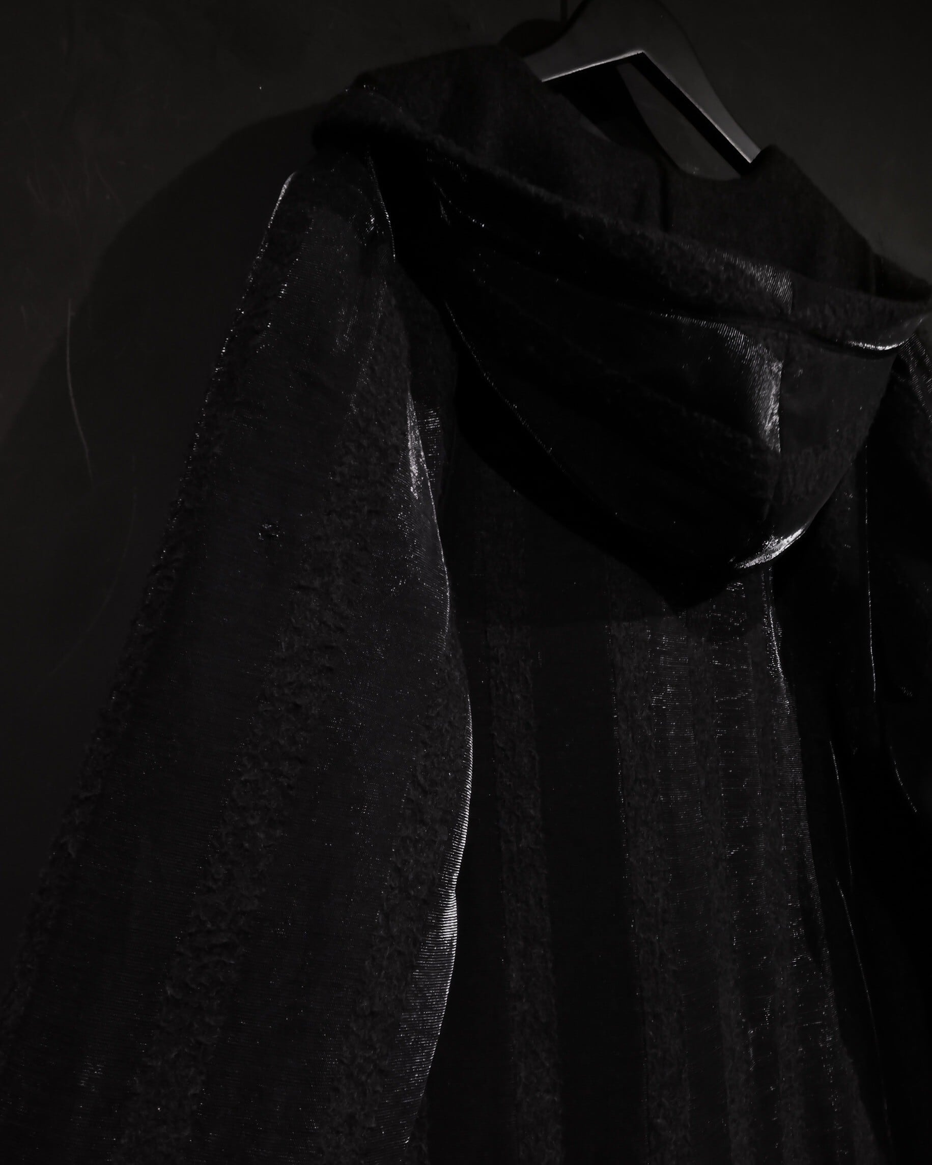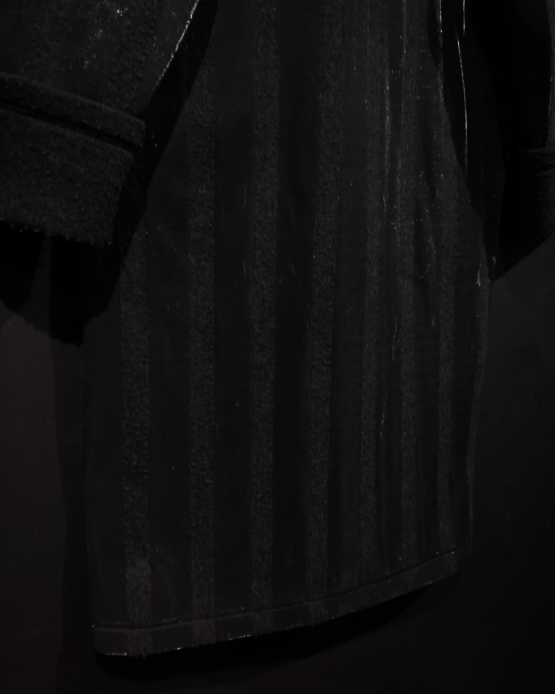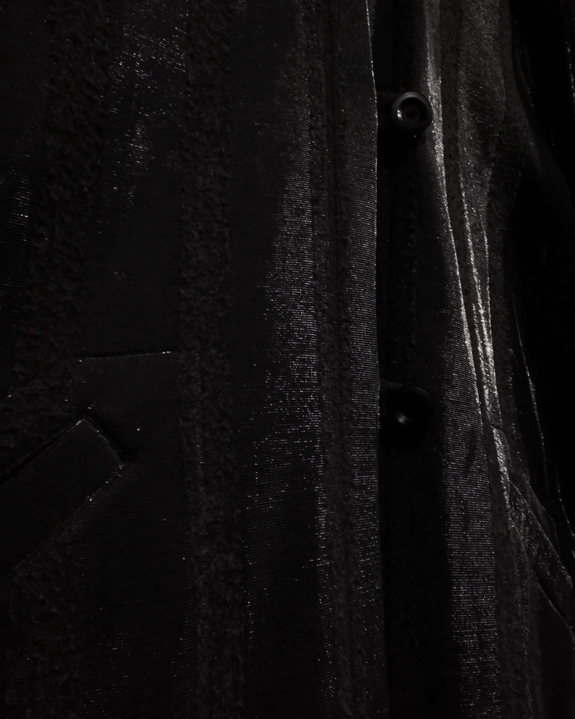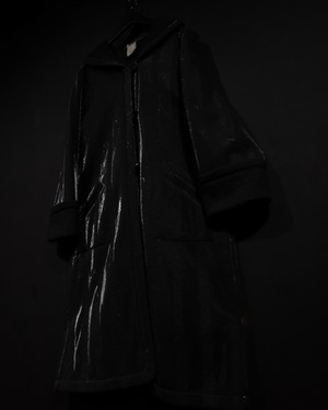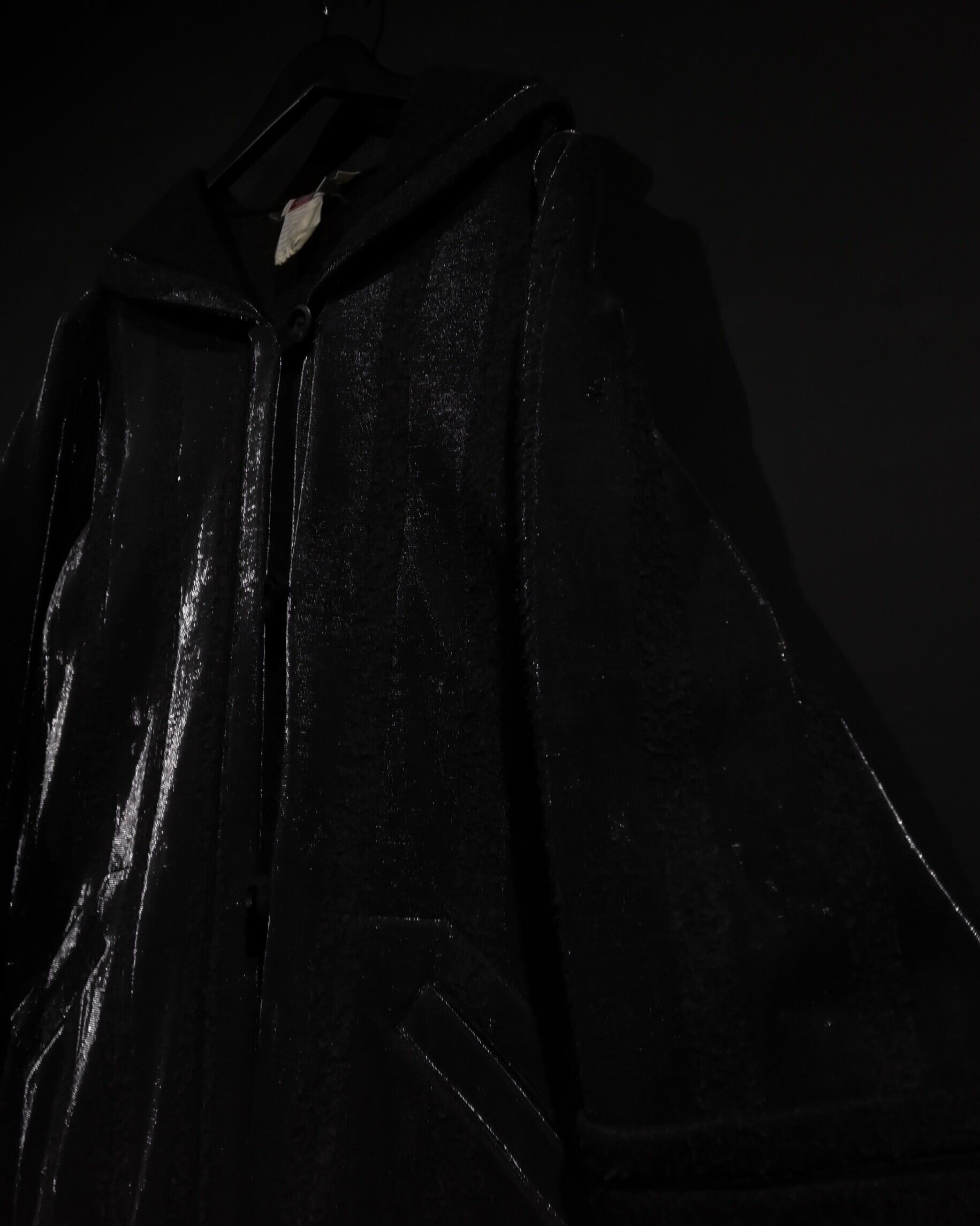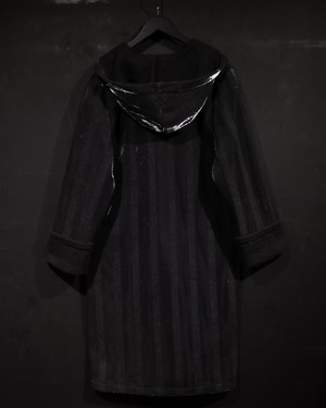 ブラックとグレーのストライプ柄の中に、シルバーの糸を織り込むことにより、独特な雰囲気を醸し出すコート。