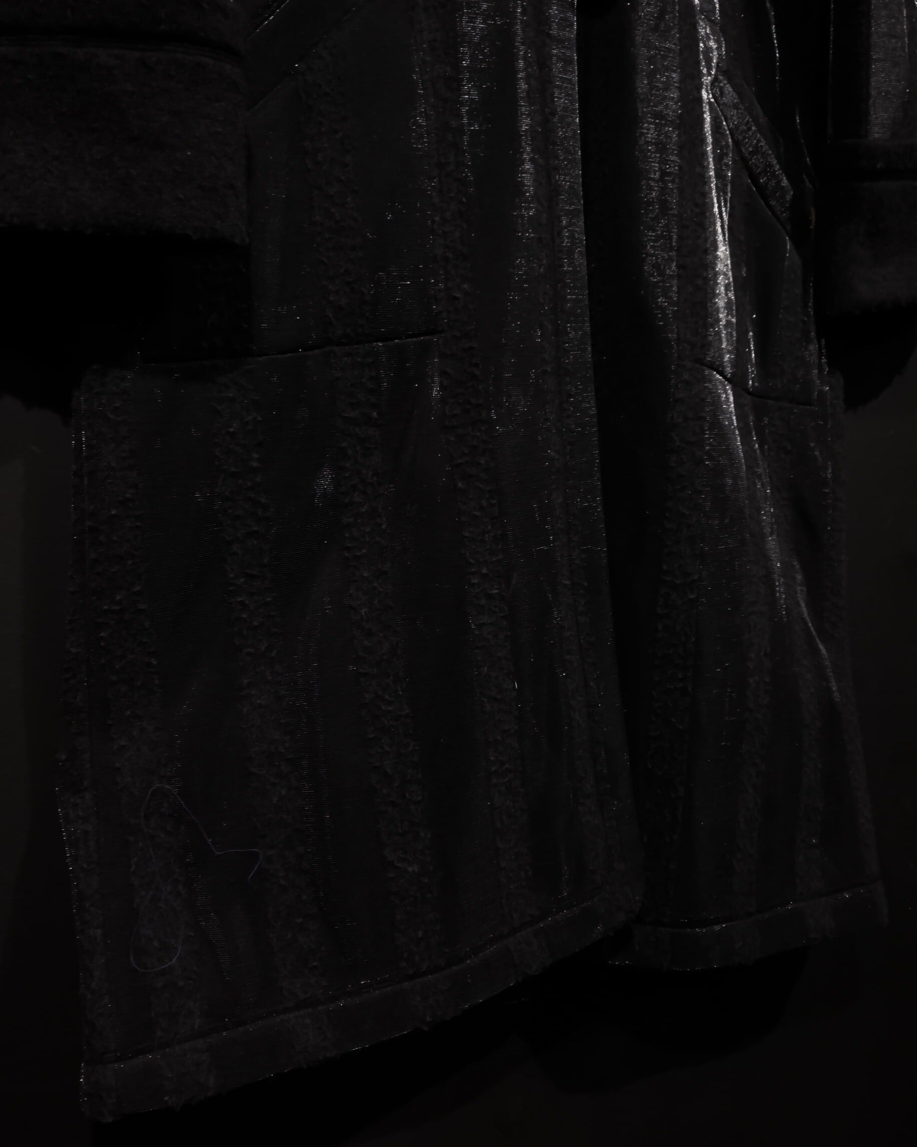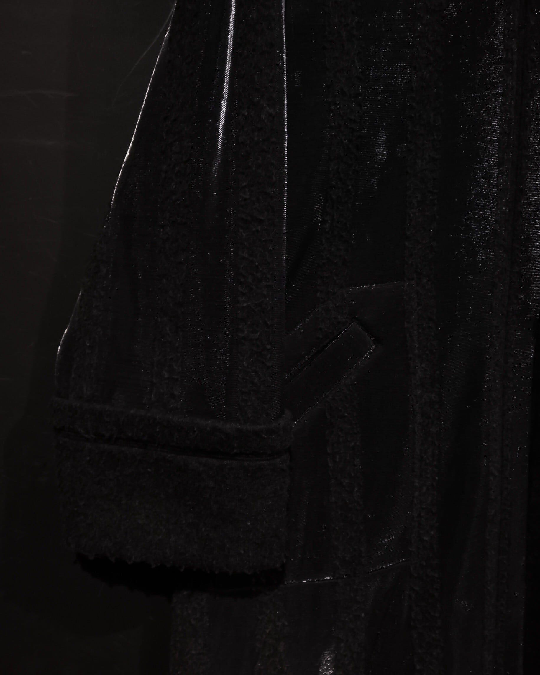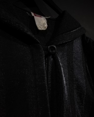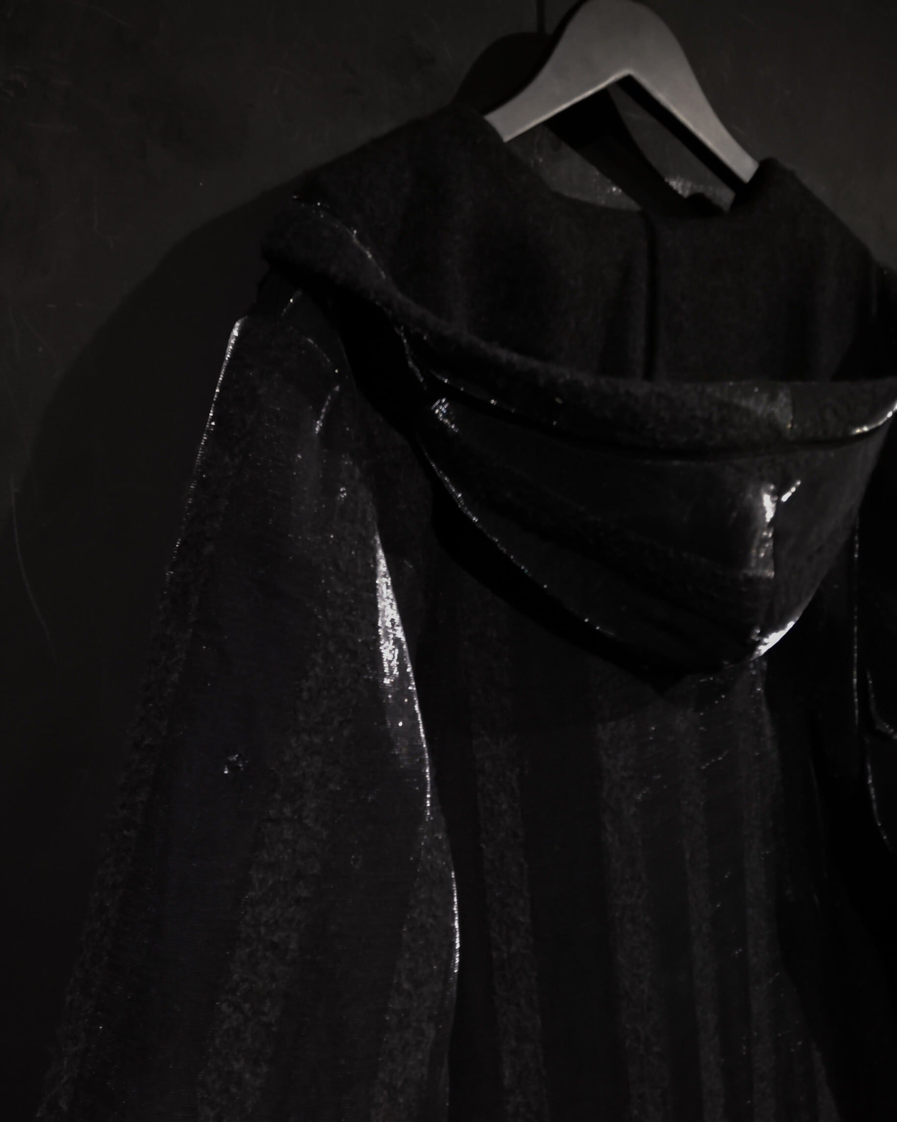 ブラックとグレーのストライプ柄の中に、シルバーの糸を織り込むことにより、独特な雰囲気を醸し出すコート。