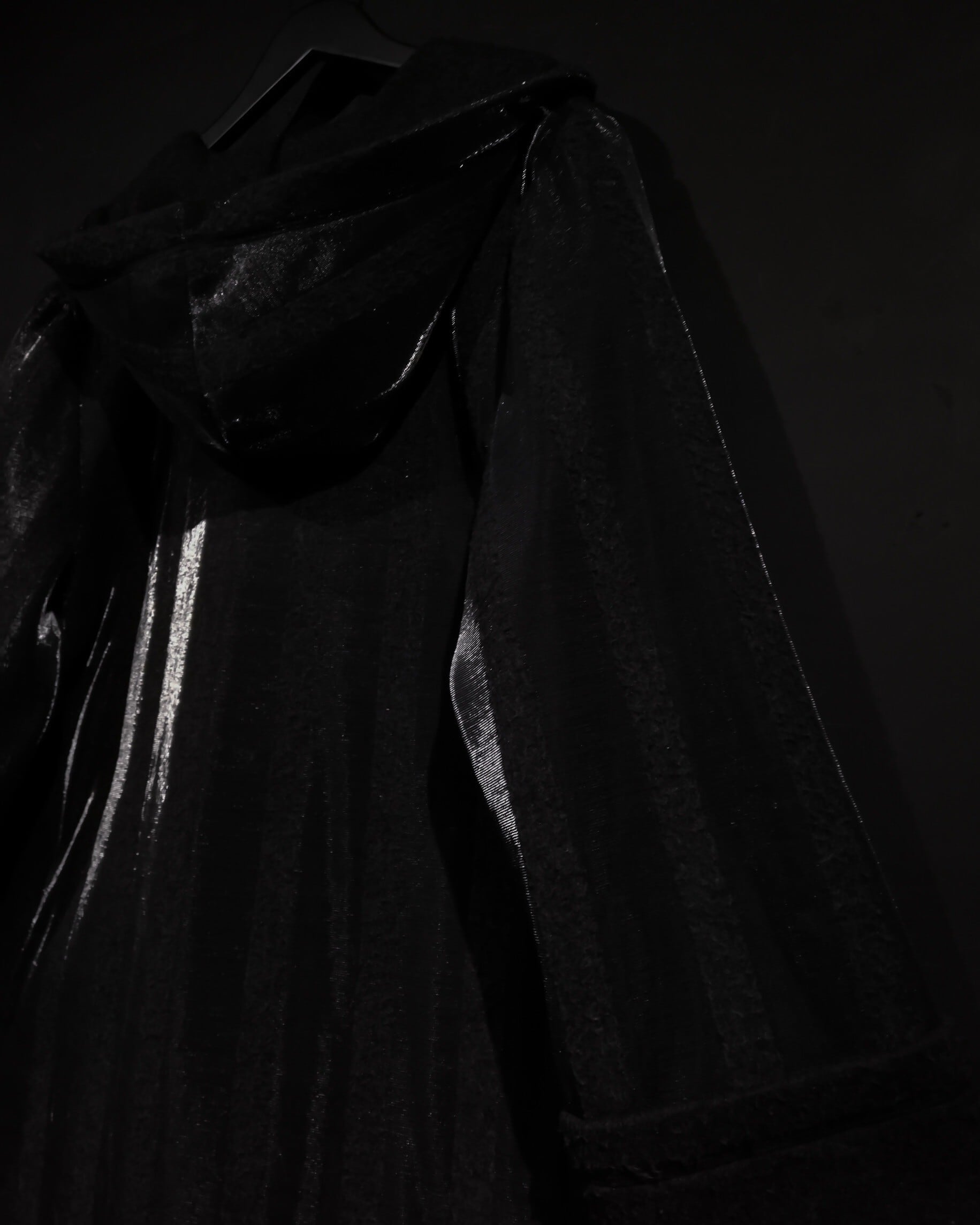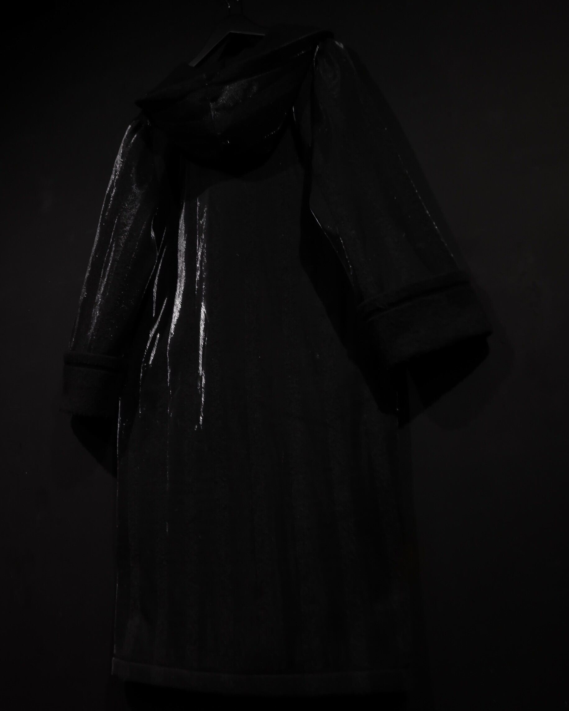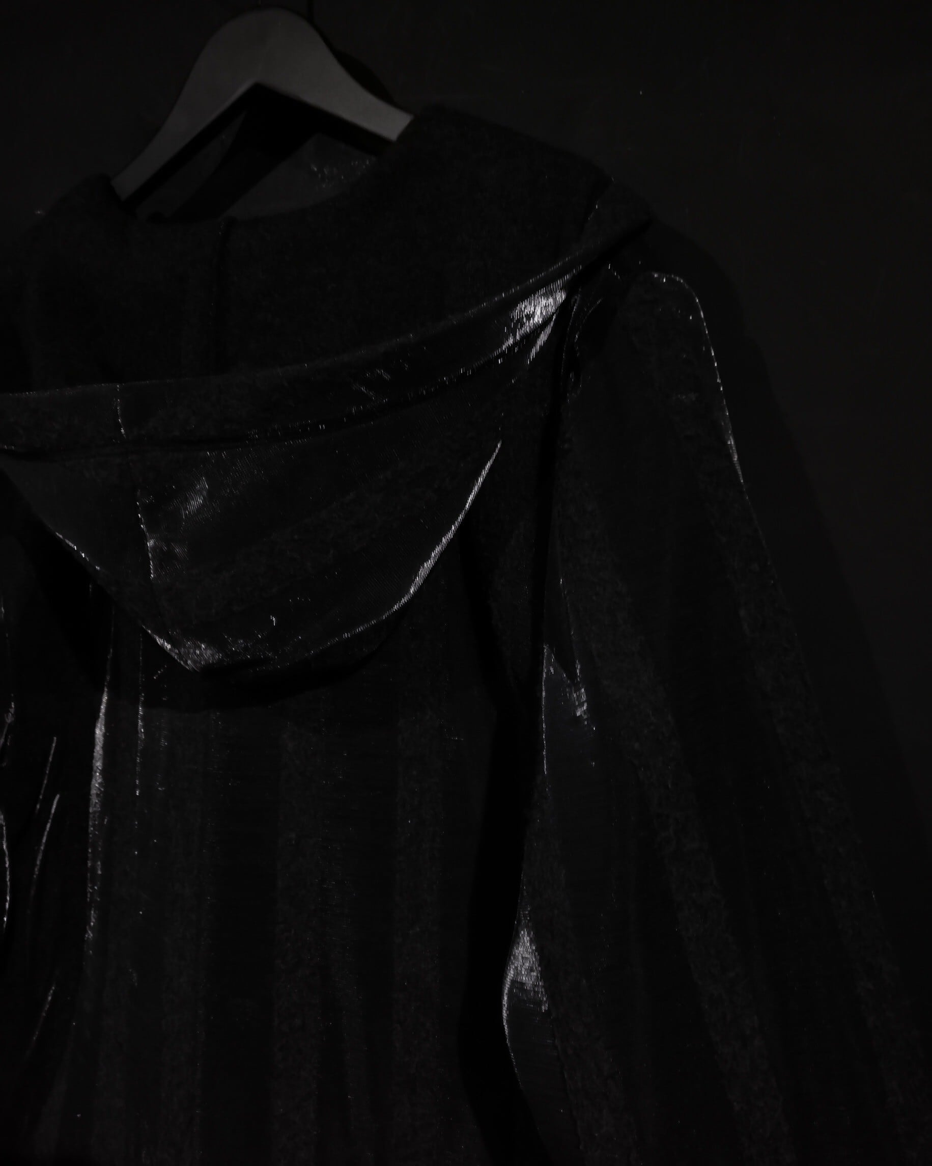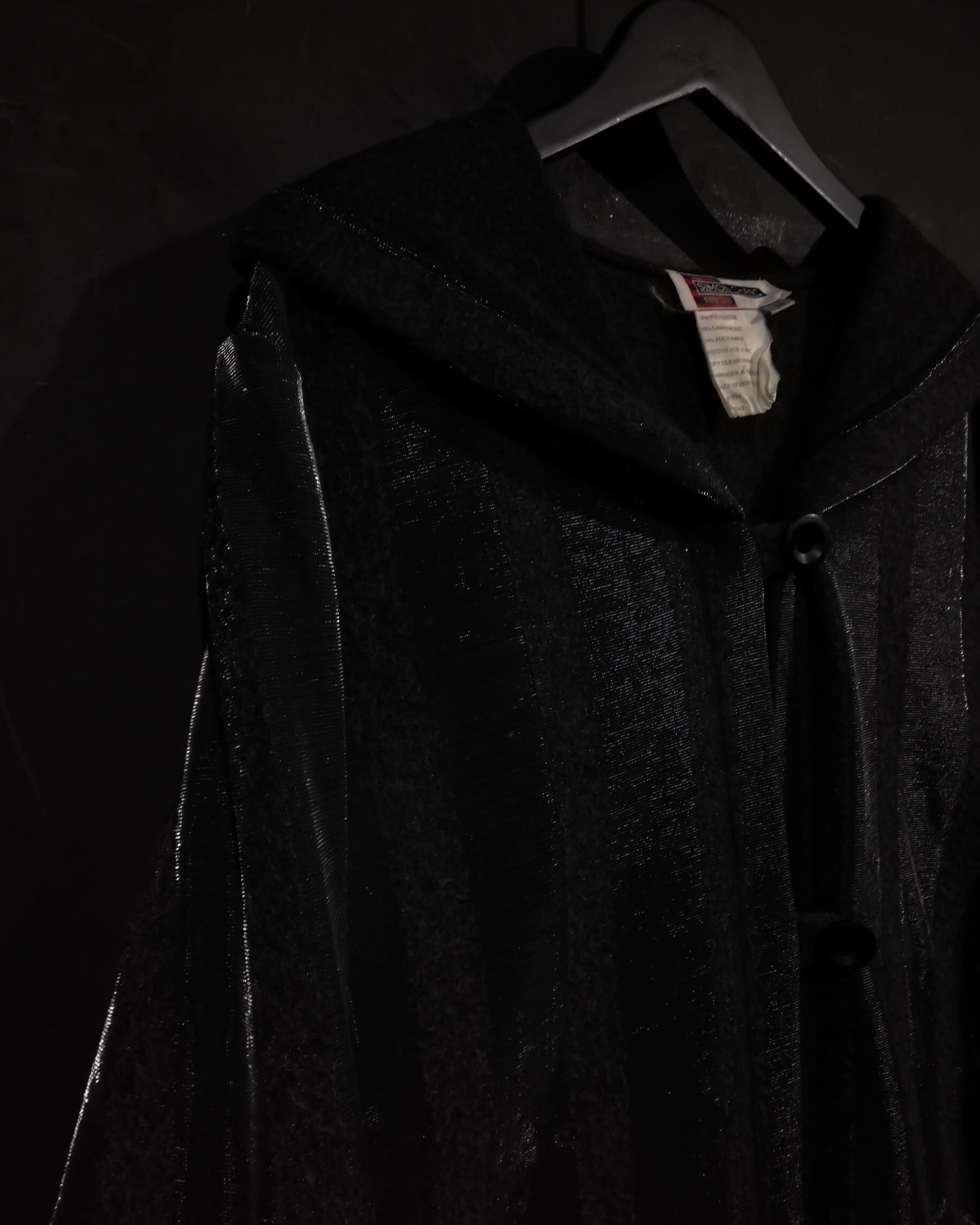ブラックとグレーのストライプ柄の中に、シルバーの糸を織り込むことにより、独特な雰囲気を醸し出すコート。