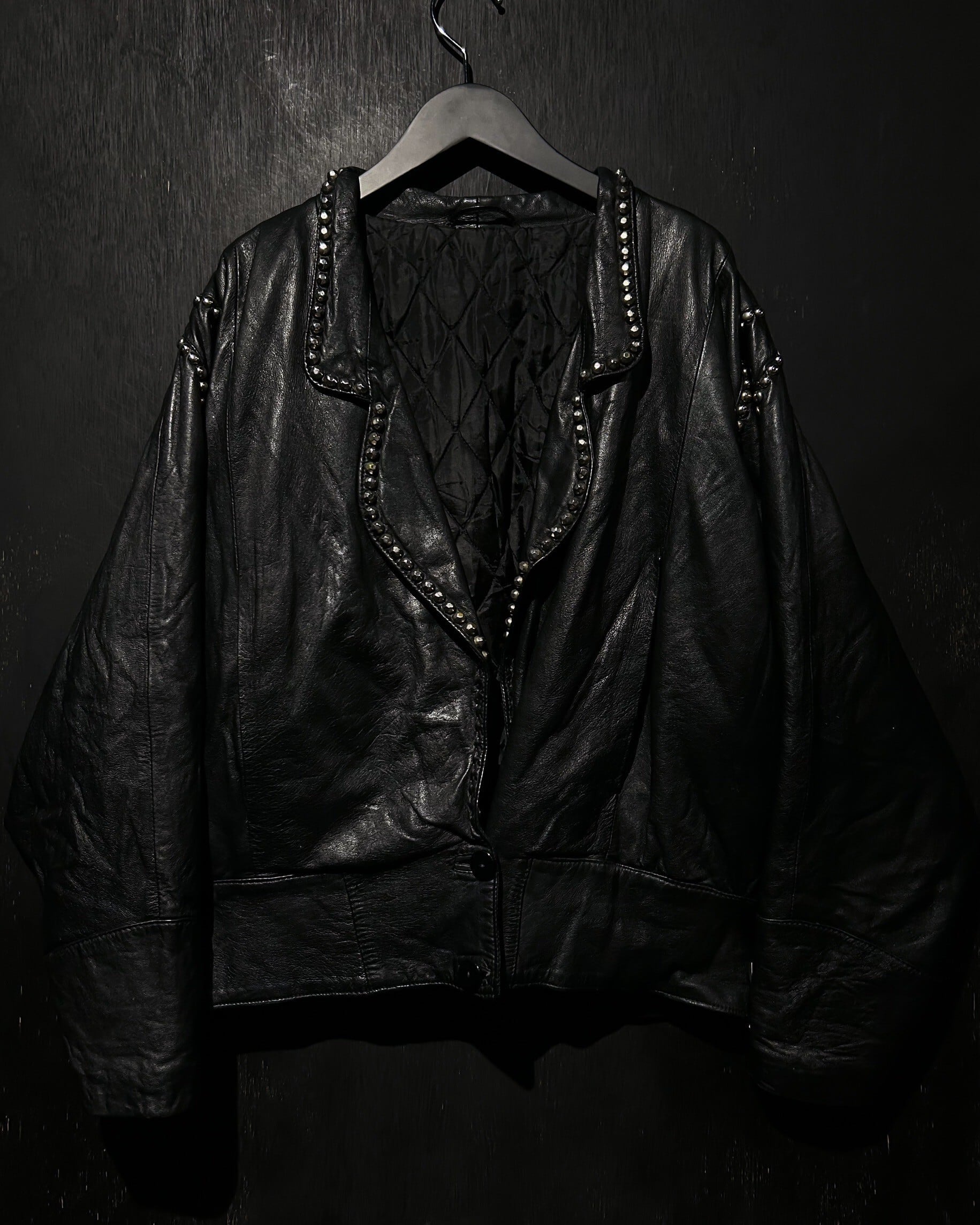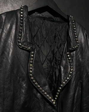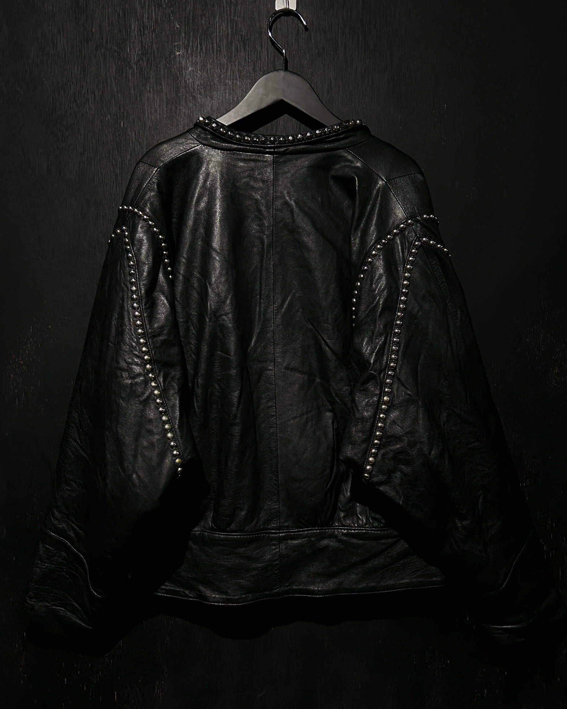 武骨さとずっしりとした重厚感のある上質なブラックレザーのボディに、光り輝くスタッズがラペルやアームの各部にあしらわれた、存在感抜群のレザージャケット。