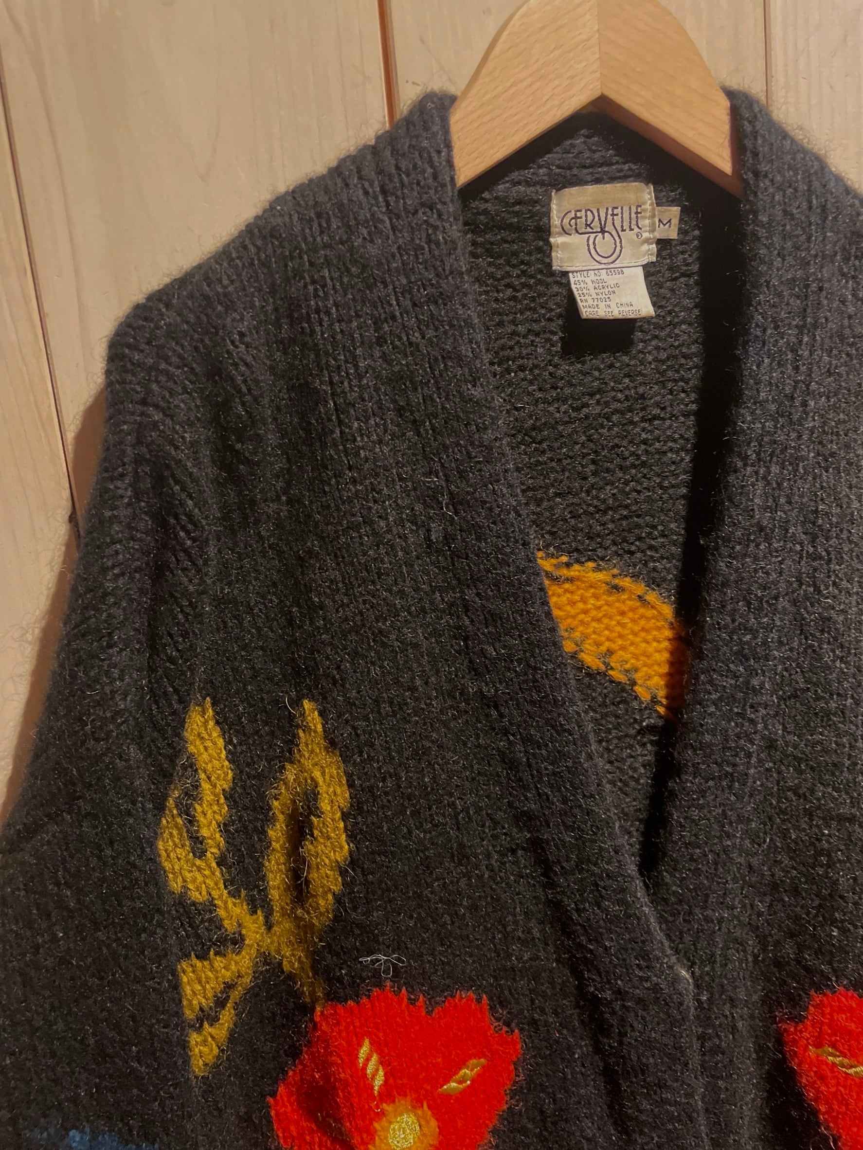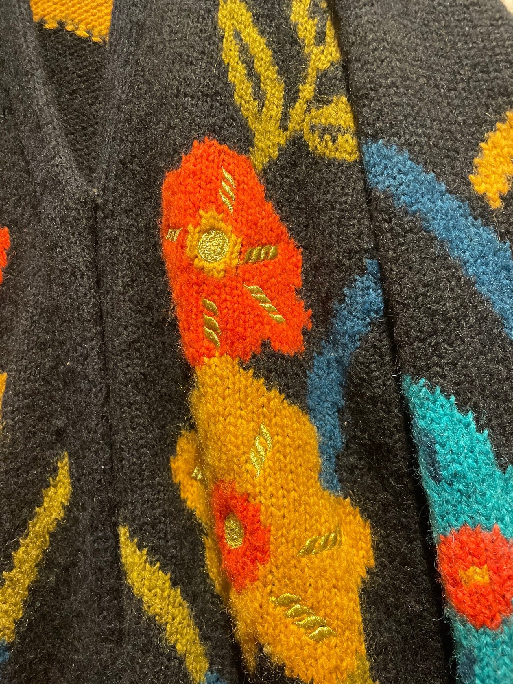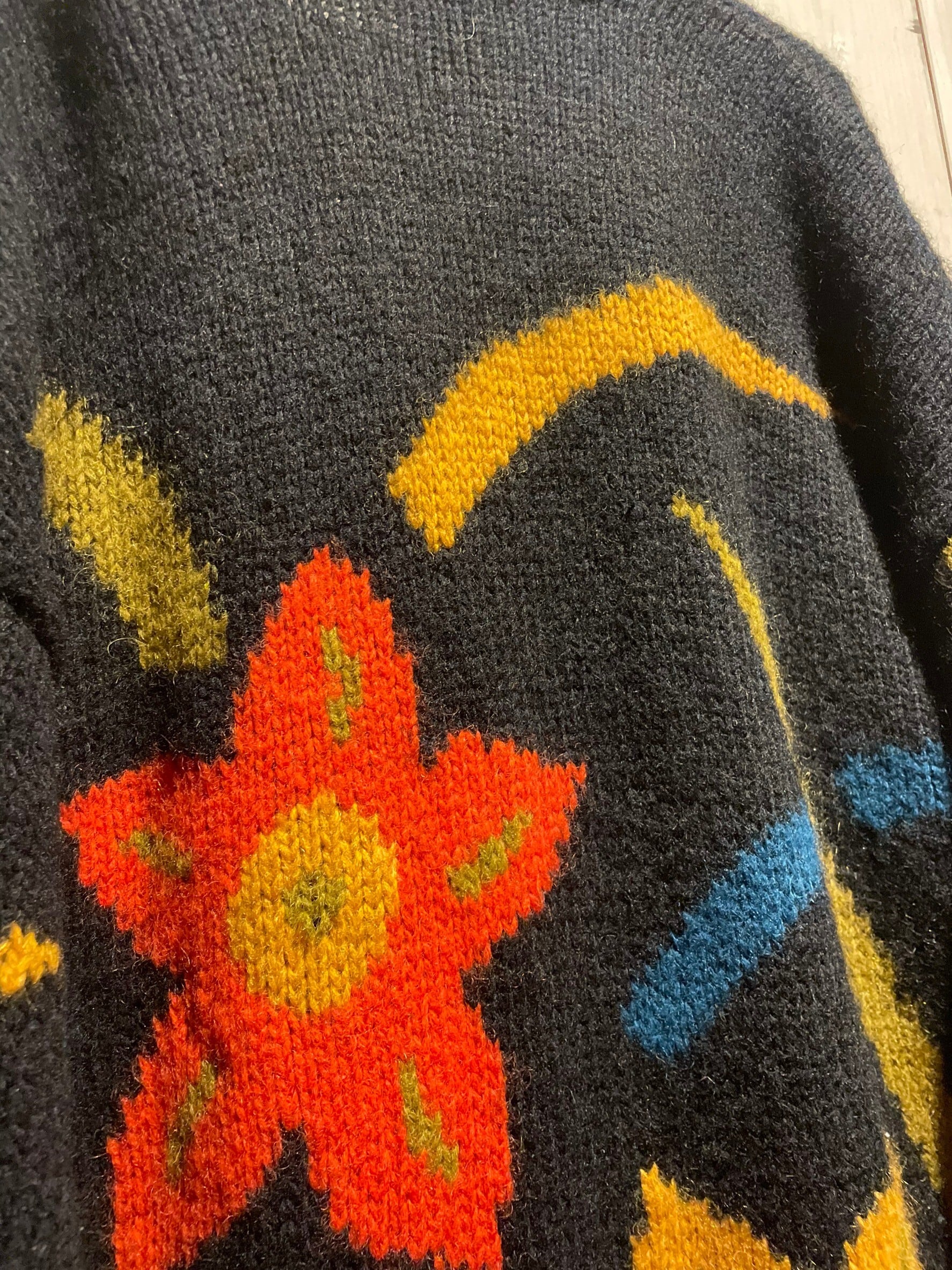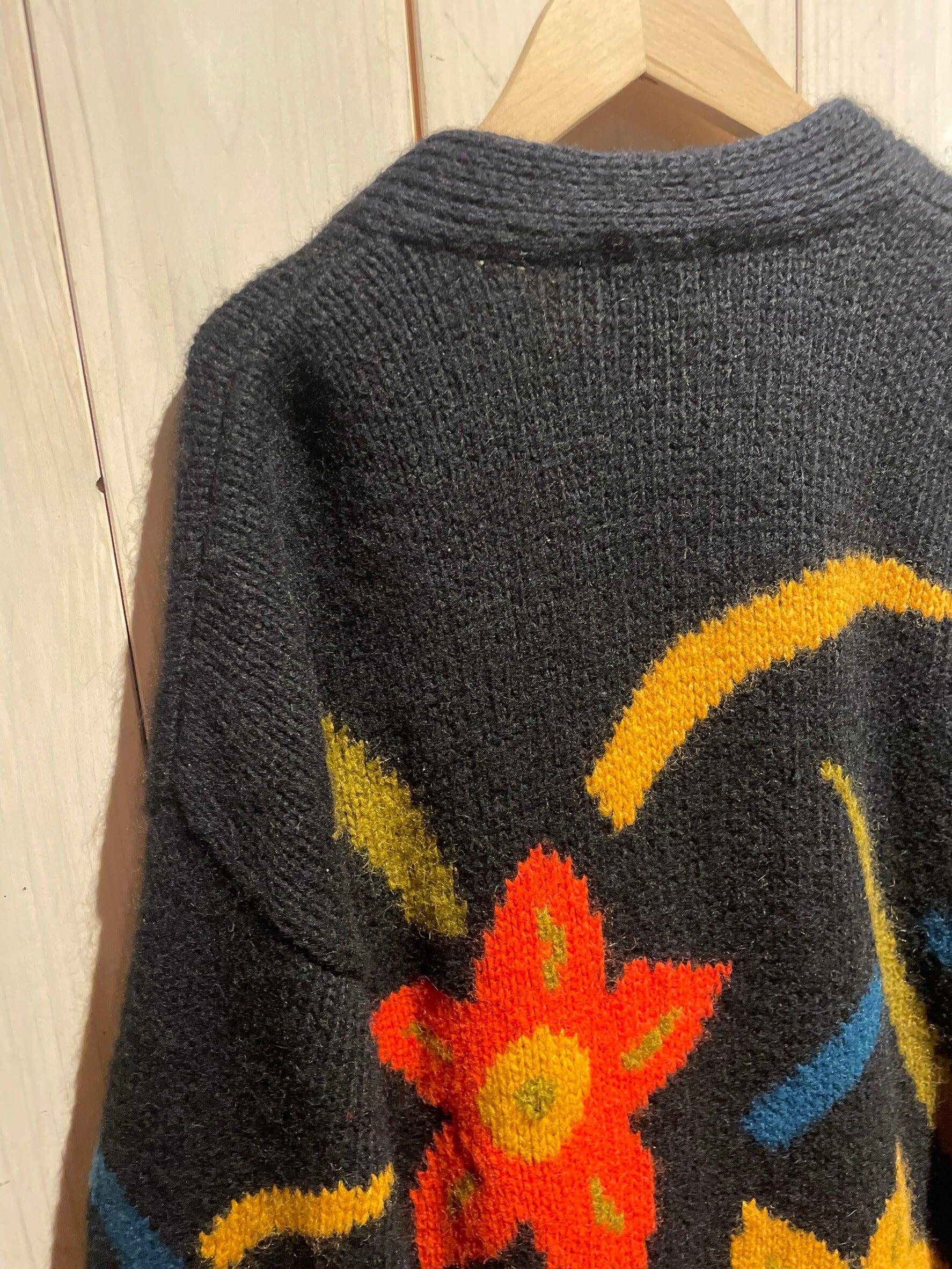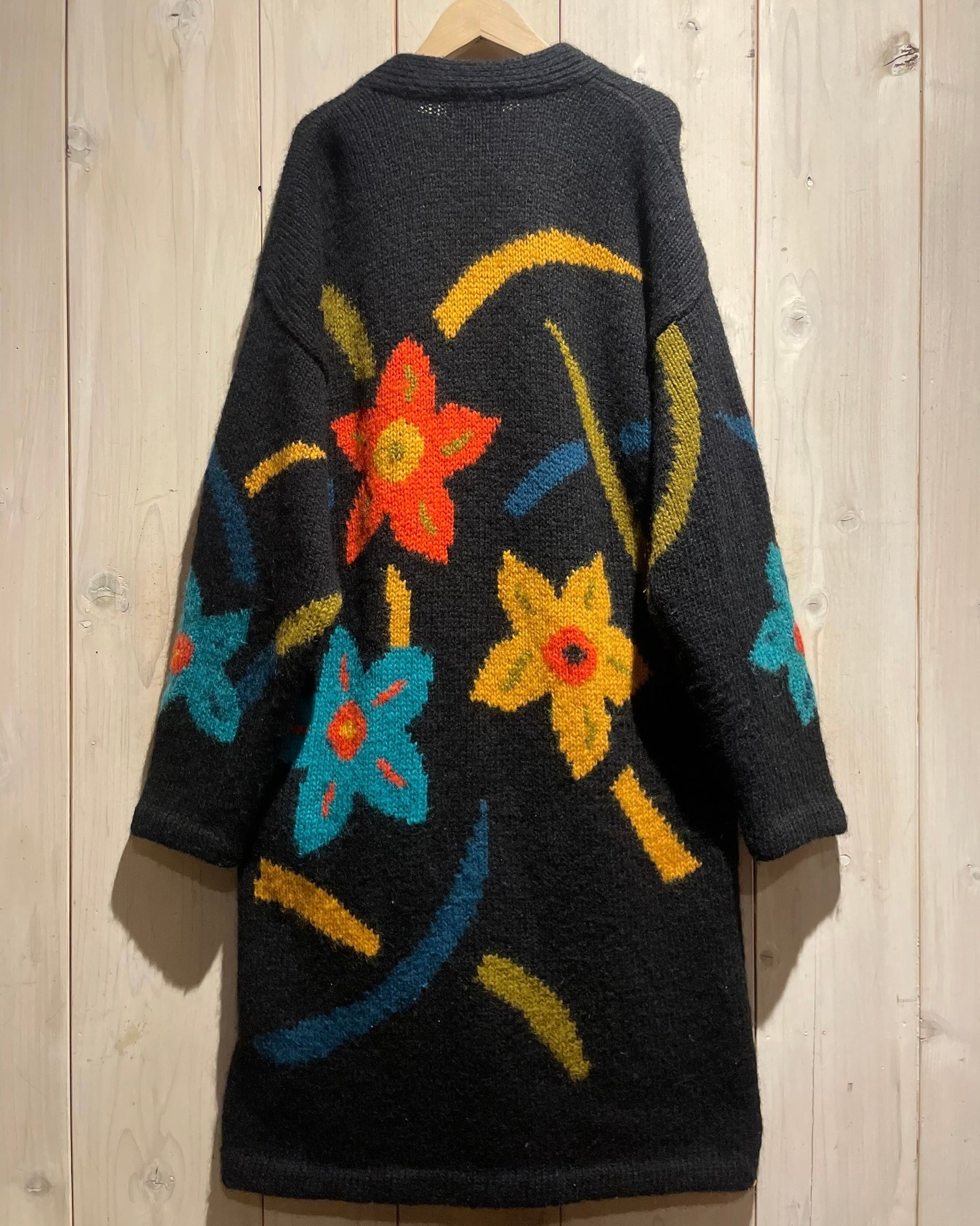 柔らかく程よく肉厚なニット素材に、赤×黄×青で美しい花柄を載せたニットコート。この手のアイテムがヴィンテージでは稀少ですが、デザインやサイジング、コンディションを考慮すると本当に無い…