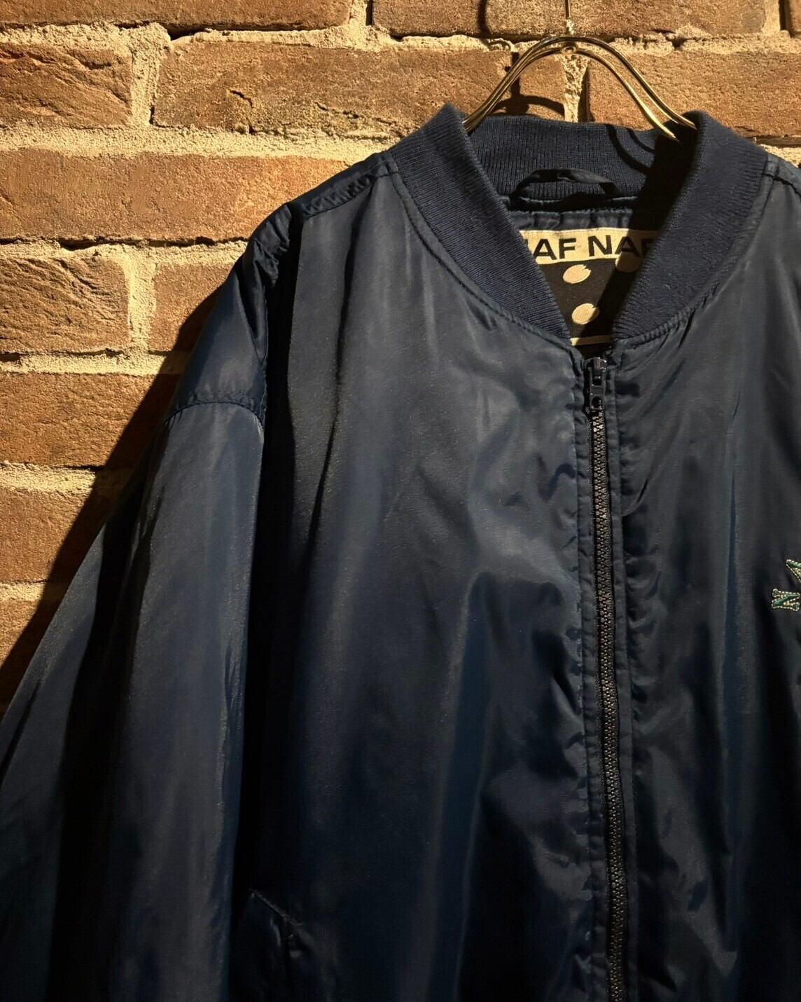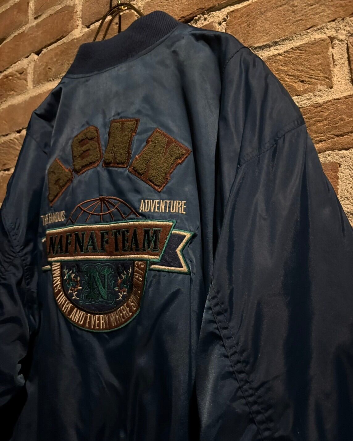 こちらは鮮やかなブルーネイビーのナイロン素材をベースにブランドオリジナルのワッペンや刺繍といった装飾が施されたMA-1型のボンバージャケット。