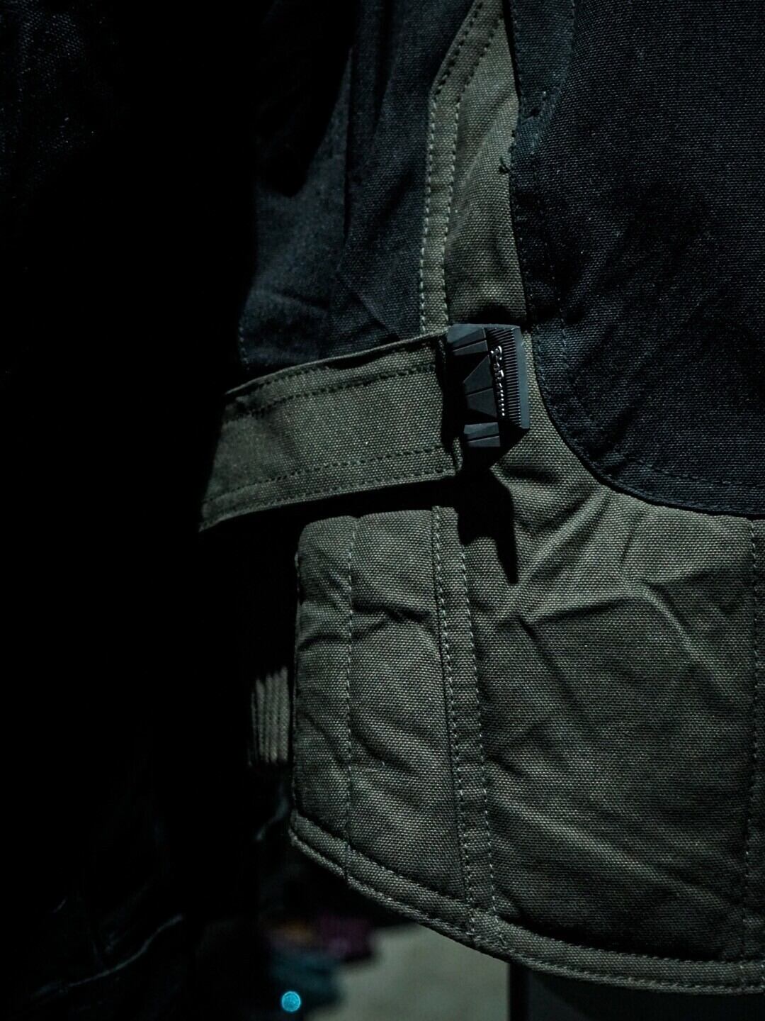 随所のジップポケットに、強度を高めるための生地の切り替え、エルボーパッチ、ウエストサイドのベルト等、機能面ではもちろんのこと、デザインとしても活かされていますね。