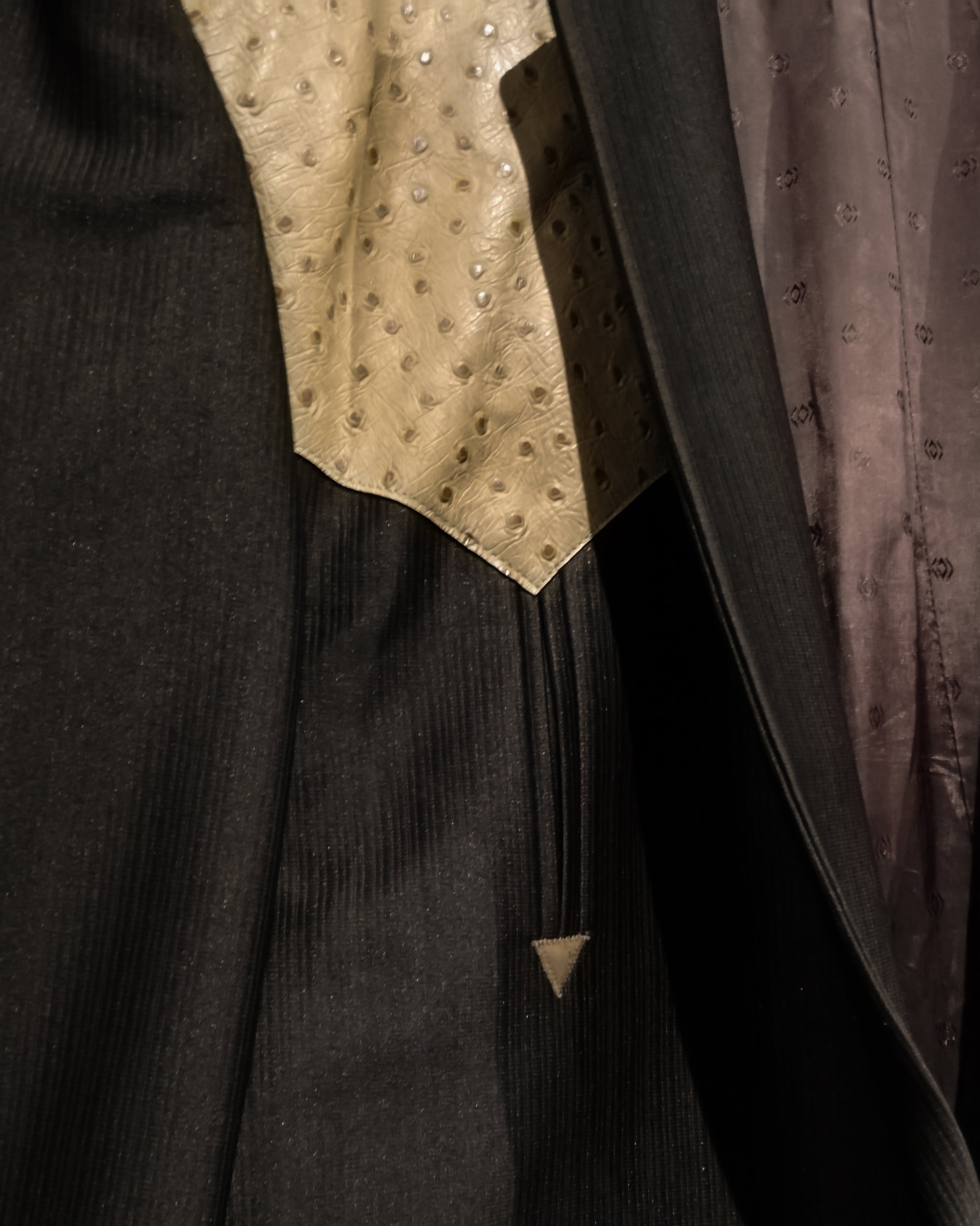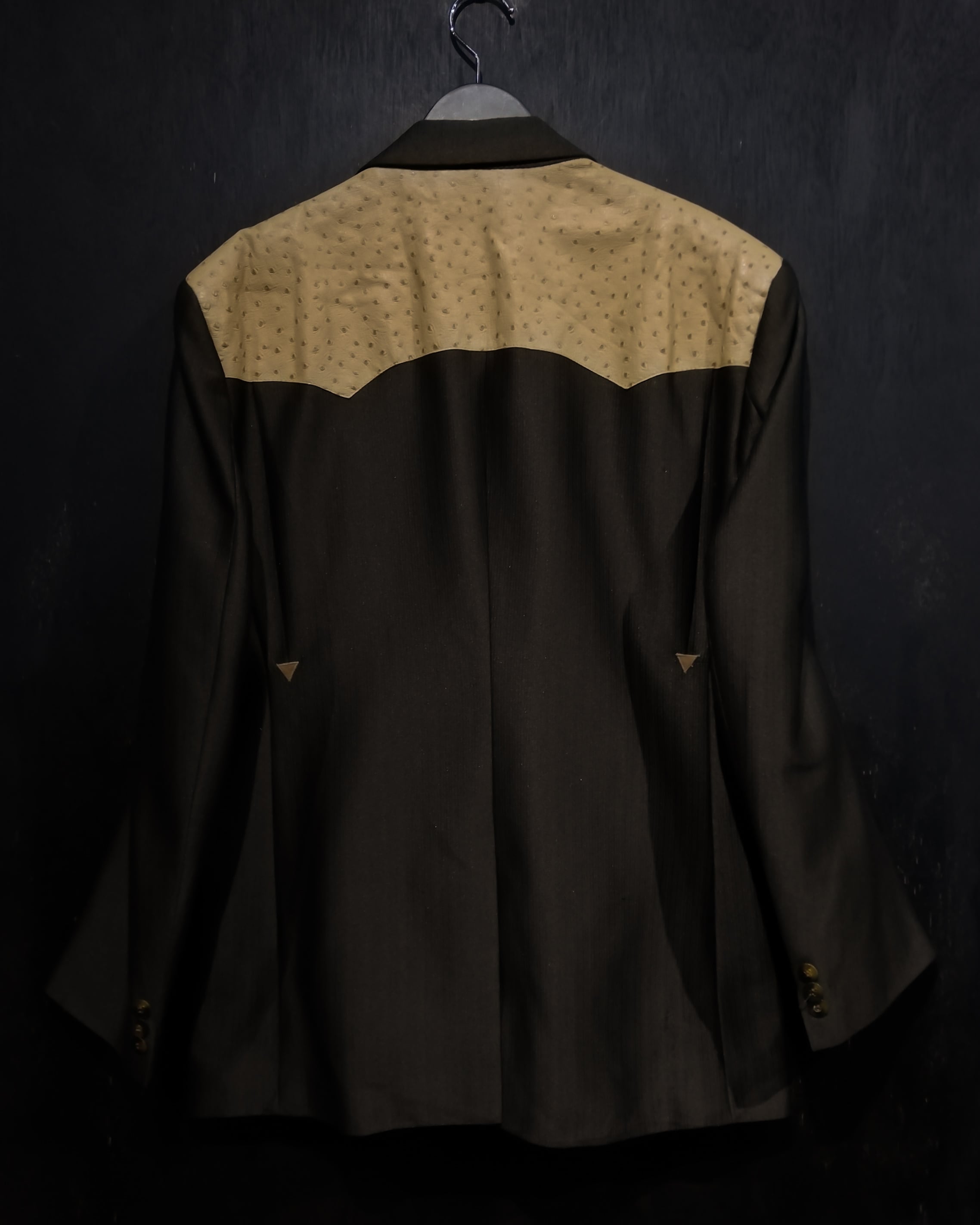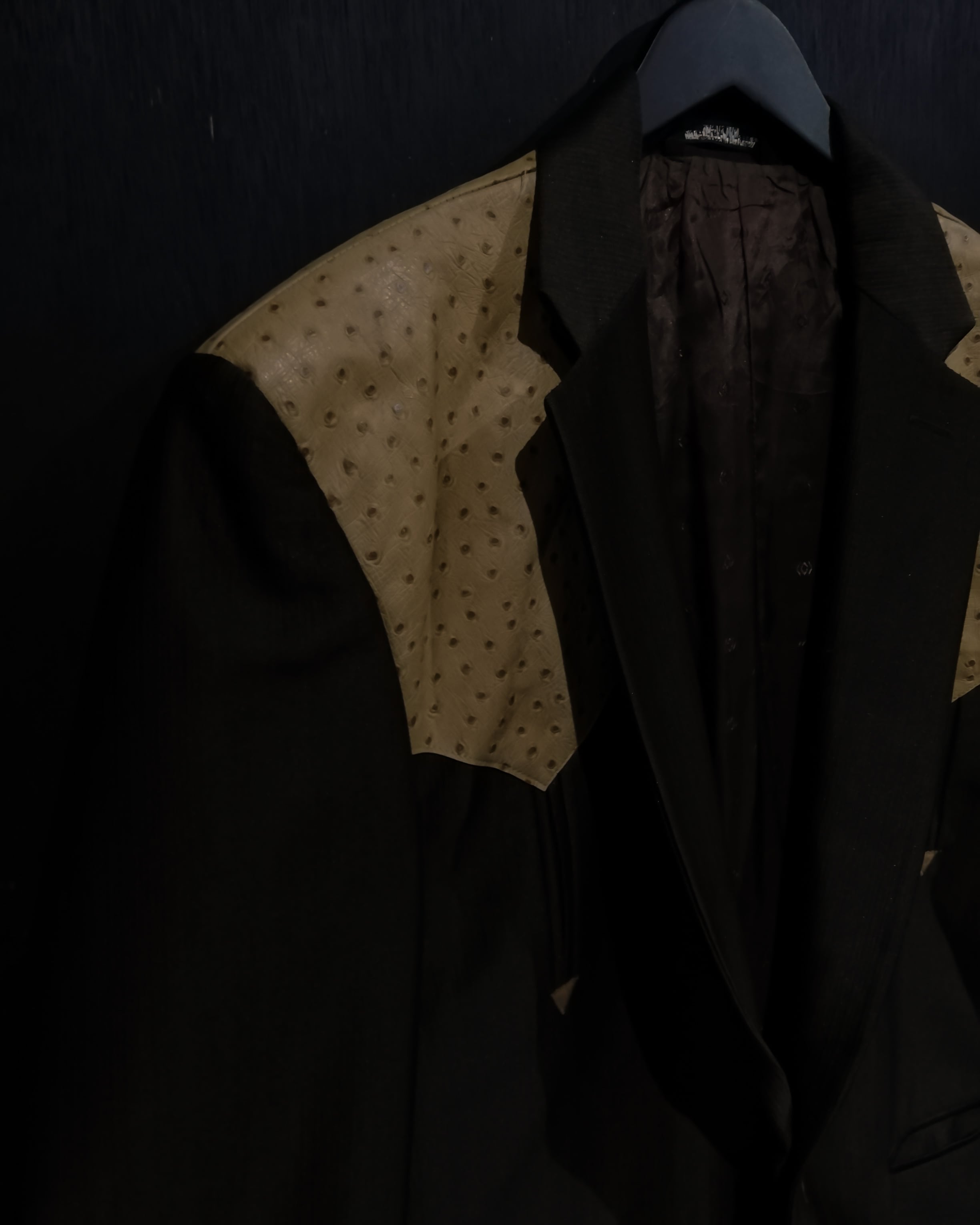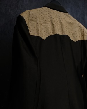稀有なウエスタン仕様のテーラードジャケットに、オーストリッチ(ダチョウ革) を切り替えた一着。ボディは鈍く光沢を帯びながらもしっとりとした深みのある上質な素材で着用感も軽い為、ラグジュアリーストリートなルックスで高まる気分とは裏腹に、楽~にデイリーに着れるのも嬉しい。