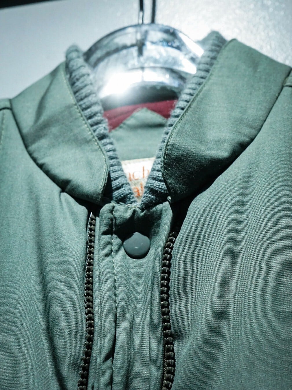 コットンポリのハリのある生地を用いて、ミリタリーのボンバージャケットに落とし込んだ1着。