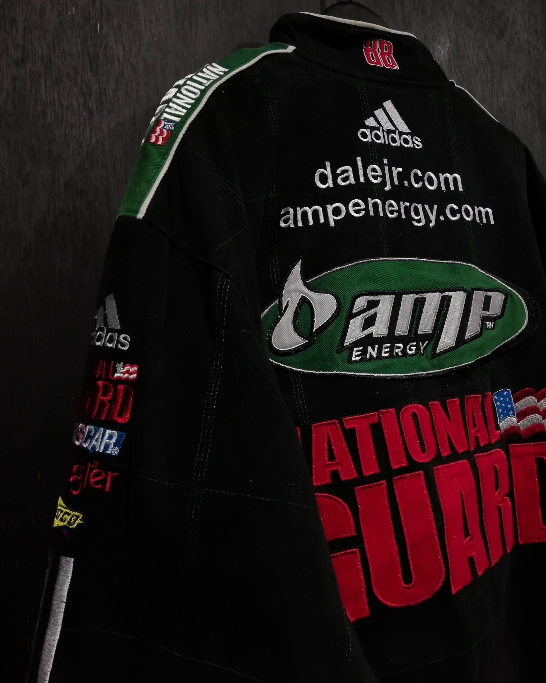 ブラックボディをベースに、フロントにはマウンテンデュー、adidas、NASCARなど協賛のワッペンやロゴを施したレーシングジャケット。