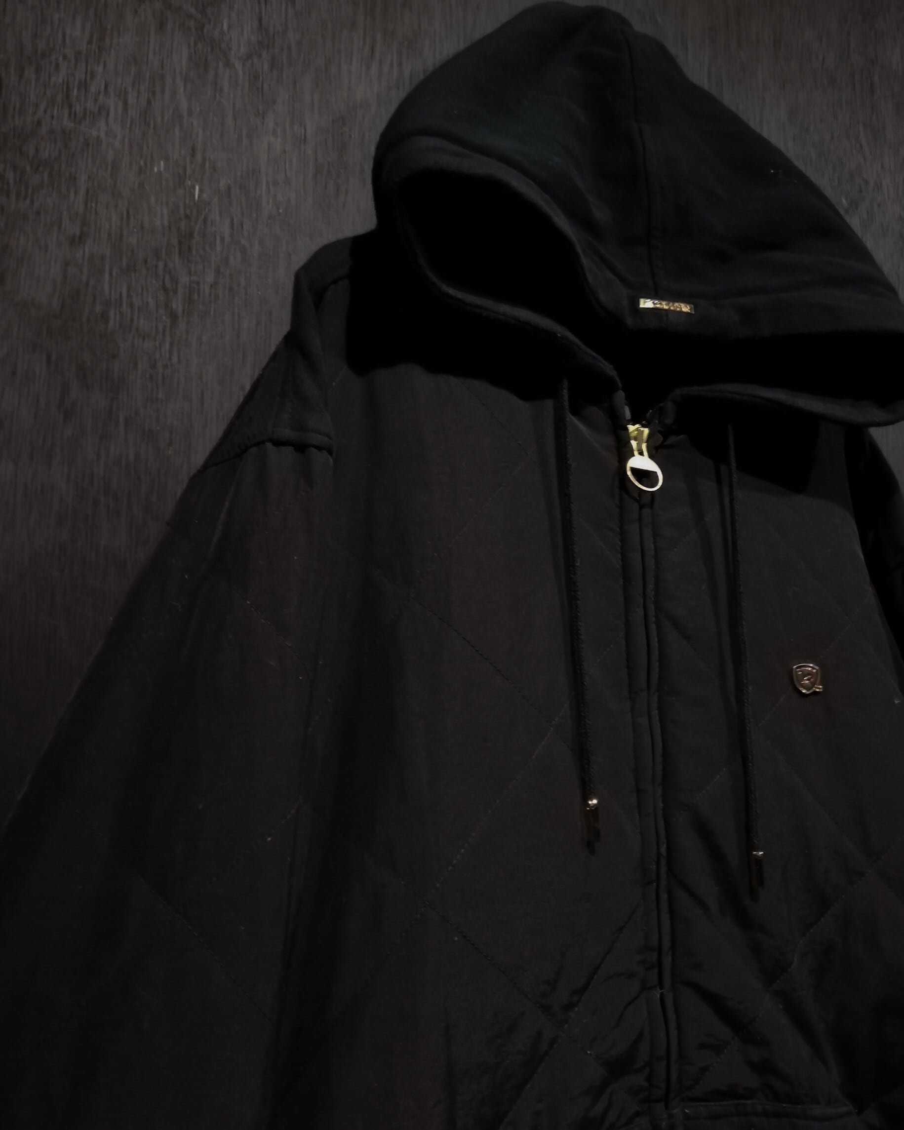 オールブラックのカラーリングで、身頃とアームにキルティングを切り替えたフーディジャケット。