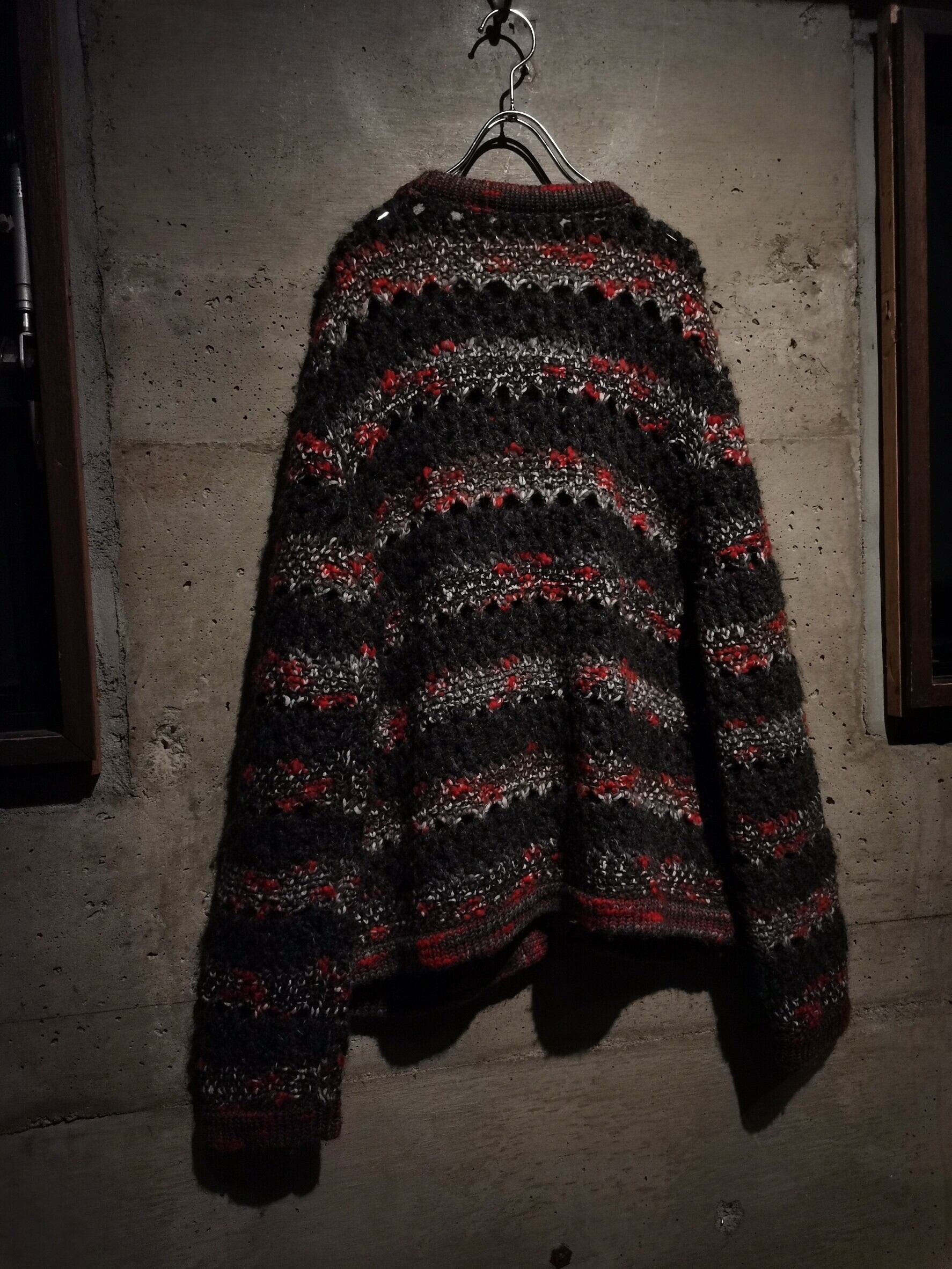 巧みなニッティングによってボディに表現されたボーダー柄、首元、前たてや裾のグラデーション、トグルボタンに用いられていたレザーなど、随所のディテールの作り込みも素晴らしい、、、