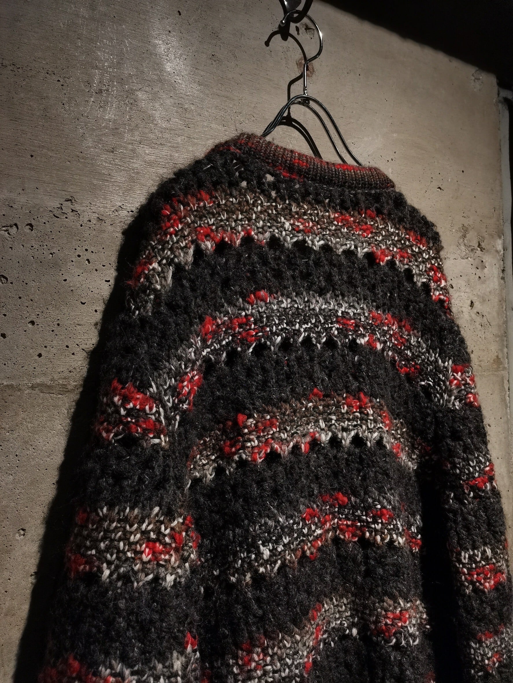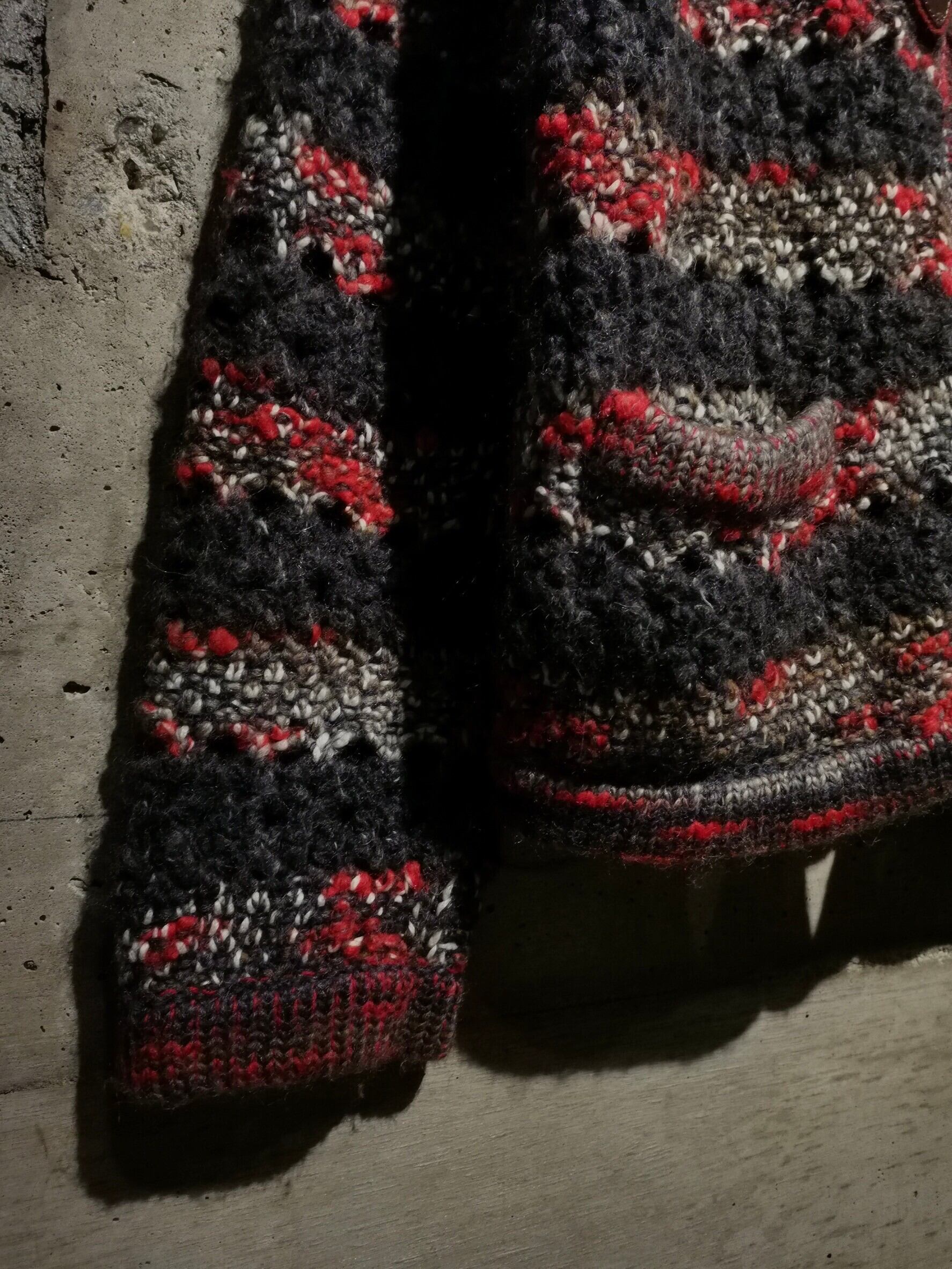 ザックリとローゲージで編まれた、赤、グレー、白の3色をベースとしたニットボディに、ダッフルコートで用いられるトグルボタンをフロントに施したニットジャケット。