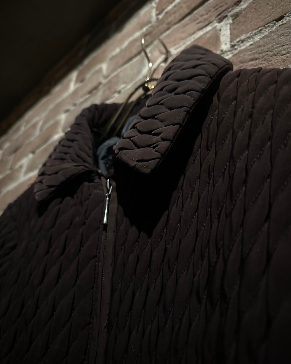 独特な凹凸があり、立体感のあるキルティングのボディにデタッチャブルなファー襟を施したジャケット。