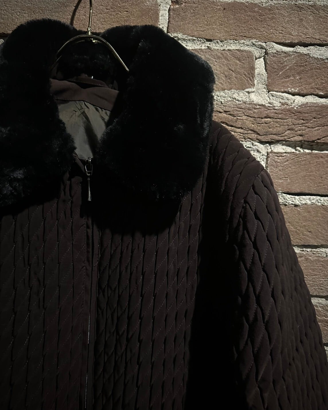 レトロなキルティングのボディに、ラグジュアリーなファー襟が合わさった当店らしい雰囲気を纏った1着に。