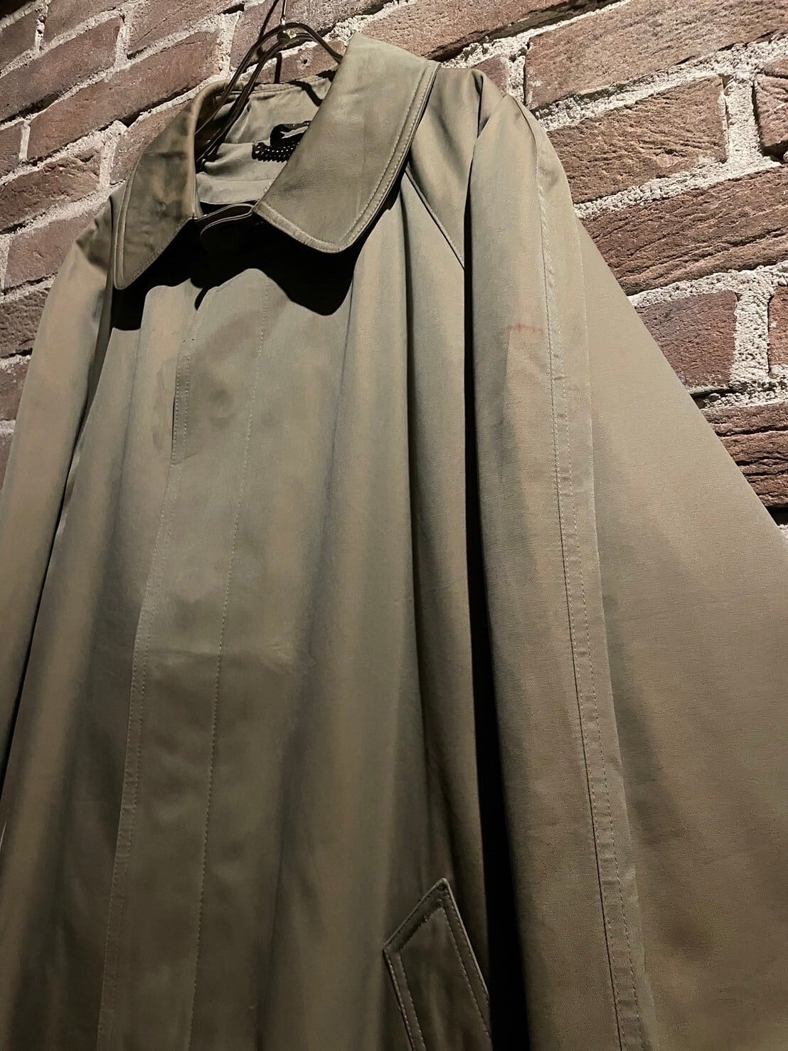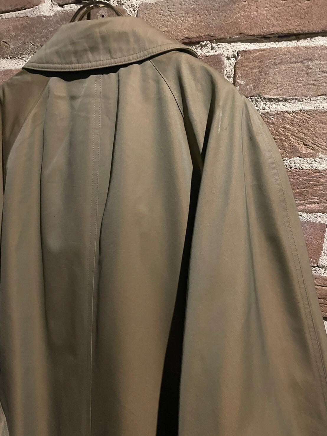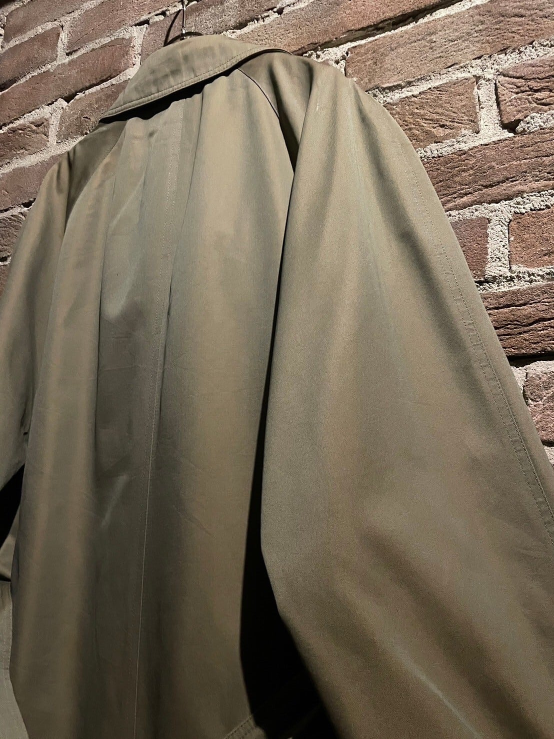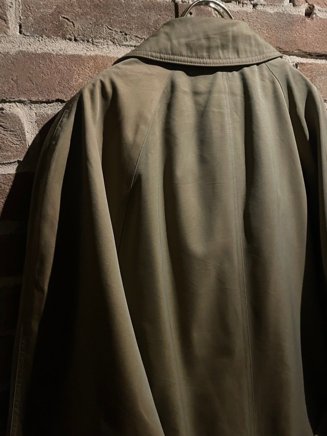 ベージュからグリーンへと角度によって見え方の変わる、美しい"玉虫"カラーで仕上げた80'sヴィンテージのステンカラーコート。