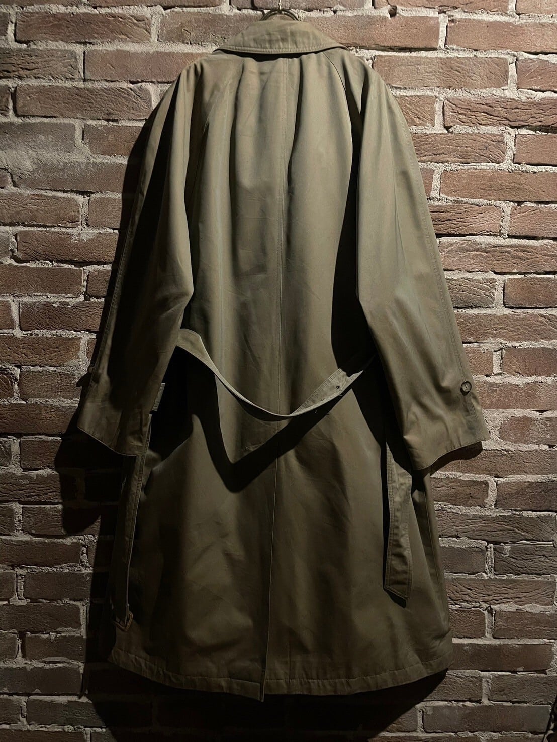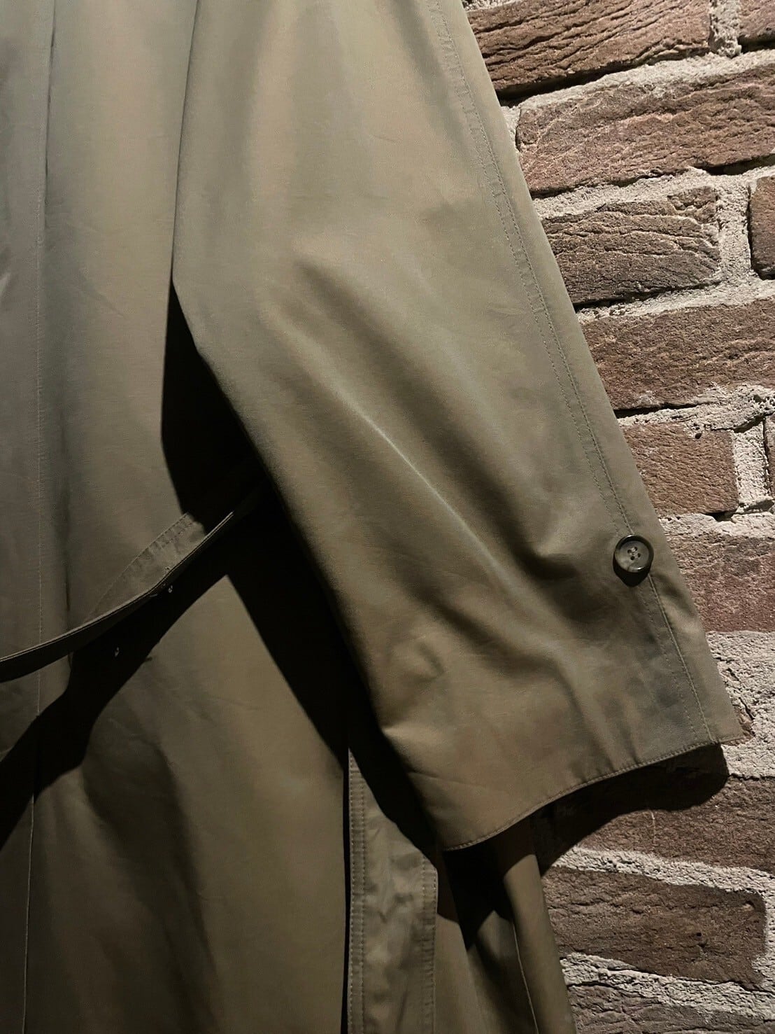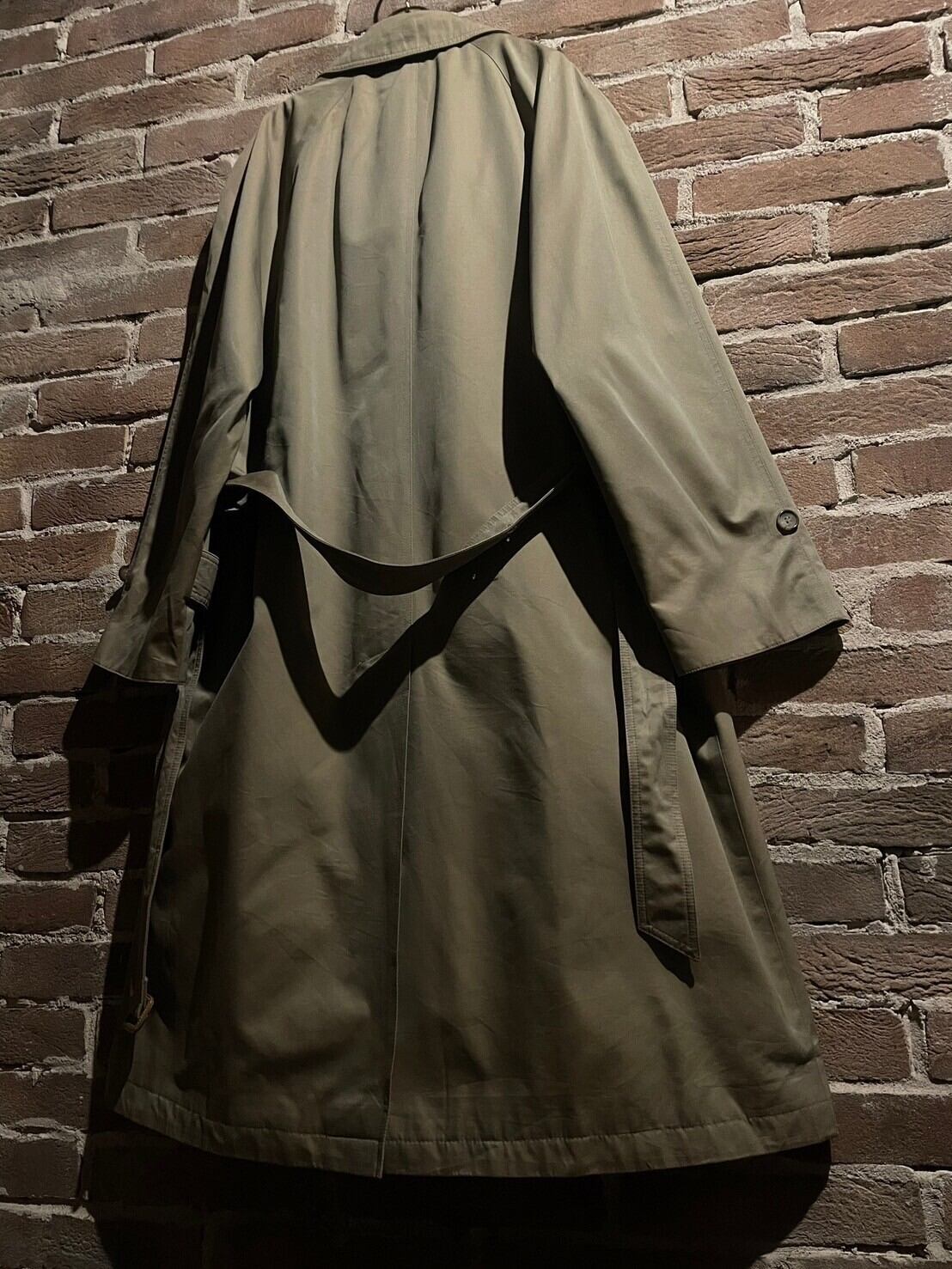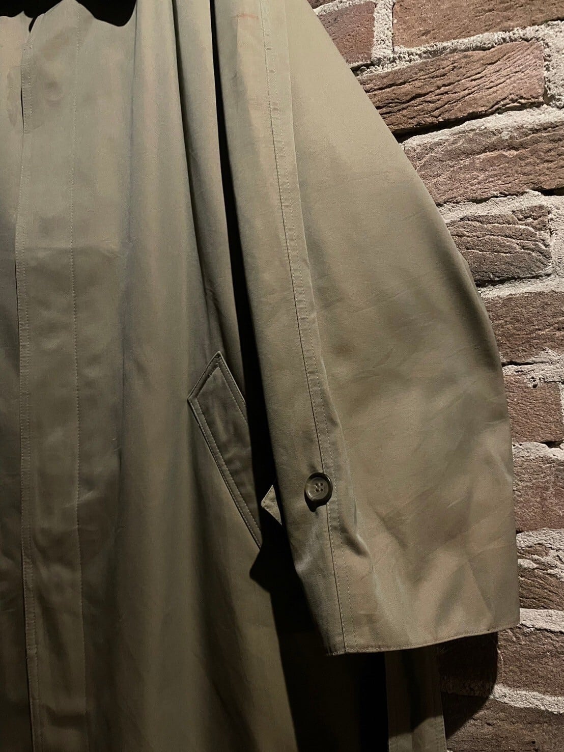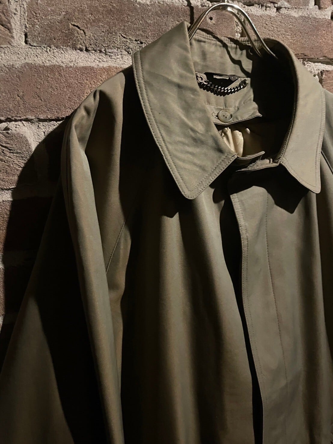 ベージュからグリーンへと角度によって見え方の変わる、美しい"玉虫"カラーで仕上げた80'sヴィンテージのステンカラーコート。